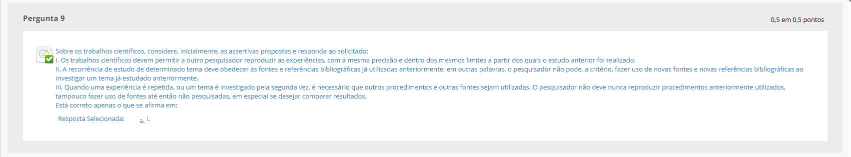 Pergunta 9 0,5 em 0,5 pontos Sobre os trabalhos científicos, considere, inicialmente, as assertivas propostas e responda ao solicitado: I. Os trabalhos científicos devem permitir a outro pesquisador reproduzir as experiências, com a mesma precisão e dentro dos mesmos limites a partir dos quais estudo anterior foi realizado. II. A recorrência de estudo de determinado tema deve obedecer às fontes e referências bibliográficas já utilizadas anteriormente; em outras palavras, 0 pesquisador não pode, a critério, fazer uso de novas fontes e novas referências bibliográficas ao investigar um tema já estudado anteriormente. III. Quando uma experiência é repetida, ou um tema é investigado pela segunda vez, é necessário que outros procedimentos e outras fontes sejam utilizadas. pesquisador não deve nunca reproduzir procedimentos anteriormente utilizados, tampouco fazer uso de fontes até então não pesquisadas, em especial se desejar comparar resultados. Está correto apenas que se afirma em: Resposta Selecionada: