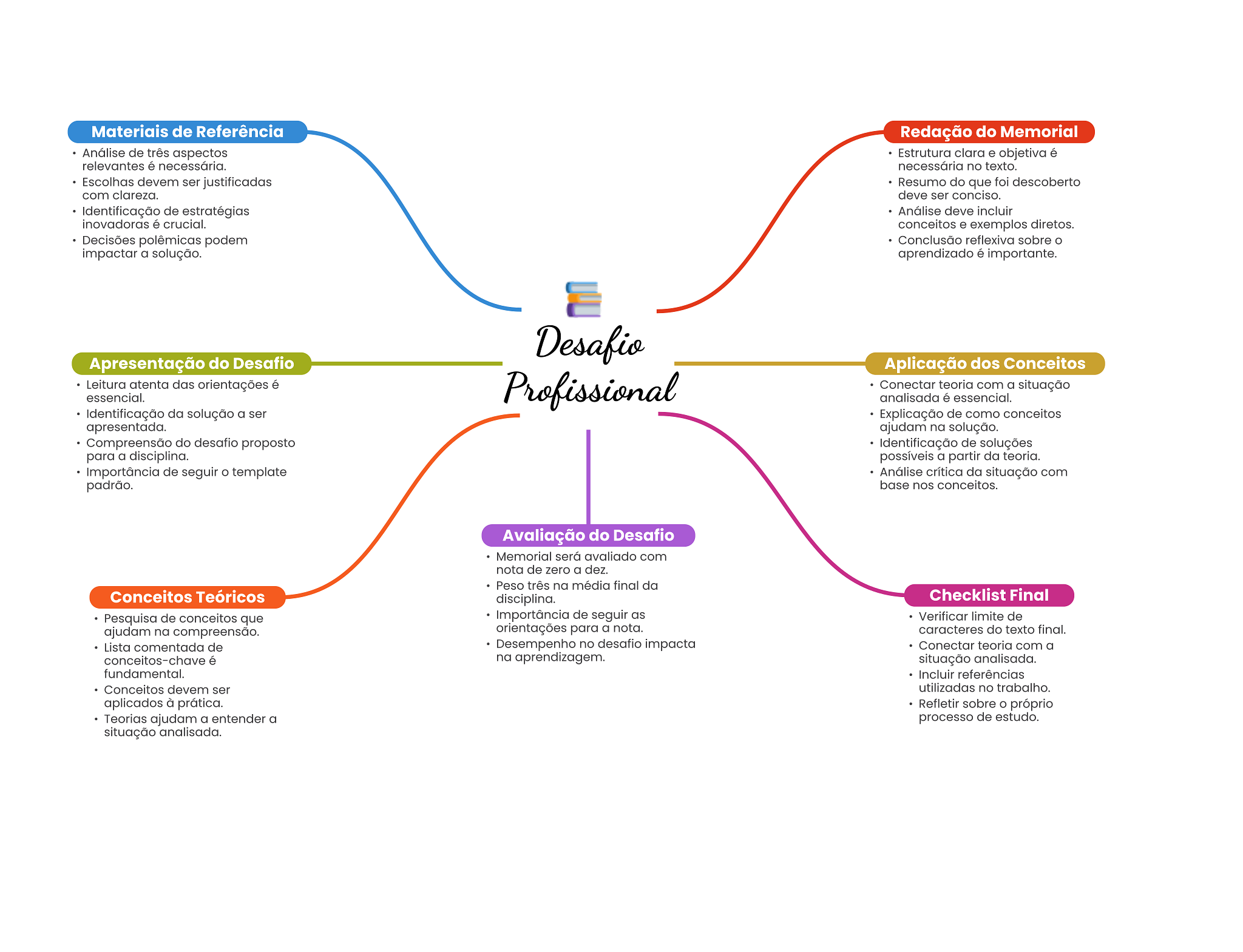 Materiais de Referência Redação do Memorial Análise de três aspectos Estrutura clara e objetiva é relevantes é necessária. necessária no texto. Escolhas devem ser justificadas Resumo do que foi descoberto com clareza. deve ser conciso. Identificação de estratégias Análise deve incluir inovadoras é crucial. conceitos e exemplos diretos. Decisões polêmicas podem Conclusão reflexiva sobre impactar a solução. aprendizado é importante. Desafio Apresentação do Desafio Aplicação dos Conceitos Leitura atenta das orientações é essencial. Profissional Conectar teoria com a situação analisada é essencial. Identificação da solução a ser Explicação de como conceitos apresentada. ajudam na solução. Compreensão do desafio proposto Identificação de soluções para a disciplina. possíveis a partir da teoria. Importância de seguir O template Análise crítica da situação com padrão. base nos conceitos. Avaliação do Desafio Memorial será avaliado com nota de zero a dez. Peso três na média final da Conceitos Teóricos disciplina. Checklist Final Pesquisa de conceitos que Importância de seguir as Verificar limite de ajudam na compreensão. orientações para a nota. caracteres do texto final. Lista comentada de Desempenho no desafio impacta Conectar teoria com a conceitos-chave é na aprendizagem. situação analisada. fundamental. Incluir referências Conceitos devem ser utilizadas no trabalho. aplicados à prática. Refletir sobre próprio Teorias ajudam a entender a processo de estudo. situação analisada.