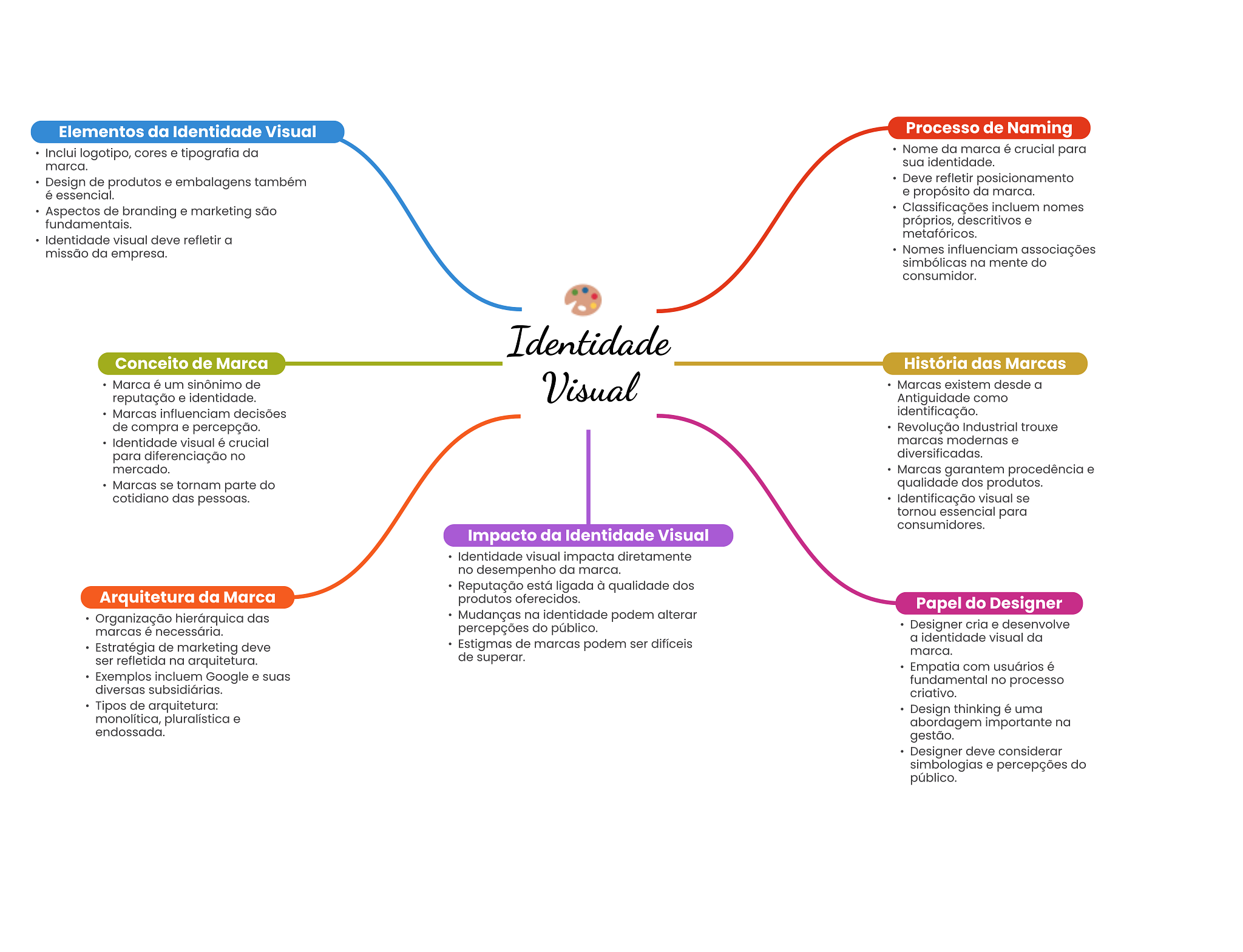 Elementos da Identidade Visual Processo de Naming Inclui logotipo, cores e tipografia da Nome da marca é crucial para marca. sua identidade. Design de produtos e embalagens também Deve refletir posicionamento é essencial. e propósito da marca. Aspectos de branding e marketing são Classificações incluem nomes fundamentais. próprios, descritivos e metafóricos. Identidade visual deve refletir a missão da empresa. Nomes influenciam associações simbólicas na mente do consumidor. Identidade Conceito de Marca História das Marcas Marca é um sinônimo de Visual Marcas existem desde a reputação e identidade. Antiguidade como Marcas influenciam decisões identificação. de compra e percepção. Revolução Industrial trouxe Identidade visual é crucial marcas modernas e para diferenciação no diversificadas. mercado. Marcas garantem procedência e Marcas se tornam parte do qualidade dos produtos. cotidiano das pessoas. Identificação visual se tornou essencial para consumidores. Impacto da Identidade Visual Identidade visual impacta diretamente no desempenho da marca. Reputação está ligada à qualidade dos Arquitetura da Marca produtos oferecidos. Papel do Designer Organização hierárquica das Mudanças na identidade podem alterar marcas é necessária. percepções do público. Designer cria e desenvolve a identidade visual da Estratégia de marketing deve Estigmas de marcas podem ser difíceis marca. ser refletida na arquitetura. de superar. Empatia com usuários é Exemplos incluem Google e suas fundamental no processo diversas subsidiárias. criativo. Tipos de arquitetura: Design thinking é uma monolítica, pluralística e abordagem importante na endossada. gestão. Designer deve considerar simbologias e percepções do público.