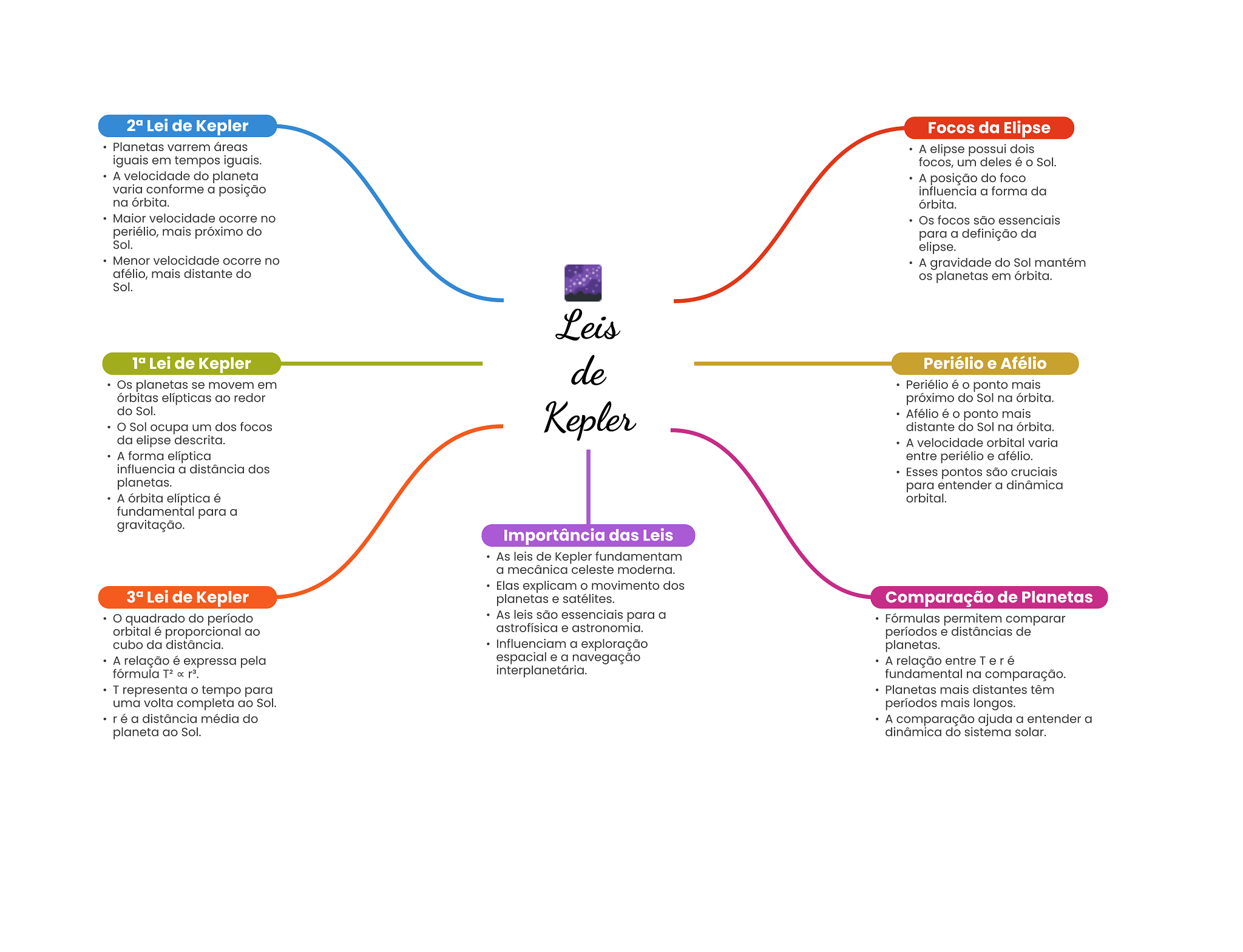 Lei de Kepler Focos da Elipse Planetas varrem áreas A elipse possui dois iguais em tempos iguais. focos, um deles é Sol. A velocidade do planeta A posição do foco varia conforme a posição influencia a forma da na órbita. órbita. Maior velocidade ocorre no Os focos são essenciais periélio, mais próximo do para a definição da Sol. elipse. Menor velocidade ocorre no A gravidade do Sol mantém afélio, mais distante do planetas em órbita. Sol. Leis Lei de Kepler de Periélio e Afélio Os planetas se movem em Periélio é O ponto mais órbitas elípticas ao redor próximo do Sol na órbita. do Sol. Kepler Afélio é O ponto mais Sol ocupa um dos focos distante do Sol na órbita. da elipse descrita. A velocidade orbital varia A forma elíptica entre periélio e afélio. influencia a distância dos Esses pontos são cruciais planetas. para entender a dinâmica A órbita elíptica é orbital. fundamental para a gravitação. Importância das Leis As leis de Kepler fundamentam a mecânica celeste moderna. Elas explicam movimento dos Lei de Kepler planetas e satélites. Comparação de Planetas quadrado do período As leis são essenciais para a Fórmulas permitem comparar orbital é proporcional ao astrofísica e astronomia. períodos e distâncias de cubo da distância. Influenciam a exploração planetas. A relação é expressa pela espacial e a navegação A relação entre T e r é fórmula T2 interplanetária. fundamental na comparação. T representa tempo para Planetas mais distantes têm uma volta completa ao Sol. períodos mais longos. r é a distância média do A comparação ajuda a entender a planeta ao Sol. dinâmica do sistema solar.