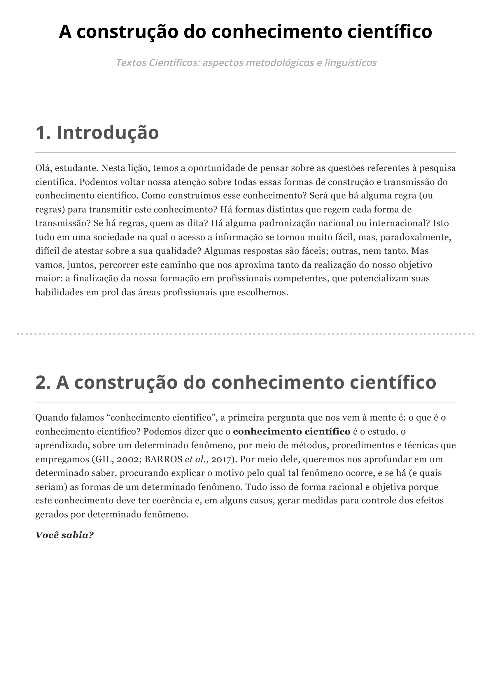 22/05/2023, 11:41 A construção do conhecimento científico https://ceadsaladeaula.uvv.br/conteudo.php?aula=a-construcao-do-conhecimento-cientifico-5&dcp=textos-cientificos-aspectos-metodologicos-e-linguisticos&topico=01 1/13 A construção do conhecimento cientí�co Textos Cientí�cos: aspectos metodológicos e linguísticos 1. Introdução Olá, estudante. Nesta lição, temos a oportunidade de pensar sobre as questões referentes à pesquisa científica. Podemos voltar nossa atenção sobre todas essas formas de construção e transmissão do conhecimento científico. Como construímos esse conhecimento? Será que há alguma regra (ou regras) para transmitir este conhecimento? Há formas distintas que regem cada forma de transmissão? Se há regras, quem as dita? Há alguma padronização nacional ou internacional? Isto tudo em uma sociedade na qual o acesso a informação se tornou muito fácil, mas, paradoxalmente, difícil de atestar sobre a sua qualidade? Algumas respostas são fáceis; outras, nem tanto. Mas vamos, juntos, percorrer este caminho que nos aproxima tanto da realização do nosso objetivo maior: a finalização da nossa formação em profissionais competentes, que potencializam suas habilidades em prol das áreas profissionais que escolhemos. 2. A construção do conhecimento científico Quando falamos “conhecimento científico”, a primeira pergunta que nos vem à mente é: o que é o conhecimento científico? Podemos dizer que o conhecimento científico é o estudo, o aprendizado, sobre um determinado fenômeno, por meio de métodos, procedimentos e técnicas que empregamos (GIL, 2002; BARROS et al., 2017). Por meio dele, queremos nos aprofundar em um determinado saber, procurando explicar o motivo pelo qual tal fenômeno ocorre, e se há (e quais seriam) as formas de um determinado fenômeno. Tudo isso de forma racional e objetiva porque este conhecimento deve ter coerência e, em alguns casos, gerar medidas para controle dos efeitos gerados por determinado fenômeno. Você sabia? 22/05/2023, 11:41 A construção do conhecimento científico https://ceadsaladeaula.uvv.br/conteudo.php?aula=a-construcao-do-conhecimento-cientifico-5&dcp=textos-cientificos-aspectos-metodologicos-e-linguisticos&topico=01 2/13 Quando comparamos o conhecimento científico com o conhecimento popular, verificamos que ambos se utilizam da aplicação de métodos, procedimentos e técnicas, para alcançar um determinado resultado. Porém, no conhecimento científico, há espaço para a crítica de cada uma dessas partes. No conhecimento científico, há a procura pela explicação do motivo pelo qual um fenômeno ocorre, e pela(s) forma(s) na(s) qual(quais) ele se manifesta. Portanto, podemos observar que o conhecimento popular e o científico têm a racionalidade e a objetividade em comum, pois ambos buscam aplicar coerência ao fenômeno observado. Você sabia? O conhecimento científico não é a única forma de conhecimento! Quando avaliamos o material disponível na literatura, verificamos que o conhecimento pode ser apresentado em quatro formas: conhecimento popular, conhecimento filosófico, conhecimento religioso e conhecimento científico. E, antes de fazermos qualquer tipo de julgamento sobre esses outros tipos de conhecimento, é importante ressaltar que, no mínimo, a leitura desses outros tipos de conhecimento pode nos trazer valiosas informações de cunho histórico, político e religioso, que muitas vezes interferiram na construção do conhecimento científico. O conhecimento popular (ou vulgar/senso comum) é baseado nas experiências pessoais aos fenômenos que o ser humano está exposto, sendo transmitido nas suas gerações. Ou seja, conhecimento que é transmitido “de pai pra filho”. Desse modo, esta forma de conhecimento muitas vezes vem carregada de valores morais daquela sociedade; é também subjetiva (ou seja, de acordo com as convicções do indivíduo) e superficial, pois não procura a explicação, a compreensão, dos fenômenos em um conjunto de elementos – concretos ou abstratos – organizados de forma intelectual. Entretanto, não podemos dizer que é uma forma de conhecimento inútil, uma vez que foi por meio desses conhecimentos que vários processos criados pelos seres humanos foram transmitidos e permitiram o sucesso da espécie humana (por exemplo, o planejamento e plantio de vegetais, que antes eram coletados na natureza). 22/05/2023, 11:41 A construção do conhecimento científico https://ceadsaladeaula.uvv.br/conteudo.php?aula=a-construcao-do-conhecimento-cientifico-5&dcp=textos-cientificos-aspectos-metodologicos-e-linguisticos&topico=01 3/13 Uma outra característica que observamos no conhecimento científico é o empirismo, ou seja, é baseado na experiência e na observação. No conhecimento científico, partimos do pressuposto que somente por meio das experiências podemos gerar ideias e conhecimentos. Em outras palavras, nas ciências, as hipóteses (uma suposição/ideia provisória) devem ser comprovadas (ou refutadas/rejeitadas) de acordo com experimentos científicos que são planeados para esse fim. Você sabia? Exemplo de conhecimento popular (método de colheita). O conhecimento filosófico não considera o empirismo porque parte de hipóteses que não têm como serem verificadas experimentalmente. É baseado na razão, questionando a posição do homem frente ao meio em que vive. O conhecimento filosófico é centrado nas ideias que surgem a partir do raciocínio lógico e coerente das situações vividas pelos seres humanos. Assume-se que o conhecimento filosófico antecede a experiência e, portanto, não precisa de experimentação para ser comprovado. https://cead.uvv.br/conteudo/wp-content/uploads/2020/12/Screenshot_27.png https://cead.uvv.br/conteudo/wp-content/uploads/2020/12/Screenshot_28.png 22/05/2023, 11:41 A construção do conhecimento científico https://ceadsaladeaula.uvv.br/conteudo.php?aula=a-construcao-d