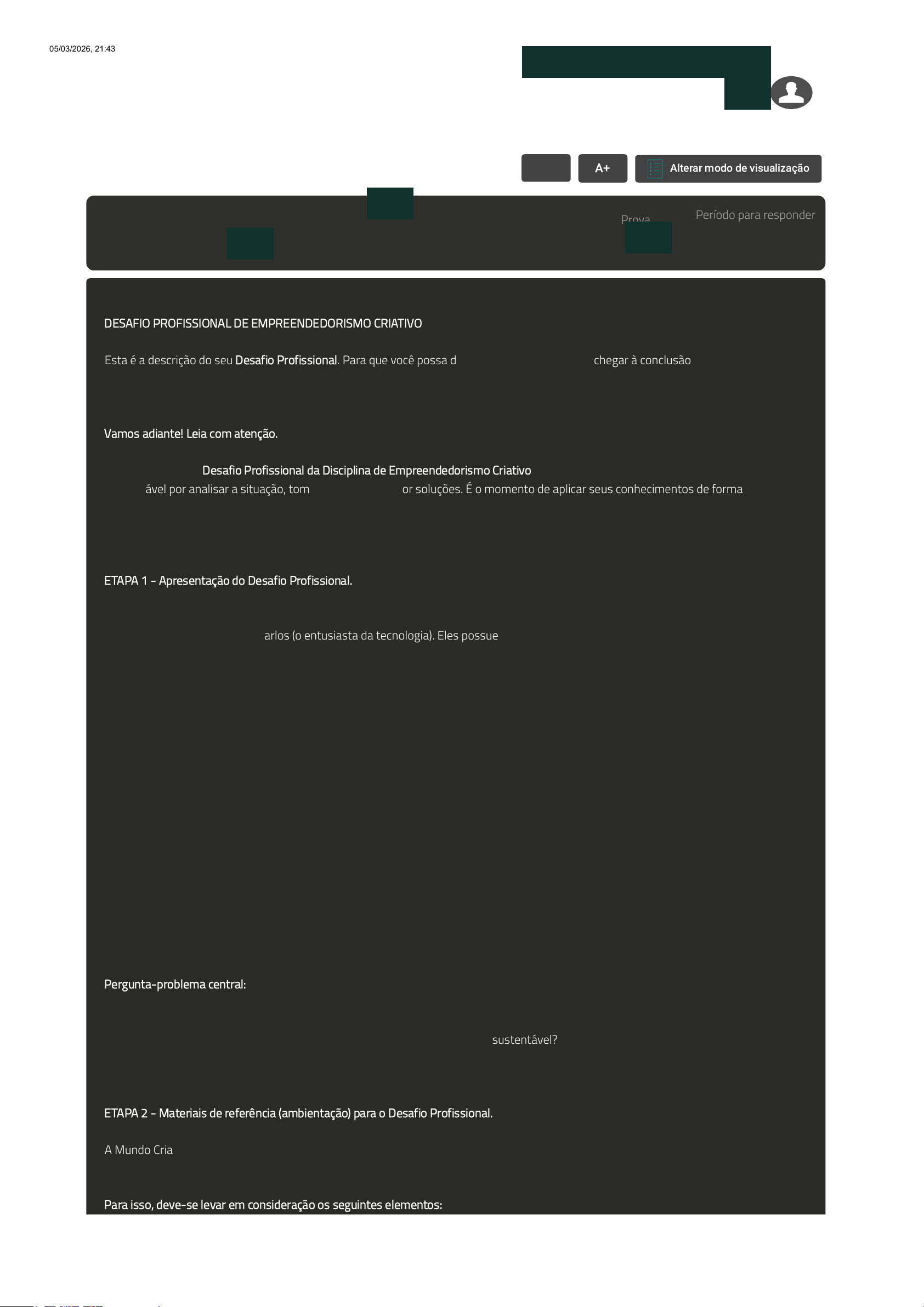 RESPONDER AVALIAÇÃO Avaliação III - Desafio Profissional - Individual (Cod.:1598718) Empreendedorismo Criativo (159474) Prova 113626147 Período para responder 09/02/2026 - 07/03/2026 Questão 1 DESAFIO PROFISSIONAL DE EMPREENDEDORISMO CRIATIVO Esta é a descrição do seu Desafio Profissional. Para que você possa desenvolver sua atividade e chegar à conclusão desta avaliação, é preciso baixar e salvar o Template Padrão Único em Word que está disponível no link ao final desta descrição. Para baixá-lo, clique em Arquivo > Criar uma cópia > Baixar uma cópia. Você só conseguirá editar o template depois de salvá-lo. Vamos adiante! Leia com atenção. Seja bem-vindo ao Desafio Profissional da Disciplina de Empreendedorismo Criativo. Aqui, você assume o papel de profissional responsável por analisar a situação, tomar decisões e propor soluções. É o momento de aplicar seus conhecimentos de forma prática e mostrar como lidaria com um desafio real. ETAPA 1 - Apresentação do Desafio Profissional. A Mundo Criativo é uma agência de comunicação recém-criada, fundada por três amigos recém-formados: Alice (a designer visionária), Bruno (o storyteller criativo) e Carlos (o entusiasta da tecnologia). Eles possuem um mindset empreendedor focado na criatividade e na inovação, mas começaram com pouquíssimos recursos. O grande projeto da equipe é desenvolver uma série de conteúdo digital interativo para pequenos negócios locais (padarias, salões de beleza, academias), focada em mídias sociais. A ideia é inovadora, com potencial para revolucionar a forma como esses negócios se comunicam, transformando o "pouco" em muito. No entanto, eles enfrentam dois grandes desafios: Concorrência e validação: a ideia ainda não foi totalmente validada no mercado. Eles hesitam em investir o pouco dinheiro que têm, temendo o risco, especialmente porque o mercado já possui agências consolidadas (a concorrência local). Recursos e gestão: Alice e Bruno são excelentes em criar, mas têm dificuldade em estruturar o plano de negócio, gerir o tempo e calcular os riscos. Eles estão focados apenas em "fazer o produto criativo", mas não em estruturar o planejamento e a gestão. A motivação inicial está diminuindo por falta de resultados rápidos. A Missão: a equipe precisa de uma estratégia de Empreendedorismo Criativo que utilize a criatividade não só no produto, mas na gestão e na validação para alavancar o negócio com recursos quase nulos. Pergunta-problema central: Como a equipe da Mundo Criativo pode aplicar a criatividade e as ferramentas de validação de ideias para superar a limitação de recursos financeiros, diferenciar-se da concorrência e garantir um modelo de negócio sustentável? ETAPA 2 - Materiais de referência (ambientação) para o Desafio Profissional. A Mundo Criativo possui nas mãos um serviço competitivo, fomentar a comunicação de suas empresas-cliente. Cabe aos gestores da Mundo Criativo estruturar a seguinte estratégia: Estruturação do Plano de Negócios. Para isso, deve-se levar em consideração os seguintes elementos: VOLTAR Imprimir, Avaliação A+ Aumentar, Fonte Alterar modo de visualização Leandro Garcia da Silva Gestão de Investimentos e Mercado Financeiro (14264886) 05/03/2026, 21:43 AVA https://ava2.uniasselvi.com.br/subject/grades-and-tests/answer/eyJ0ZXN0Ijp7InRlc3RDb2RlIjoiMTU5ODcxOCIsImRlc2NyaXB0aW9uIjoiQXZhbGlhw6fDo28gSUlJIC0gRGVzYWZpbyBQcm9maXNzaW9uYWwgLSBJb… 1/3 1. Resumo do Negócio: O que é o negócio? Qual problema resolve? Proposta de valor. Público-alvo. 2. Produtos ou Serviços: O que será oferecido? Principais diferenciais. 3. Análise de Mercado: Tamanho e características do público. Concorrentes principais. Oportunidades identificadas. 4. Estratégia de Marketing: Como atrair clientes? Canais de venda (on-line/off-line). Política de preços. 5. Operações: Local e estrutura necessária. Processos básicos de funcionamento. Fornecedores essenciais. 6. Equipe: Quem trabalhará no negócio? Funções principais. 7. Plano Financeiro: Investimento inicial. Custos fixos e variáveis. Projeção de faturamento. 8. Riscos e Estratégias de Mitigação: Principais riscos. Ações para minimizar seus impactos. Livro da Disciplina: Gestão de Investimentos e Mercado Financeiro (14264886) AVA 2/3 ZUCCO, A. et al. Empreendedorismo criativo. Florianópolis: Arqué, 2023. Artigo Científico: Plano de negócios: agência de marketing digital, de Lorena Vaz Gomes: https://repositorio.ufu.br/handle/123456789/45357 Vídeo: https://www.youtube.com/watch?v=Xr9TI-Fz0TQ ETAPA 3 - Levantamento de conceitos teóricos (preencher no Template Padrão Único). ETAPA 4 - Aplicação dos conceitos teóricos ao Desafio Profissional (preencher no Template Padrão Único). ETAPA 5 - ETAPA AVALIATIVA - Redação do produto - Memorial Analítico (preencher no Template Padrão Único e, após a finalização, copiar e colar no campo de resposta a seguir). Chegou a hora de transformar todo o seu percurso investigativo em um texto claro, bem estruturado e objetivo. Você deverá desenvolver um Memorial Analítico. Ele será o produto final do Desafio Profissional, que será avaliado com nota de zero a dez e terá peso três na média final da disciplina de Empreendedorismo Criativo. Lembre-se: para baixar o Template Padrão Único do Desafio Profissional, clique no link a seguir, e siga o passo a passo: clique em Arquivo > Criar uma cópia > Baixar uma cópia. Você só conseguirá editar o template depois de salvá-lo. Bons estudos! ZUCCO, A. et al. Empreendedorismo criativo. Florianópolis: Arqué, 2023. Template Padrão Único Para finalizar a avaliação é necessário responder todas as questões. 0 de 6000 caracteres Informe a resposta aqui... Atenção, o campo abaixo é reservado para o anexo de sua resposta! Solte arquivos aqui, cole ou navegue Salvar Finalizar Gestão de Investimentos e Mercado Financeiro (12257886