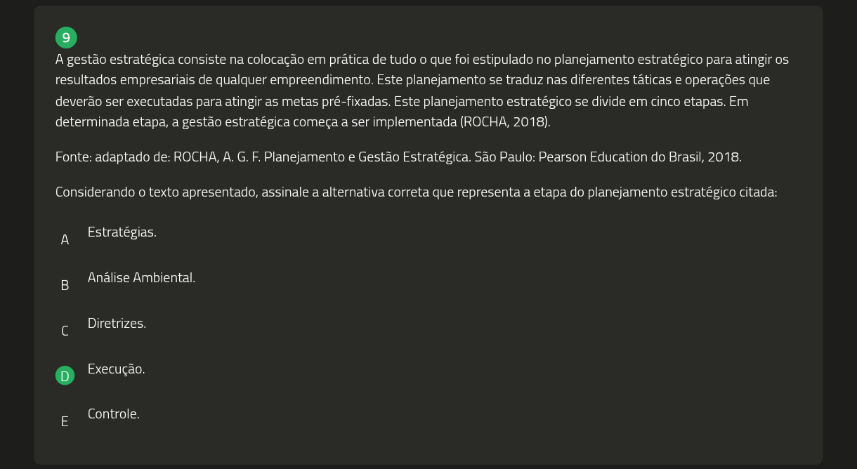 9 A gestão estratégica consiste na colocação em prática de tudo 0 que foi estipulado no planejamento estratégico para atingir resultados empresariais de qualquer empreendimento. Este planejamento se traduz nas diferentes táticas e operações que deverão ser executadas para atingir as metas pré-fixadas. Este planejamento estratégico se divide em cinco etapas. Em determinada etapa, a gestão estratégica começa a ser implementada (ROCHA, 2018). Fonte: adaptado de: ROCHA, A. G.F. Planejamento e Gestão Estratégica. São Paulo: Pearson Education do Brasil, 2018. Considerando texto apresentado, assinale a alternativa correta que representa a etapa do planejamento estratégico citada: A Estratégias. Análise Ambiental. Diretrizes. D Execução. Controle. E