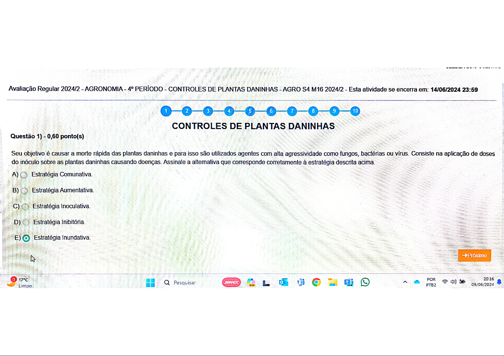 Avaliação Regular 2024/2 AGRONOMIA PERÍODO CONTROLES DE PLANTAS DANINHAS AGRO S4 M16 2024/2 Esta atividade se encerra em: 14/06/2024 23:59 1 2 3 4 5 6 7 8 9 10 CONTROLES DE PLANTAS DANINHAS Questão 1) 0,60 ponto(s) Seu objetivo é causar a morte rápida das plantas daninhas e para isso são utilizados agentes com alta agressividade como fungos, bactérias ou vírus. Consiste na aplicação de doses do inóculo sobre as plantas daninhas causando doenças. Assinale a alternativa que corresponde corretamente à estratégia descrita acima. A) Estratégia Comunativa. B) Estratégia Aumentativa. C) Estratégia Inoculativa. D) Estratégia Inibitória. E) Estratégia Inundativa. Próximo 1 17°C POR 20:16 Pesquisar Limpo PRE PTB2 09/06/2024DE Questão 2) 0,60 ponto(s) Plantas daninhas se adaptam com facilidade aos ambientes criados pelo homem. Sobre as características que permitem a sobrevivência e a reprodução das plantas daninhas em ambientes que apresentam limitações, assinale V para as alternativas verdadeiras e F para as faltas. Quando comparadas às plantas cultivadas, as plantas daninhas se sobressaem na obtenção de recursos. Plantas daninhas se propagam apenas por via vegetativa, pois assim a multiplicação é mais rápida e a infestação mais eficiente. ( ) Com a dormência das sementes, a germinação é distribuída ao longo do tempo, dificultando 0 controle das plantas daninhas. As sementes de todas as espécies de plantas daninhas germinam apenas quando em profundidades menores de 10 cm. A) F,F,V,V. B) V,F,V,F. C) V,F,F,V. D) F,V,V,F. E) 1 17°C POR 20:17 Pesquisar T Limpo PRE PTB2 09/06/2024Questão 3) 0,60 ponto(s) Existem vários métodos desenvolvidos para superar a dormência de sementes, e emprego de cada um deles depende do tipo de dormência a ser quebrada. Sobre os princip: métodos para quebra de dormência, assinale a alternativa correta. I - A escarificação mecânica é geralmente aplicada em sementes duras. - A lavagem em água corrente é geralmente aplicada em sementes que possuem substâncias inibidoras presentes no embrião. III A estratificação consiste em imergir as sementes em ácido sulfúrico por alguns minutos a fim de romper 0 tegumento. IV Produtos químicos como ácido giberélico podem ser usados para estimular a germinação. A) Somente as afirmativas e III estão corretas. B) Todas as afirmativas estão corretas. C) Somente a afirmativa II está correta. D) Somente as afirmativas e IV estão corretas. E) Somente as afirmativas e estão corretas. Próximo 1 POR 20:17 17°C Q Pesquisar Limpo PRE PTB2 09/06/2024CONTROLES DE PLANTAS DANINHAS Questão 4) 0,60 ponto(s) Plantas consideradas daninhas em algumas circunstâncias podem ser úteis em outras. Assinale a alternativa correta sobre OS aspectos positivos das plantas daninhas. I. As plantas daninhas podem melhorar a estrutura do solo reduzindo a erosão. II. As plantas daninhas apresentam mais benefícios do que malefícios nas áreas infestadas. III. As plantas daninhas podem ser utilizadas para produção de fármacos. IV. As plantas daninhas podem ser utilizadas na alimentação humana. A) Somente as afirmativas I, III e IV estão corretas. B) Somente as afirmativas e III estão corretas. C) Todas as afirmativas estão corretas. D) Somente as afirmativas e estão corretas. E) Somente a afirmativa II está correta. Anterior 1 17°C POR 20 Pesquisar Limpo PRE PTB2Avaliação Regular 2024/2 AGRONOMIA 4° PERÍODO CONTROLES DE PLANTAS DANINHAS AGRO S4 M16 2024/2 Esta atividade se encerra em: 14/06/2024 23:59 1 2 3 4 5 6 7 8 9 10 CONTROLES DE PLANTAS DANINHAS Questão 5) - 0,60 ponto(s) Cada banco de sementes no solo pode diferir em relação à sua composição e densidade das sementes, pode apresentar desde poucas até milhares de sementes por metro quadrado. Assinale a alternativa que corresponde aos métodos utilizados para estimar banco de sementes do solo de uma determinada área. A) 0 método mais utilizado é a contagem de sementes presentes na superfície do solo do campo sem realizar a identificação das espécies. B) Pode ser determinado avaliando as espécies daninhas instaladas na área e seu potencial de produção de propágulos. C) Pode ser determinado pela constante de Cow. D) 0 método mais comum utilizado é a identificação das sementes no solo através de ondas sonoras. E) Pode ser determinado pelo número total de sementes contadas de uma amostra de solo ou pelo número de sementes germináveis em um determinado volume de solo. Próximo 1 17°C Pesquisar BRANDT T POR 20:18 Limpo PRE PTB2 09/06/2024DE DANINHAS Questão 6) 0,60 ponto(s) Uma medida de manejo de plantas daninhas que vem crescendo nos últimos anos, principalmente para utilização na agricultura orgânica, é controle biológico. Sobre controle biológico assinale V para as sentenças verdadeiras e F para as falsas. objetivo do controle biológico é a redução da densidade da população de plantas daninhas a um nível que não causaria danos econômicos. É um método bastante específico, por isso seu uso é limitado. Os organismos (agentes biológicos) utilizados no controle são seletivos para determinadas espécies. ( ) Geralmente, um determinado organismo selecionado para ser agente biológico controla todas as espécies de plantas daninhas de uma área. A) F,F,V,V. B) V,V,V,F. C) F,V,F,V. D) F,V,V,F. E) V,F,F,V. Próximo 1 17°C POR 20:18 Pesquisar Limpo PTB2 09/06/2024DE PLAN IAS Questão 7) 0,60 ponto(s) É importante considerar a ação dos bio-herbicidas em espécies não alvo, sendo necessários testes de a fim de avaliar seu espectro de ação. Sobre as características que podem influenciar a infecção das plantas pelo patógeno que se espera realizar controle, assinale V para as sentenças verdadeiras e F para as falsas. ( ) As condições ambientais podem influenciar a infecção pelo patógeno. A idade dos tecidos que serão infectados pode influenciar a infecção pelo patógeno. es
