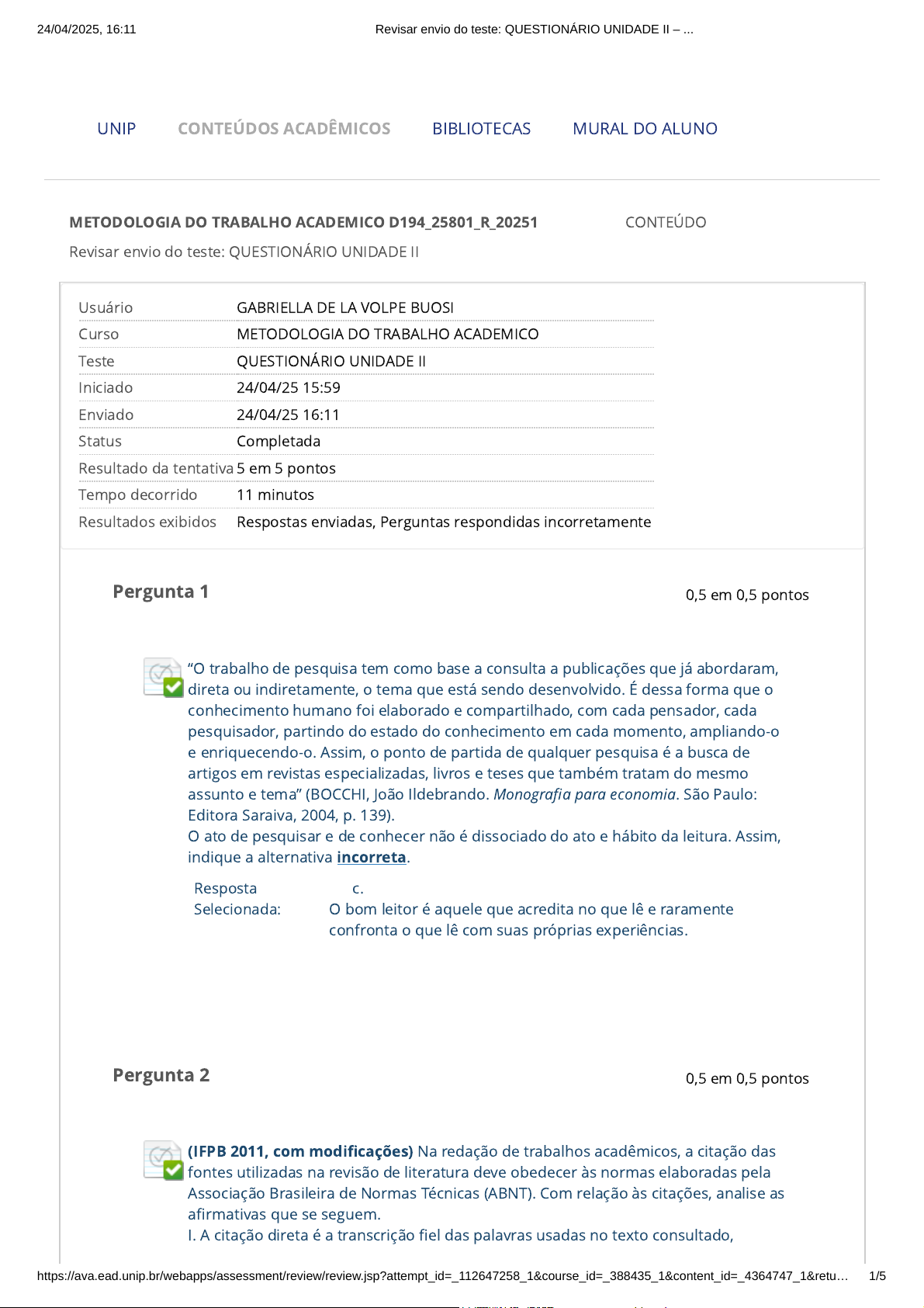 Revisar envio do teste: QUESTIONÁRIO UNIDADE II METODOLOGIA DO TRABALHO ACADEMICO D194_25801_R_20251 CONTEÚDO Usuário GABRIELLA DE LA VOLPE BUOSI Curso METODOLOGIA DO TRABALHO ACADEMICO Teste QUESTIONÁRIO UNIDADE II Iniciado 24/04/25 15:59 Enviado 24/04/25 16:11 Status Completada Resultado da tentativa 5 em 5 pontos Tempo decorrido 11 minutos Resultados exibidos Respostas enviadas, Perguntas respondidas incorretamente Pergunta 1 Resposta Selecionada: c. “O trabalho de pesquisa tem como base a consulta a publicações que já abordaram, direta ou indiretamente, o tema que está sendo desenvolvido. É dessa forma que o conhecimento humano foi elaborado e compartilhado, com cada pensador, cada pesquisador, partindo do estado do conhecimento em cada momento, ampliando-o e enriquecendo-o. Assim, o ponto de partida de qualquer pesquisa é a busca de artigos em revistas especializadas, livros e teses que também tratam do mesmo assunto e tema” (BOCCHI, João Ildebrando. Monografia para economia. São Paulo: Editora Saraiva, 2004, p. 139). O ato de pesquisar e de conhecer não é dissociado do ato e hábito da leitura. Assim, indique a alternativa incorreta. O bom leitor é aquele que acredita no que lê e raramente confronta o que lê com suas próprias experiências. Pergunta 2 (IFPB 2011, com modificações) Na redação de trabalhos acadêmicos, a citação das fontes utilizadas na revisão de literatura deve obedecer às normas elaboradas pela Associação Brasileira de Normas Técnicas (ABNT). Com relação às citações, analise as afirmativas que se seguem. I. A citação direta é a transcrição fiel das palavras usadas no texto consultado, UNIP BIBLIOTECAS MURAL DO ALUNOCONTEÚDOS ACADÊMICOS 0,5 em 0,5 pontos 0,5 em 0,5 pontos 24/04/2025, 16:11 Revisar envio do teste: QUESTIONÁRIO UNIDADE II – ... https://ava.ead.unip.br/webapps/assessment/review/review.jsp?attempt_id=_112647258_1&course_id=_388435_1&content_id=_4364747_1&retu… 1/5 http://company.blackboard.com/ https://ava.ead.unip.br/webapps/blackboard/execute/courseMain?course_id=_388435_1 https://ava.ead.unip.br/webapps/blackboard/content/listContent.jsp?course_id=_388435_1&content_id=_4355054_1&mode=reset https://ava.ead.unip.br/webapps/portal/execute/tabs/tabAction?tab_tab_group_id=_49_1 https://ava.ead.unip.br/webapps/portal/execute/tabs/tabAction?tab_tab_group_id=_27_1 https://ava.ead.unip.br/webapps/portal/execute/tabs/tabAction?tab_tab_group_id=_47_1 https://ava.ead.unip.br/webapps/portal/execute/tabs/tabAction?tab_tab_group_id=_25_1 https://ava.ead.unip.br/webapps/login/?action=logout Resposta Selecionada: b. portanto, sem alteração por parte de quem elabora o trabalho acadêmico. II. A citação direta com mais de três linhas deve ser usada com recuo de 2 cm da margem esquerda, com aspas e com fonte igual a do texto. III. A citação direta com até três linhas deve ser usada no texto corrido, entre aspas e com a mesma fonte do texto. Estão corretas apenas as afirmativas: I e III apenas. Pergunta 3 Resposta Selecionada: c. A respeito da prática de plágio acadêmico, considere as afirmativas a seguir. I. O plágio acadêmico envolve toda citação literal de texto de outros autores, independentemente de esses autores estarem ou não referenciados no trabalho do aluno. II. O plágio acadêmico envolve apenas o uso de ideias de outros autores, mesmo que referenciadas. III. O plágio acadêmico envolve a ausência de referência ao texto e à ideia de outro autor. Está correto apenas o que se afirma em: III. Pergunta 4 Resposta Selecionada: a. Com relação à intertextualidade no texto acadêmico, considere as afirmativas a seguir: I. As citações diretas são trechos escritos por outros autores e que são utilizados integralmente, palavra por palavra, pelo aluno. II. As citações indiretas são realizadas quando o aluno pretende melhorar o texto de outro autor, introduzindo ideias e palavras novas. III. As citações indiretas devem sempre fazer uso de aspas, para que fique claro que as ideias ali citadas não são da autoria do aluno. Está correto apenas o que se afirma em: I. Pergunta 5 0,5 em 0,5 pontos 0,5 em 0,5 pontos 0,5 em 0,5 pontos 24/04/2025, 16:11 Revisar envio do teste: QUESTIONÁRIO UNIDADE II – ... https://ava.ead.unip.br/webapps/assessment/review/review.jsp?attempt_id=_112647258_1&course_id=_388435_1&content_id=_4364747_1&retu… 2/5 Resposta Selecionada: a. Conforme João Ildebrando Bocchi (Monografia para economia. São Paulo: Editora Saraiva, 2004), “método designa um caminho pelo qual se obtém certo resultado. Pode designar também um conjunto de procedimentos e de regras utilizadas para atingir um objetivo desejado”. (p. 54). Se o objetivo for o de efetuar a redação de um texto acadêmico: I. É preciso expressar-se, necessariamente, de forma racional e lógica. II. É imprescindível a realização de um rascunho para, apenas depois das correções e reflexões, elaborar o texto final. III. Na falta de palavras para expressar a lógica da comunicação, devem ser utilizadas ilustrações como substituição ao texto. Está correto apenas o que se afirma em: I e II. Pergunta 6 Resposta Selecionada: a. Considerando as condições do fazer científico, é importante lembrar que: A curiosidade faz parte da pesquisa, pois estimula o olhar crítico sobre a realidade e a elaboração de perguntas sobre o mundo que nos cerca. Pergunta 7 Leia o trecho de João Baptista de Almeida Júnior, “O estudo como forma de pesquisa” (in CARVALHO, Maria Cecília M. Metodologia científica: fundamentos e técnicas. Campinas: Editora Papirus, 2000). “Para se iniciar nos estudos superiores e obter um reconhecimento acadêmico, o estudante deve estudar primeiro como aprender. Isto porque as mudanças ocorridas recentemente na sociedade e nas formas de relacionamento humano geraram novas necessidades para as quais a educação é solicitada a atender. [...] Dentro dessa perspectiva educa