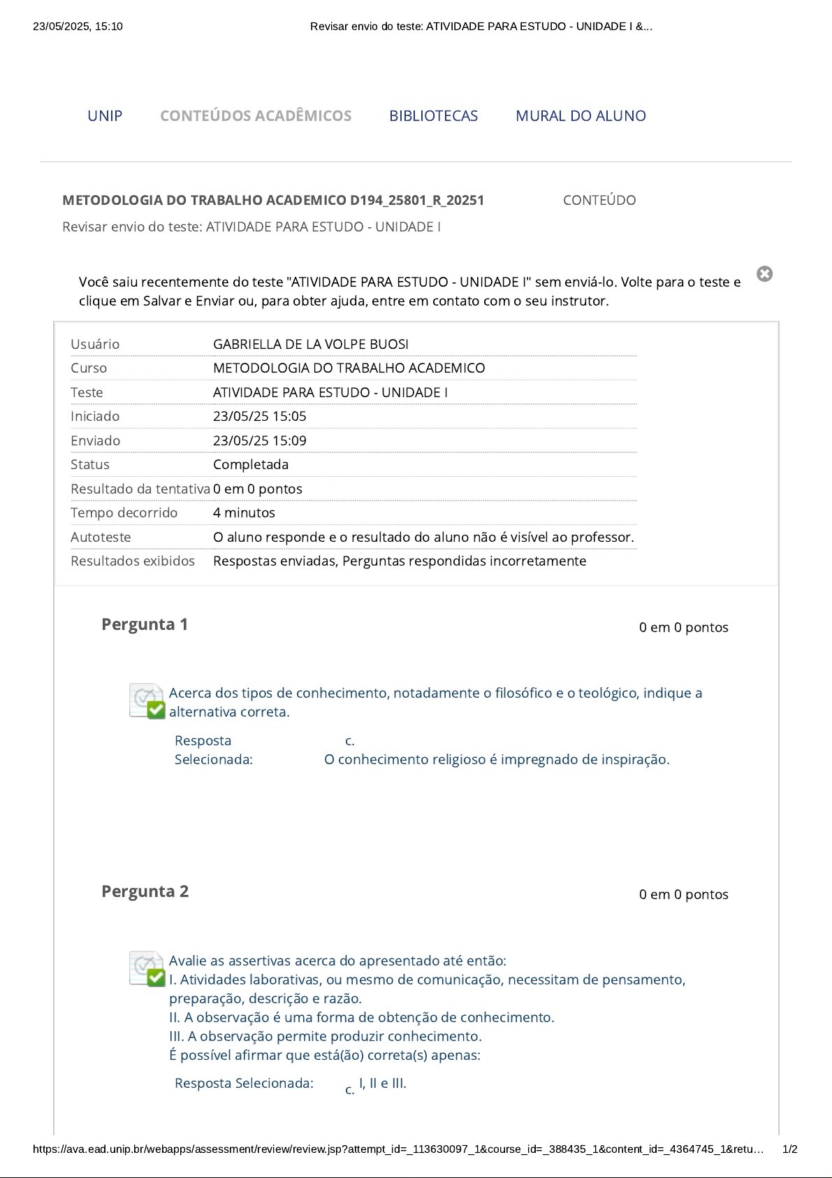 Revisar envio do teste: ATIVIDADE PARA ESTUDO - UNIDADE I METODOLOGIA DO TRABALHO ACADEMICO D194_25801_R_20251 CONTEÚDO Você saiu recentemente do teste "ATIVIDADE PARA ESTUDO - UNIDADE I" sem enviá-lo. Volte para o teste e clique em Salvar e Enviar ou, para obter ajuda, entre em contato com o seu instrutor. X Usuário GABRIELLA DE LA VOLPE BUOSI Curso METODOLOGIA DO TRABALHO ACADEMICO Teste ATIVIDADE PARA ESTUDO - UNIDADE I Iniciado 23/05/25 15:05 Enviado 23/05/25 15:09 Status Completada Resultado da tentativa 0 em 0 pontos Tempo decorrido 4 minutos Autoteste O aluno responde e o resultado do aluno não é visível ao professor. Resultados exibidos Respostas enviadas, Perguntas respondidas incorretamente Pergunta 1 Resposta Selecionada: c. Acerca dos tipos de conhecimento, notadamente o filosófico e o teológico, indique a alternativa correta. O conhecimento religioso é impregnado de inspiração. Pergunta 2 Resposta Selecionada: c. Avalie as assertivas acerca do apresentado até então: I. Atividades laborativas, ou mesmo de comunicação, necessitam de pensamento, preparação, descrição e razão. II. A observação é uma forma de obtenção de conhecimento. III. A observação permite produzir conhecimento. É possível afirmar que está(ão) correta(s) apenas: I, II e III. UNIP BIBLIOTECAS MURAL DO ALUNOCONTEÚDOS ACADÊMICOS 0 em 0 pontos 0 em 0 pontos 23/05/2025, 15:10 Revisar envio do teste: ATIVIDADE PARA ESTUDO - UNIDADE I &... https://ava.ead.unip.br/webapps/assessment/review/review.jsp?attempt_id=_113630097_1&course_id=_388435_1&content_id=_4364745_1&retu… 1/2 http://company.blackboard.com/ https://ava.ead.unip.br/webapps/blackboard/execute/courseMain?course_id=_388435_1 https://ava.ead.unip.br/webapps/blackboard/content/listContent.jsp?course_id=_388435_1&content_id=_4355054_1&mode=reset https://ava.ead.unip.br/webapps/portal/execute/tabs/tabAction?tab_tab_group_id=_49_1 https://ava.ead.unip.br/webapps/portal/execute/tabs/tabAction?tab_tab_group_id=_27_1 https://ava.ead.unip.br/webapps/portal/execute/tabs/tabAction?tab_tab_group_id=_47_1 https://ava.ead.unip.br/webapps/portal/execute/tabs/tabAction?tab_tab_group_id=_25_1 https://ava.ead.unip.br/webapps/login/?action=logout Sexta-feira, 23 de Maio de 2025 15h10min08s GMT-03:00 Pergunta 3 Resposta Selecionada: d. Do que foi apresentado nesta aula, é possível afirmar que: I. A metodologia estuda o modo como as ciências se desenvolvem. II. A curiosidade representa papel significativo para o desenvolvimento da ciência. III. A ciência se apresenta como uma forma uniforme de achar alguma razão na observação dos fatos. É possível afirmar que está(ão) correta(s) apenas: I, II e III. Pergunta 4 Resposta Selecionada: d. Leia as afirmativas e responda o solicitado. I. O desenvolvimento do processo científico altera o senso comum. II. O senso comum pode ser alterado pelo desenvolvimento do processo científico, desde que tenha acesso a ele. III. O desenvolvimento científico tem na curiosidade uma de suas molas propulsoras. É possível afirmar que está(ão) correta(s) apenas. II e III. ← OK 0 em 0 pontos 0 em 0 pontos 23/05/2025, 15:10 Revisar envio do teste: ATIVIDADE PARA ESTUDO - UNIDADE I &... https://ava.ead.unip.br/webapps/assessment/review/review.jsp?attempt_id=_113630097_1&course_id=_388435_1&content_id=_4364745_1&retu… 2/2