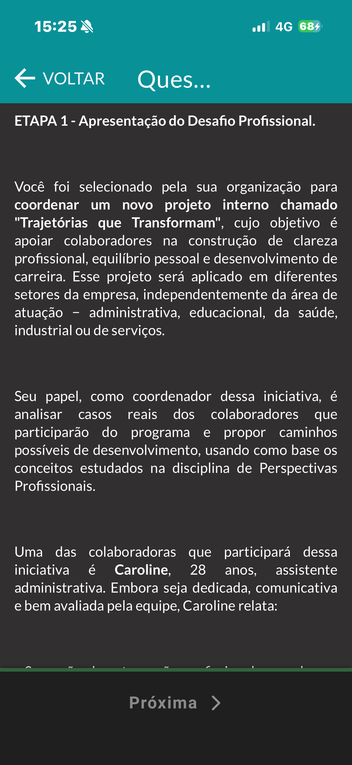 15:25 4G 684 VOLTAR Ques... ETAPA 1 - Apresentação do Desafio Profissional. Você foi selecionado pela sua organização para coordenar um novo projeto interno chamado "Trajetórias que Transformam", cujo objetivo é apoiar colaboradores na construção de clareza profissional, equilíbrio pessoal e desenvolvimento de carreira. Esse projeto será aplicado em diferentes setores da empresa, independentemente da área de atuação - administrativa, educacional, da saúde, industrial ou de serviços. Seu papel, como coordenador dessa iniciativa, é analisar casos reais dos colaboradores que participarão do programa e propor caminhos possíveis de desenvolvimento, usando como base os conceitos estudados na disciplina de Perspectivas Profissionais. Uma das colaboradoras que participará dessa iniciativa é Caroline, 28 anos, assistente administrativa. Embora seja dedicada, comunicativa e bem avaliada pela equipe, Caroline relata: Próxima >
