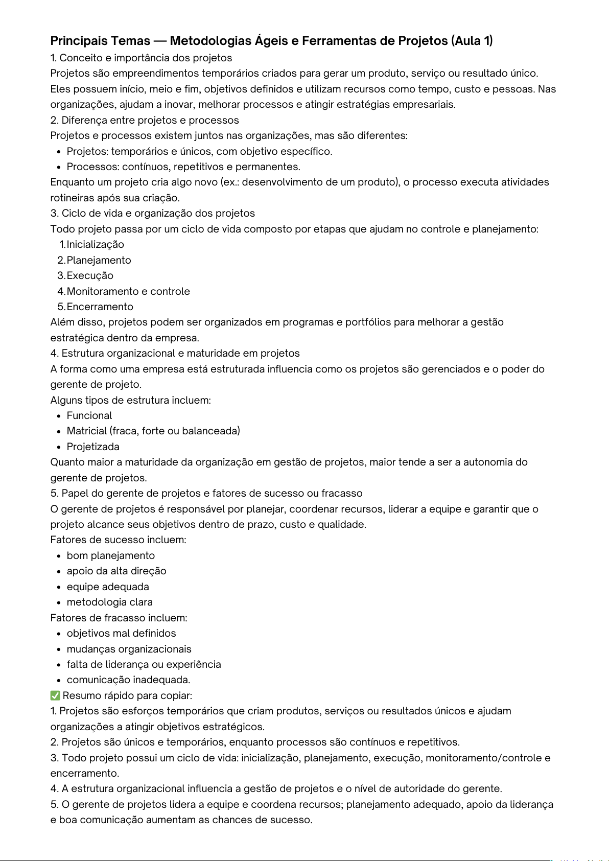 Principais Temas — Metodologias Ágeis e Ferramentas de Projetos (Aula 1) 1. Conceito e importância dos projetos Projetos são empreendimentos temporários criados para gerar um produto, serviço ou resultado único. Eles possuem início, meio e fim, objetivos definidos e utilizam recursos como tempo, custo e pessoas. Nas organizações, ajudam a inovar, melhorar processos e atingir estratégias empresariais. 2. Diferença entre projetos e processos Projetos e processos existem juntos nas organizações, mas são diferentes: Projetos: temporários e únicos, com objetivo específico. Processos: contínuos, repetitivos e permanentes. Enquanto um projeto cria algo novo (ex.: desenvolvimento de um produto), o processo executa atividades rotineiras após sua criação. 3. Ciclo de vida e organização dos projetos Todo projeto passa por um ciclo de vida composto por etapas que ajudam no controle e planejamento: 1. Inicialização 2.Planejamento 3.Execução 4.Monitoramento e controle 5.Encerramento Além disso, projetos podem ser organizados em programas e portfólios para melhorar a gestão estratégica dentro da empresa. 4. Estrutura organizacional e maturidade em projetos A forma como uma empresa está estruturada influencia como os projetos são gerenciados e o poder do gerente de projeto. Alguns tipos de estrutura incluem: Funcional Matricial (fraca, forte ou balanceada) Projetizada Quanto maior a maturidade da organização em gestão de projetos, maior tende a ser a autonomia do gerente de projetos. 5. Papel do gerente de projetos e fatores de sucesso ou fracasso O gerente de projetos é responsável por planejar, coordenar recursos, liderar a equipe e garantir que o projeto alcance seus objetivos dentro de prazo, custo e qualidade. Fatores de sucesso incluem: bom planejamento apoio da alta direção equipe adequada metodologia clara Fatores de fracasso incluem: objetivos mal definidos mudanças organizacionais falta de liderança ou experiência comunicação inadequada. ✅ Resumo rápido para copiar: 1. Projetos são esforços temporários que criam produtos, serviços ou resultados únicos e ajudam organizações a atingir objetivos estratégicos. 2. Projetos são únicos e temporários, enquanto processos são contínuos e repetitivos. 3. Todo projeto possui um ciclo de vida: inicialização, planejamento, execução, monitoramento/controle e encerramento. 4. A estrutura organizacional influencia a gestão de projetos e o nível de autoridade do gerente. 5. O gerente de projetos lidera a equipe e coordena recursos; planejamento adequado, apoio da liderança e boa comunicação aumentam as chances de sucesso.