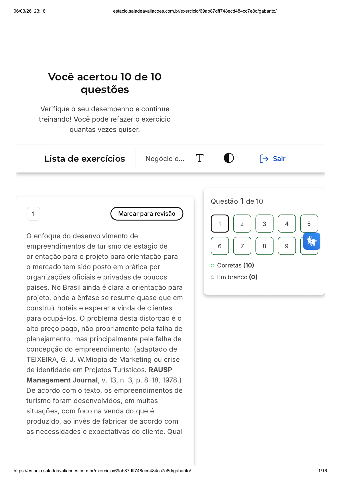 Você acertou 10 de 10 questões Verifique o seu desempenho e continue treinando! Você pode refazer o exercício quantas vezes quiser. Verificar Desempenho 1 Marcar para revisão O enfoque do desenvolvimento de empreendimentos de turismo de estágio de orientação para o projeto para orientação para o mercado tem sido posto em prática por organizações oficiais e privadas de poucos países. No Brasil ainda é clara a orientação para projeto, onde a ênfase se resume quase que em construir hotéis e esperar a vinda de clientes para ocupá-los. O problema desta distorção é o alto preço pago, não propriamente pela falha de planejamento, mas principalmente pela falha de concepção do empreendimento. (adaptado de TEIXEIRA, G. J. W.Miopia de Marketing ou crise de identidade em Projetos Turísticos. RAUSP Management Journal, v. 13, n. 3, p. 8-18, 1978.) De acordo com o texto, os empreendimentos de turismo foram desenvolvidos, em muitas situações, com foco na venda do que é produzido, ao invés de fabricar de acordo com as necessidades e expectativas do cliente. Qual Questão 1 de 10 Corretas (10) Em branco (0) 1 2 3 4 5 6 7 8 9 10 Lista de exercícios Negócio e… Sair 06/03/26, 23:18 estacio.saladeavaliacoes.com.br/exercicio/69ab87dff748ecd484cc7e8d/gabarito/ https://estacio.saladeavaliacoes.com.br/exercicio/69ab87dff748ecd484cc7e8d/gabarito/ 1/16 A B C D E é a orientação de negócios que atua desta forma? Orientação de vendas. Orientação de necessidades. Orientação de marketing. Orientação superior. Orientação estratégica. Resposta correta Parabéns, você selecionou a alternativa correta. Confira o gabarito comentado! Gabarito Comentado O desenvolvimento de produtos e serviços deve ser realizado para atender às necessidades e expectativas dos clientes. O segmento de turismo, todavia, de acordo com o texto, realizava a construção de hotéis para depois esperar a ocupação (vendas). Esta forma de atuar é a característica principal do negócio com orientação de vendas. 2 Marcar para revisão 06/03/26, 23:18 estacio.saladeavaliacoes.com.br/exercicio/69ab87dff748ecd484cc7e8d/gabarito/ https://estacio.saladeavaliacoes.com.br/exercicio/69ab87dff748ecd484cc7e8d/gabarito/ 2/16 A B C D E O objetivo deste estudo foi analisar os desafios da inclusão bancária a partir das dimensões: produtos e serviços; canais de atendimento; comunicação. Suas falas foram submetidas a uma análise de conteúdo e os resultados evidenciam, como pontos críticos para uma inclusão bancária eficiente: canais de atendimento alternativos e fisicamente mais próximos; tecnologia segura, de fácil acesso e com uso intuitivo; custo dos produtos e operações financeiras compatível com a população; atendimento de qualidade em todos os canais de atendimento; propaganda específica direcionada para esse público e, por fim, uma política constante de promoção de educação financeira. Fonte: adaptado de PINHO, R. L.; VASCONCELOS, F. C. W.; ITUASSU, C. T.; GOULART. B. A Exclusão Bancária como Consequência da Miopia de Marketing. Revista Economia & Gestão, v. 16, n. 43, p. 5-32, 2016. De acordo com o texto, diversas medidas são requeridas para melhoria dos serviços bancários. Qual seria a orientação de negócios requerida para maior inclusão bancária? Orientação estratégica. Orientação por objetivos. Orientação de marketing. Orientação operacional. Orientação com foco nos negócios. 06/03/26, 23:18 estacio.saladeavaliacoes.com.br/exercicio/69ab87dff748ecd484cc7e8d/gabarito/ https://estacio.saladeavaliacoes.com.br/exercicio/69ab87dff748ecd484cc7e8d/gabarito/ 3/16 Resposta correta Parabéns, você selecionou a alternativa correta. Confira o gabarito comentado! Gabarito Comentado Ao atacar os pontos críticos apontados na pesquisa, o setor bancário estará direcionado para desenvolver produtos e serviços que atendam às necessidades e expectativas do cliente, característica principal da orientação de marketing. 3 Marcar para revisão Os problemas de trânsito nas metrópoles brasileiras se tornaram, nas últimas décadas, cada vez mais intensos, gerando externalidades econômicas, sociais e ambientais. Com o objetivo geral de verificar o potencial de mercado para a implementação de um sistema de bicicletas compartilhadas na cidade de Nova Iguaçu-RJ foi realizada uma pesquisa de mercado. Verificou-se que há o interesse, por parte da maioria (62,42%), na implementação de um sistema de bicicletas compartilhadas na cidade de Nova Iguaçu-RJ. (adaptado de BARBOSA, A. S.; SOUZA, J. N. S. Sistema de bicicletas compartilhadas: uma pesquisa exploratória sobre o potencial deste mercado na cidade de Nova Iguaçu-RJ. Revista Inovação, Projetos e Tecnologias, v. 9, n. 2, p. 148-167, 2021.) A pesquisa realizada em Nova Iguaçu constatou uma demanda por bicicletas compartilhadas. De 06/03/26, 23:18 estacio.saladeavaliacoes.com.br/exercicio/69ab87dff748ecd484cc7e8d/gabarito/ https://estacio.saladeavaliacoes.com.br/exercicio/69ab87dff748ecd484cc7e8d/gabarito/ 4/16 A B C D E acordo com texto, qual o tipo de demanda que foi identificada com esta pesquisa? Demanda latente. Demanda irregular. Demanda plena. Demanda regular. Demanda inercial. Resposta correta Parabéns, você selecionou a alternativa correta. Confira o gabarito comentado! Gabarito Comentado Os serviços de transporte existentes em Nova Iguaçu não atendem às necessidades dos consumidores quanto aos problemas de trânsito. Esta situação caracteriza a demanda latente, onde os produtos ofertados não atendem às expectativas dos consumidores. 4 Marcar para revisão As organizações definem seus negócios e mercados para maior eficiência na aplicação de 06/03/26, 23:18 estacio.saladeavaliacoes.com.br/exercicio/69ab87dff748ecd484cc7e8d/gabarito/ https://estacio.saladeavaliacoes.com.br/exercicio/69ab87dff748ecd484cc7e8d/gabarito/ 5/16 A B C D E seus recursos. Como pode ser definido um mercado? Análise 