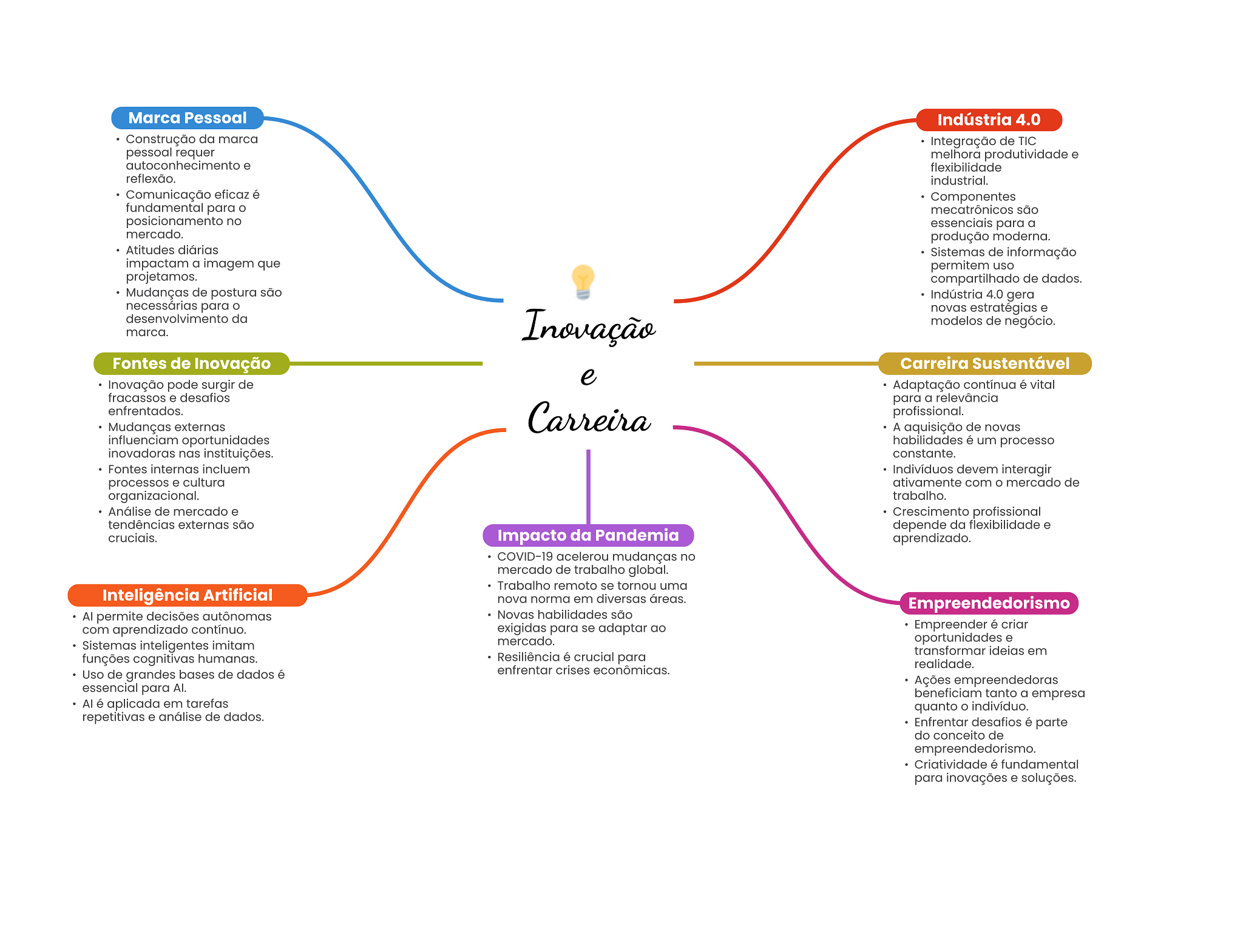 Marca Pessoal Indústria 4.0 Construção da marca Integração de TIC pessoal requer melhora produtividade e autoconhecimento e flexibilidade reflexão. industrial. Comunicação eficaz é Componentes fundamental para mecatrônicos são posicionamento no essenciais para a mercado. produção moderna. Atitudes diárias Sistemas de informação impactam a imagem que permitem uso projetamos. compartilhado de dados. Mudanças de postura são Indústria 4.0 gera necessárias para novas estratégias e desenvolvimento da marca. Inovação modelos de negócio. Fontes de Inovação Carreira Sustentável e Inovação pode surgir de Adaptação contínua é vital fracassos e desafios para a relevância enfrentados. Carreira profissional. Mudanças externas A aquisição de novas influenciam oportunidades habilidades é um processo inovadoras nas instituições. constante. Fontes internas incluem Indivíduos devem interagir processos e cultura ativamente com mercado de organizacional. trabalho. Análise de mercado e Crescimento profissional tendências externas são depende da flexibilidade e cruciais. Impacto da Pandemia aprendizado. COVID-19 acelerou mudanças no mercado de trabalho global. Trabalho remoto se tornou uma Inteligência Artificial nova norma em diversas áreas. Empreendedorismo AI permite decisões autônomas Novas habilidades são com aprendizado contínuo. exigidas para se adaptar ao Empreender é criar mercado. oportunidades e Sistemas inteligentes imitam transformar ideias em funções cognitivas humanas. Resiliência é crucial para realidade. Uso de grandes bases de dados é enfrentar crises econômicas. Ações empreendedoras essencial para beneficiam tanto a empresa é aplicada em tarefas quanto indivíduo. repetitivas e análise de dados. Enfrentar desafios é parte do conceito de empreendedorismo. Criatividade é fundamental para inovações e soluções.