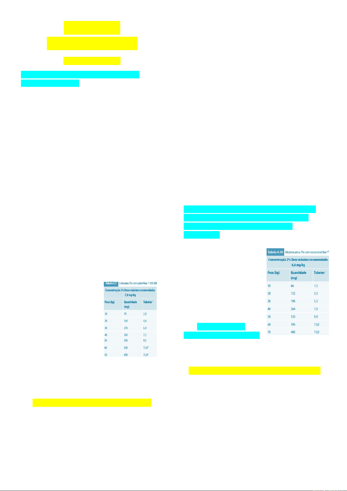 RESUMO ANESTÉSICOS 1º LIDOCAÍNA: - Pode ser usado em GESTANTES (B). (lactação: segura) PROPIEDADES: - METABOLISMO: (hepática) fígado, potencialmente tóxico. - EXCREÇÃO: Rins. - VASODILADADOR: Alto - PKa = 7,9 (mais alto) - INÍCIO DA AÇÃO: Rápida (3 a 5 minutos) - AÇÃO ANESTÉSICA TÓPICA: Sim; em concentrações de 5% e 10%. - DOSE MÁXIMA: 7,0mg/kg - CONCENTRAÇÃO DISPONÍVEL: 2% CV e SV (não muito usada) - REAÇÕES ALÉRGICAS: Inexistentes DURAÇÃO: 2% com VASOCONSTRITOR: - Epinefrina: provoca perfusão (queda do fluxo sanguíneo) diminuição do sangramento = Absorvido mais lentamente. - Anestesia pulpar: 60 minutos - Tecido mole: 3 – 5 horas ________________________________________________ 3º CLORIDRATO DE MEPIVACAÍNA: - TOXICIDADE: Semelhante a lidocaína - CONCENTRAÇÃO DISPONÍVEL: 3% sem vasoconstritor; 2% com vasoconstritor. - METABOLISMO: Fígado (hepático) - EXCREÇÃO: Rins - VASODILADADOR: Pouco potencial vasodilatador. - Pka = 7,6 (baixo) - INÍCIO DA AÇÃO: Rápida (3 a 5 minutos) - AÇÃO ANESTÉSICA TÓPICA: Não possui. - DOSE MÁXIMA: 6,6 mg/kg - 400 mg - GESTANTES: Não indicado (distúrbios hepáticos no feto) - ALERGIA: Inexistente DURAÇÃO: 3% sem VASOCONSTRITOR: - Anestesia pulpar: 20 min (infiltração) 40 min (bloqueio nervoso) - Tecidos moles: 120 a 180 min - Recomendada para pacientes nos quais seja contraindicado um vasoconstritor, procedimentos curtos e pacientes geriátricos. 2% com VASOCONSTRITOR: - Anestesia pulpar: 60 min - Tecidos moles: 3 a 5h - Potência similar a lidocaína. OBS: Indicado para processos inflamatórios ________________________________________________ CLORIDRATO DE PRILOCAÍNA: Pg. 190 - TOXICIDADE: menor toxicidade sistêmica, devido a metabolização. - CONCENTRAÇÃO DISPONÍVEL: 4% - METABOLISMO: No fígado e no pulmão. - EXCREÇÃO: Rins - VASODILADADOR: Menor que a lidocaína - Pka = 7,9 - INÍCIO DA AÇÃO: Mais lento que a lidocaína (3 a 5 min) - AÇÃO ANESTÉSICA TÓPICA: Não - DOSE MÁXIMA: 8mg/kg – 600mg - GESTANTES: Não se sabe se é excretado pelo leite. Não muito indicado (B) DURAÇÃO: 4% sem VASOCONSTRITOR: - Anestesia pulpar: 10 a 15 min (infiltração) 40 a 60min (bloqueio nervoso) - Tecidos moles: 90 a 120 (infiltração) 120 a 240: (bloqueio nervoso) 4% com VASOCONSTRITOR: - Anestesia pulpar: 60 a 90 min - Tecidos moles: 180 a 300 min Prilocaína 4% com Felipressina INDICADO: Pacientes com problemas no coração (a felipressina atua na musc. Lisa vascular, não acelera o batimento) OBS: Em altas doses seus metabólitos (orto-toluidina) podem causar metemoglobinemia que pode reduzir a capacidade de transporte de oxigênio no sangue. MAIS SUSCETÍVEIS: Crianças, gestantes e pacientes com anemias e doenças respiratórias. SINAIS: Lábio azulado (cianose), fadiga, tontura... CONTRAINDICADO: Pacientes que estejam recebendo paracetamol ou fenacetina que produzem elevação dos níveis de metemoglobina. ________________________________________________ 2 º CLORIDRATO DE ARTICAÍNA: Pg. 192 - Molécula híbrida, características de amida e de éster. - Difusão em tecido ósseo. - POTÊNCIA: 1,5 vezes a da lidocaína. - TOXICIDADE: Semelhante a lidocaína. - CONCENTRAÇÃO DISPONÍVEL: 4% - METABOLISMO: No plasma e no fígado. - EXCREÇÃO: Rins. - VASODILADADOR: Igual a lidocaína. - Pka = 7,8 - INÍCIO DA AÇÃO: 1 a 9 minutos depois da injeção. - AÇÃO ANESTÉSICA TÓPICA: Não. - DOSE MÁXIMA: 7,0mg/kg - CONTRAINDICADO: - Doença hepática, - Comprometimento cardiovascular, - Metemoglobinemia congênita ou idiopática. - Crianças menores de 4 anos - Gestantes (C) não se sabe se é excretado no leite. DURAÇÃO: 4% com VASOCONSTRITOR: - Anestesia pulpar: 60 a 75 min - Tecidos moles: 180 a 136 min Articaína 4% com epinefrina 1:100.000 ou 1:200.000. ________________________________________________ CÁLCULO ANESTÉSICO: Paciente: 40 anos, saudável, sexo masculino, 90 kg Anestésico local: cloridrato de articaína + epinefrina 1:200.000 Articaína 4% = 72 mg/tubete Articaína 7,0 mg/kg = 630 mg (dose máxima recomendada) Número de tubetes de 630/72 = 9 image7.png image8.png image9.png image1.png image2.png image3.png image4.png image5.png image6.png