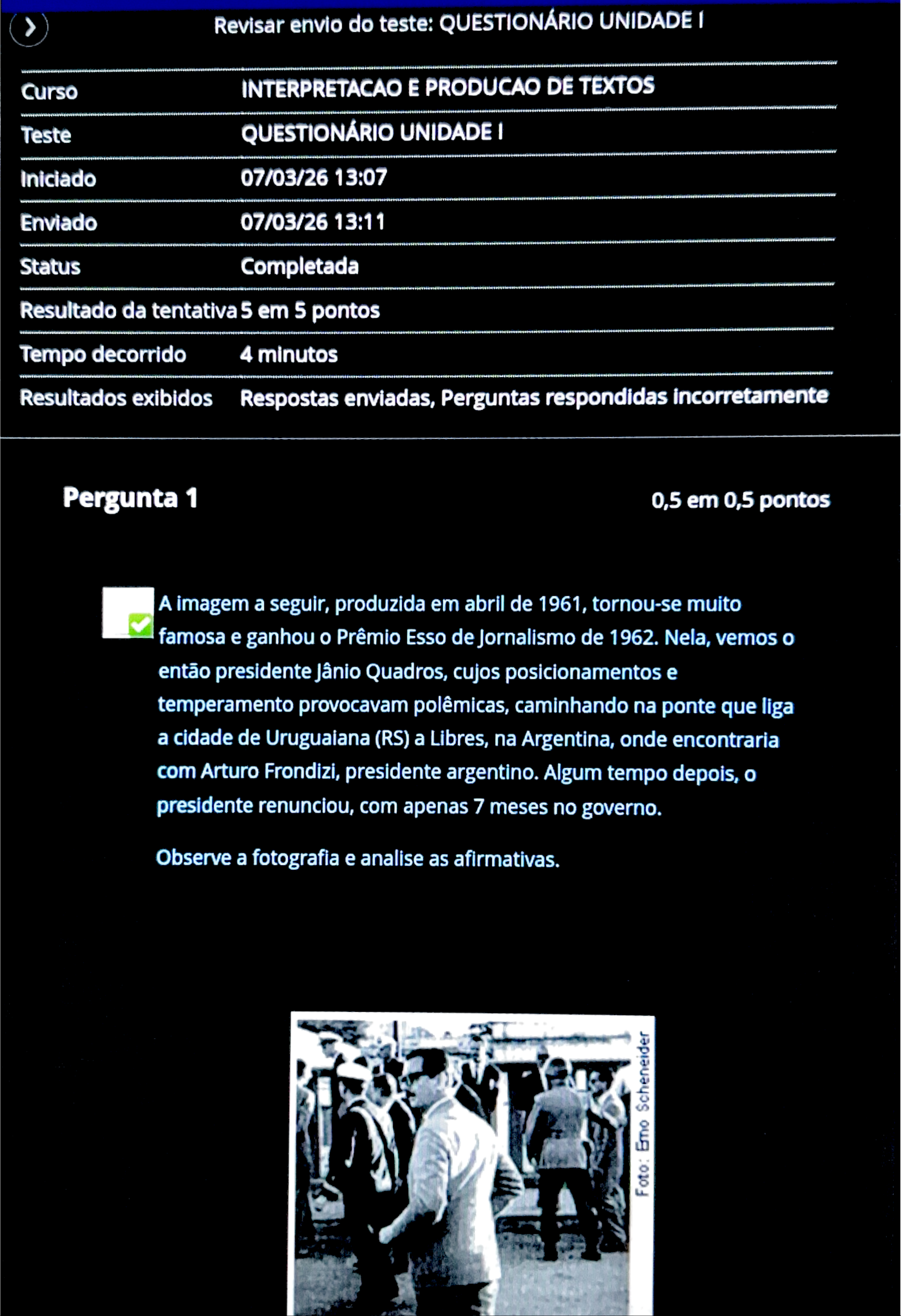 Revisar envio do teste: QUESTIONÁRIO UNIDADE I Curso INTERPRETACAO E PRODUCAO DE TEXTOS Teste QUESTIONÁRIO UNIDADE I Iniciado 07/03/26 13:07 Enviado 07/03/26 13:11 Status Completada Resultado da tentativa 5 em 5 pontos Tempo decorrido 4 minutos Resultados exibidos Respostas enviadas, Perguntas respondidas incorretamente Pergunta 1 0,5 em 0,5 pontos A imagem a seguir, produzida em abril de 1961, tornou-se muito famosa e ganhou Prêmio Esso de Jornalismo de 1962. Nela, vemos então presidente Jânio Quadros, cujos posicionamentos e temperamento provocavam polêmicas, caminhando na ponte que liga a cidade de Uruguaiana (RS) a Libres, na Argentina, onde encontraria com Arturo Frondizi, presidente argentino. Algum tempo depois, presidente renunciou, com apenas 7 meses no governo. Observe a fotografia e analise as afirmativas. Foto: Emo ScheneiderRevisar envio do teste: QUESTIONÁRIO UNIDADE I Foto: Emo Scheneider Disponível em: Acesso em: 05 jun. 2018. Trata-se de uma fotografia que só tem sentido como um registro do momento histórico e, por isso, não pode ser considerada um texto. II. A posição das pernas de Jânio Quadros tem apenas significado cômico, exatamente da mesma forma que teria se protagonista fosse qualquer pessoa. III. A fotografia apresenta valor simbólico, pois desequilíbrio e a indecisão dos passos representam a incerteza política do período. É correto que se afirma somente em: Resposta Selecionada: C. III.Revisar envio do teste: QUESTIONÁRIO UNIDADE I Pergunta 2 0,5 em 0,5 pontos Considere a ilustração a seguir, que tem como inspiração conto "O flautista do Hamelin", escrito pelos Irmãos Grimm, em que personagem hipnotiza os ratos até eles se afogarem no rio, recebendo um pagamento para isso. A segunda figura ilustra esse conto. Disponível em: Acesso em: 31 jul. 2018. Disponível em:Revisar envio do teste: QUESTIONÁRIO UNIDADE I Disponível em: . Acesso em: 31 jul. 2018. Sobre as figuras, analise as afirmativas a seguir. Na ilustração contemporânea, personagem hipnotiza os seguidores da rede social como do conto hipnotizava os ratos. II. A ilustração não se constrói com base na intertextualidade, pois as personagens e as intenções do flautista são alteradas. III. conhecimento do conto não interfere na interpretação da ilustração contemporânea. É correto que se afirma somente em: Resposta Selecionada: d.l. Pergunta 3 0,5 em 0,5 pontos Considere a ilustração e as afirmativas a seguir.13:13 sab., de mar. Revisar envio do teste: QUESTIONÁRIO UNIDADE I Disponível em: ads/2012/04/TV-faz-mal-ao-cerebro.jpg>. Acesso em: 20 jun. 2016. I. objetivo da ilustração é mostrar que os meios de comunicação tecem conhecimento das crianças, contribuindo para um mundo mais bem informado. II. A ilustração é uma crítica aos meios de comunicação ultrapassados, que não promoviam acesso à informação como a internet faz atualmente. III. A ilustração sugere que os meios de comunicação de massa provocam perda de autonomia do raciocínio. Está correto que se afirma somente em: Resposta Selecionada: III. Pergunta 4 0,5 em 0,5 pontos Considere a publicação de uma internauta que propõe alteração de um título jornalístico e analise as afirmativas.Revisar envio do teste: QUESTIONÁRIO UNIDADE I A mudança no título não modifica efeito de sentido porque não altera fato. II. título original permite, implicitamente, a leitura de que a mulher tem parcela de culpa no crime. III. título alterado é mais impreciso e, por isso, rompe compromisso com a veracidade. É correto que se afirma somente em: Resposta Selecionada: b. II. Pergunta 5 0,5 em 0,5 pontos Considere poema de Gonçalves Dias, escrito em 1843, e de José Paulo Paes, escrito em 1973, e analise as afirmativas a seguir. Canção do Exílio Gonçalves Dias Minha terra tem palmeiras, Onde canta Sabiá; As aves, que aqui gorjeiam, Não gorjeiam como lá. Nosso céu tem mais estrelas, Nossas várzeas têm mais flores,Revisar envio do teste: QUESTIONÁRIO UNIDADE I Disponível em: -dias-cancao-do-exilio/>. Acesso em: 31 jul. 2018. Canção do Exílio Facilitada José Paulo Paes lá? ah! sabiá... papá... maná... sofá... sinhá... cá? bah! Disponível em: Acesso: em 31 jul. 2018. Não houve intertextualidade, pois poema de José Paulo Paes não cita nenhum verso de Gonçalves Dias. II. conhecimento do poema de Gonçalves Dias é necessário para a interpretação do poema de José Paulo Paes. III. A oposição entre aqui, lugar de enunciação do poeta, e lá, marcado pelos prazeres e pelas belezas, só aparece no poema de Gonçalves Dias, uma vez que a versão moderna apresenta palavras sem conexão. É correto que se afirma em: Resposta Selecionada: e. II, apenas.Revisar envio do teste: QUESTIONÁRIO UNIDADE I Pergunta 6 0,5 em 0,5 pontos Considere poema "No meio do caminho", de Carlos Drummond de Andrade, a propaganda da Soletur e as afirmações que seguem. I.A criatividade da propaganda é percebida se leitor observar a intertextualidade com poema de Drummond. II. A palavra "pedra" tem mesmo sentido nos dois textos. III. Tanto poema quanto a propaganda mostram a preocupação com meio ambiente e com a sustentabilidade. É correto que se afirma apenas em: Resposta Selecionada: a.l.Revisar envio do teste: QUESTIONÁRIO UNIDADE I Pergunta 7 0,5 em 0,5 pontos Leia a charge a seguir: Disponível em: . Acesso em: 25 fev. 2016. Com base na leitura, analise as asserções e a relação proposta entre elas. Ao ilustrar a selfie como a ponta do iceberg, a charge metaforiza fato de que as imagens postadas nas redes sociais mais escondem do que revelam. PORQUE II. A charge ilustra O comport do indivíduo contemporâneo que expõe recortes de situações em busca da aprovação dos amigosRevisar envio do teste: QUESTIONARIO UNIDADE Assinale a alternativa correta. Resposta a. Selecionada: As duas asserções são verdadeiras e a segunda justifica a primeira. Pergunta 8 0,5 em 0,5 pontos Ob