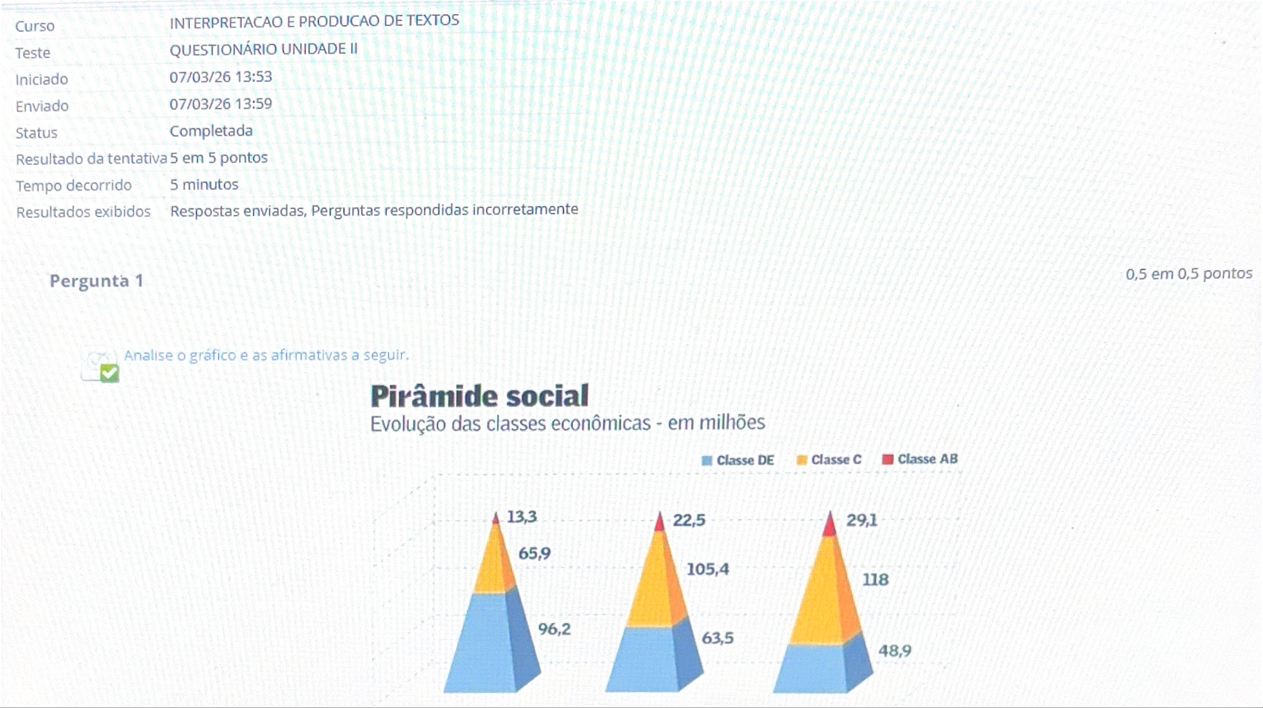 Curso INTERPRETACAO E PRODUCAO DE TEXTOS Teste QUESTIONÁRIO UNIDADE Iniciado 07/03/26 13:53 Enviado 07/03/26 13:59 Status Completada Resultado da tentativa 5 em 5 pontos Tempo decorrido 5 minutos Resultados exibidos Respostas enviadas, Perguntas respondidas incorretamente Pergunta 1 0,5 em 0,5 pontos Analise gráfico e as afirmativas a seguir. Pirâmide social Evolução das classes econômicas em milhões Classe DE Classe Classe AB 13,3 22,5 29,1 65,9 105,4 118 96,2 63,5 48,92003 2011 2014 de Politicas CPS/FGV partir dos microdades da Fonte: acervo pessoal Em 2003, cerca de 55% da população encontravam-se has classes II. De 2003 a 2014, observa-se crescimento da classe e encolhimento das classes D/E e A/B. III. Em 2014, as classes mais pobres (D/E) aproximadamente, um quarto da população. IV. gráfico sugere melhora na distribuição de renda no Brasil de 2003 a 2014. Está correto que se afirma somente em: Resposta Selecionada: a. e IV. Pergunta 2 Leia a charge a seguir. Madden PROG RESSO Fonte: acervo Com base na analise as afirmativas. LA charge ilustra evolução histórica da civilização e sugere que a caminha em direção ao progresso. A charge relaciona positivamente desenvolvimento bem-estar dos cidadãos. A charge indica que caminho para progresso exige so e no ambiente a Resposta Selecionada: a. afirmativa èPergunta 3 0,5 em pontos Leia artigo de Mônica Sousa, filha do desenhista Mauricio de Sousa e inspiradora da personagem Mônica histórias em Em observe a Somos todas donas da rua 08/03/2016 "No começo, a Turminha era formada só de meninos: Franjinha, Cebolinha Chico Até que começaram a perguntar para meu pai: Cade as meninas? Mauricio conhecia mais universo dos garotos. Foi que ele começou a olhar em volta e percebeu que poderia se inspirar nas filhas. Em Mônica estreou na tirinha do Cebolinha e encantou todo mundo com umjeito que não era considerado exatamente feminino para a epoca. Ela era decidida. dona da rua. Eu era também. Meu pai sempre me deixou ser do sem me limitar por ser menina. Para minha autenticidade (e de todos seus dez filhos) sempre foi importante E só nos gibis, as peculiaridades de cada personagem baseado em Quando uma menina ou mulher é digamos, logo leva a fama de para que a Mônica sempre teve foi uma autoconfiança enorme, além de um grande sentimento de responsabilidade em relação a seus amigos. Meninas em todo Brasil e em vários países do mundo se identificam com a dentucinha, cuja força maior não física: é a força de quem acredita em seus sonhos e Na época em que a personagem 05 anos as mulheres começavam ganhar mais espaço no mercado de trabalho. No ano de publicação da primeira em que a Mônica aparece a russa Valentina Tereshkova foi a primeira mulher a viajar ao espaço. Mas caminho foi longo. Fazia pouco menos de três décadas que as brasileiras haviam conquistado direito ao Em 1964 criada a Magali, mais conciliadora (além de claro!) Mais alguns anos e chegou nha e tantas outras Cada uma com seu Os meninos e meninas da Turma são diferentes? Com certeza. Mas brincam de casinha, de de viagem espacial, do que quiserem brincar Juntos E. como a Mônica nunca foi limitada pelo fato de elas e e também não são. Têm mesmos direitos e oportunidades. São iguais na diferença naturalmente as crianças. Ou como deveriam ser. Mas as crianças. também naturalmente seguem os exemplos dos não Por isso precisamos ser bons exemplos para Pois em pleno século 21. ainda há muito a conquistar. Como diretora executiva de uma grande sou do mesmo modo que a Mônica das historinhas uma exceção. No Brasil. as mulheres ocupam apenas 5% das vagas nos conselhos das empresas e entre 8% e 16% dos cargos de alta liderança. temos uma mulher na mas no Congresso, são apenas 13 senadoras para um total de 81 vagas e 51 deputadas para 513 cade ras na Federal A nova geração tem a oportunidade de mudar esse com a nossa ajuda A violência contra mulheres e meninas tem raizes na discriminação na e começa portanto, a prevenção prec acompanhar esse fator desde a educação de meninos e a fim de promover relações de gênero mais Desde a Mônica embaixadora do Unicef (Fundo das Nações Un das pela emprestando sua para defender direitos das e Neste de 2016 a de Sousa Produções tem orgulho de se tornar signatária dos do ONU Mulheres Fundamentada na visão de igualdade consagrada na Carta das Nações Unidas a ONU Mulheres entre outras questões trabalha para a eliminação da discriminação contra as mulheres e meninas e a realização da gualdade entre mulheres homens como parceiros e beneficiários do desenvolvimento direitos ação humanitária e paz e Neste dia 8 de queremos mais que homenagens Queremos Como as ménina podem ser as donas da rua e do Disponível Acesso 17 mar MAS POR vocal MAIS de Fonte: Com base na as afirmativas De com texto personagem na sue uma expressão das heres nossa edade Segundo apesar dos avanços em relação elas de 11% do Congresso NacionalCom base na leitura, analise as De acordo com texto, a personagem Mônica na época da sua criação, uma expressão das conquistas das mulheres na nossa sociedade patriarcal. Segundo texto, apesar dos avanços em relação à participação das mulheres na política, elas ocupam cerca de 11% das vagas do Congresso Os quadrinhos contradizem que exposto no texto sobre os papéis e as características dos uma vez que Cebolinha defende a divisão de tarefas de acordo com sexo. Está correto que se afirma em: Resposta Selecionada: b. 0,5 em 0,5 pontos Pergunta 4 Leia texto a seguir brasileiro cordial Luiz Ruffato término de uma palestra para cerca de estudantes de uma universidade privada em São me pensando, ao olhar auditório lotado de jovens: quantos de ao esse chegarão ilesos em casa? Porque nos dias que correm a nossa vida vale tão pouco que sobreviver a mais uma jornada máximo a que Todos nós conhecemos familias destroçadas pela violência e pouco a 