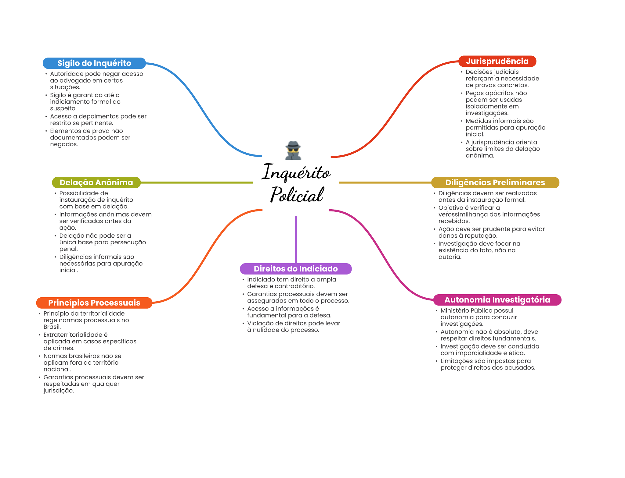 Sigilo do Inquérito Jurisprudência Autoridade pode negar acesso Decisões judiciais ao advogado em certas reforçam a necessidade situações. de provas concretas. Sigilo é garantido até Peças apócrifas não indiciamento formal do podem ser usadas suspeito. isoladamente em Acesso a depoimentos pode ser investigações. restrito se pertinente. Medidas informais são Elementos de prova não permitidas para apuração inicial. documentados podem ser negados. A jurisprudência orienta sobre limites da delação anônima. Inquérito Delação Anônima Diligências Preliminares Possibilidade de Policial Diligências devem ser realizadas instauração de inquérito antes da instauração formal. com base em delação. Objetivo é verificar a Informações anônimas devem verossimilhança das informações ser verificadas antes da recebidas. ação. Ação deve ser prudente para evitar Delação não pode ser a danos à reputação. única base para persecução Investigação deve focar na penal. existência do fato, não na Diligências informais são autoria. necessárias para apuração inicial. Direitos do Indiciado Indiciado tem direito a ampla defesa e contraditório. Garantias processuais devem ser Princípios Processuais asseguradas em todo processo. Autonomia Investigatória Acesso a informações é Princípio da territorialidade Ministério Público possui fundamental para a defesa. rege normas processuais no autonomia para conduzir Brasil. Violação de direitos pode levar investigações. à nulidade do processo. Extraterritorialidade é Autonomia não é absoluta, deve aplicada em casos específicos respeitar direitos fundamentais. de crimes. Investigação deve ser conduzida Normas brasileiras não se com imparcialidade e ética. aplicam fora do território Limitações são impostas para nacional. proteger direitos dos acusados. Garantias processuais devem ser respeitadas em qualquer jurisdição.
