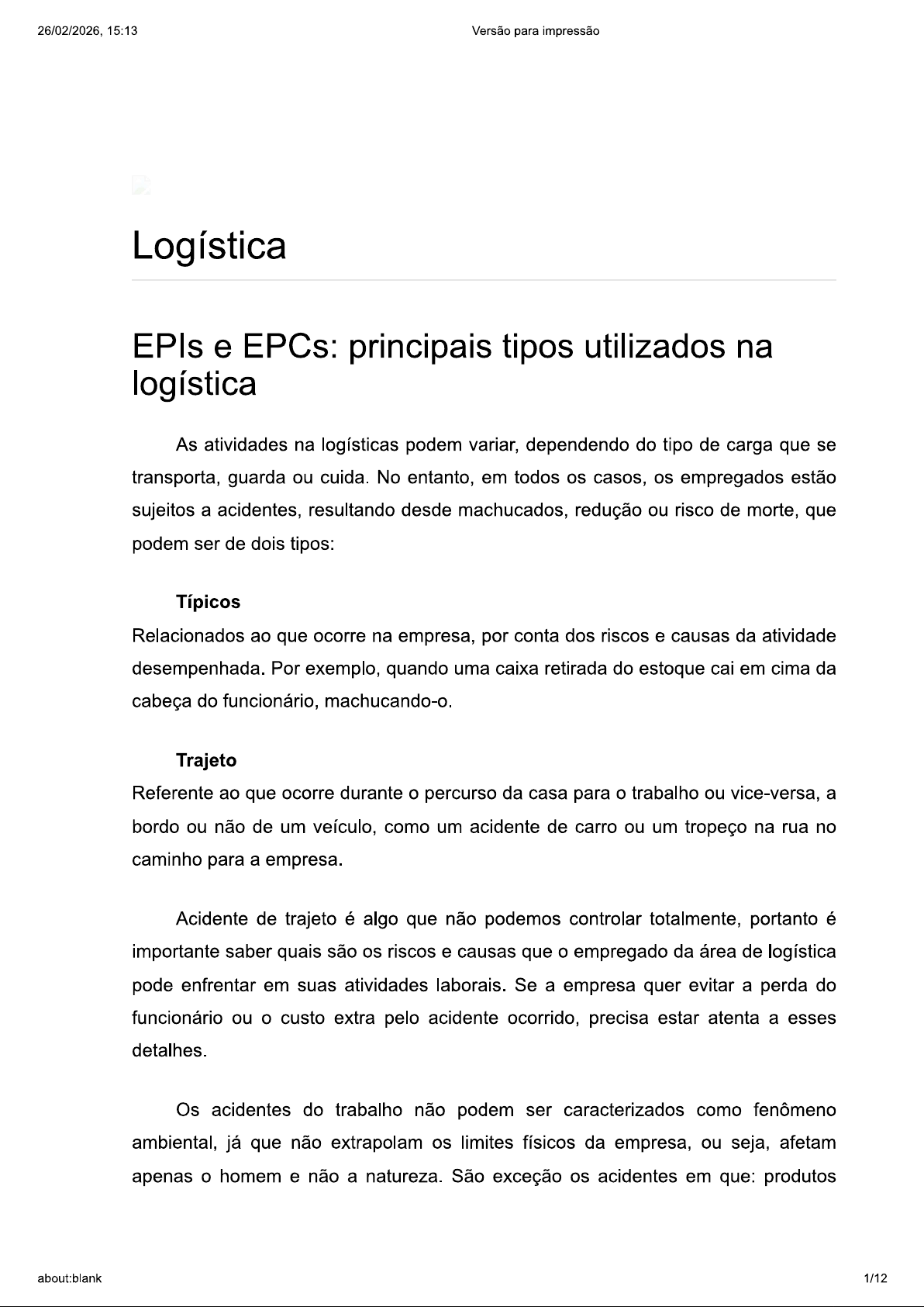 26/02/2026, 15:13 Versão para impressão Logística EPIs e EPCs: principais tipos utilizados na logística As atividades na logísticas podem variar, dependendo do tipo de carga que se transporta, guarda ou cuida. No entanto, em todos os casos, os empregados estão sujeitos a acidentes, resultando desde machucados, redução ou risco de morte, que podem ser de dois tipos: Típicos Relacionados ao que ocorre na empresa, por conta dos riscos e causas da atividade desempenhada. Por exemplo, quando uma caixa retirada do estoque cai em cima da cabeça do funcionário, machucando-o. Trajeto Referente ao que ocorre durante percurso da casa para trabalho ou vice-versa, a bordo ou não de um veículo, como um acidente de carro ou um tropeço na rua no caminho para a empresa. Acidente de trajeto é algo que não podemos controlar totalmente, portanto é importante saber quais são os riscos e causas que empregado da área de logística pode enfrentar em suas atividades laborais. Se a empresa quer evitar a perda do funcionário ou custo extra pelo acidente ocorrido, precisa estar atenta a esses detalhes. Os acidentes do trabalho não podem ser caracterizados como fenômeno ambiental, já que não extrapolam os limites físicos da empresa, ou seja, afetam apenas homem e não a natureza. São exceção os acidentes em que: produtos about:blank 1/1226/02/2026, 15:13 Versão para impressão químicos extravasam para meio ambiente; produtos biológicos são misturados aos efluentes das indústrias; raios que destroem árvores em tempestades, entre outros. Como riscos de acidente de trabalho, podemos listar quatro grupos que ocorrem na logística. São eles: Físicos Os riscos de natureza física são: a) Ruídos Quando acima de 85 db (decibéis), o ruído pode ser prejudicial para a pessoa exposta. Como exemplo, temos máquinas, aviões a jato, explosões etc. b) Vibrações Se a pessoa trabalha com veículos ou equipamentos que vibrem muito, como tratores ou britadeiras, pode ter problemas musculares e ósseos. c) Temperaturas Podem ser desde a questão da exposição a produtos, máquinas ou motores quentes, bem como em relação à radiação, quando exposto ao ar livre. Químicos Esses tipos de riscos ocorrem quando o funcionário tem que transportar ou estar exposto a metais pesados que possuem radiação, como zinco, agrotóxicos usados em lavouras ou a gases tóxicos, como o gás carbônico, que sai de certos veículos que operam, ou em queimas de lixos. Biológicos Podem ser de dois tipos: about:blank 2/1226/02/2026, 15:13 Versão para impressão a) Tipos de cargas transportadas Podem ser desde animais peçonhentos, como cobras, aranhas, escorpiões, abelhas, bem como materiais biológicos, como os hospitalares. b) Ambiente de exposição Desde a água contaminada até a vetores de doença, como contato com moscas, baratas, ratos, mosquitos e outros. Ergonômicos Relacionados à estrutura musculoesquelética e psicológica do trabalhador e sua adequação à máquina, mobiliário, posto, jornada e condições de trabalho. Peso e postura incompatíveis com biótipo e tarefa, bem como a jornada de trabalho (duração, ritmo, turno e controle rígido) são um bom exemplo desse risco. Com relação às causas, todas elas estão relacionadas aos seguintes elementos: Homem Podem ocorrer com treinamentos ou capacitações inadequadas, vícios (álcool, drogas e tabagismo), equipamentos ausentes ou inadequados em relação à tarefa a ser executada. Máquinas e equipamentos Poderá ser por causa da utilização sem a devida proteção, ou quando utilizados de forma inadequada, com defeito ou operadas sem autorização. Ambiente laboral about:blank 3/1226/02/2026, 15:13 Versão para impressão Pode ser tanto dentro de um ambiente fechado, como locais com armazenamento de produtos inadequados ou espaços confinados (tanques, silos, bueiro etc.), ou em locais abertos, causando insolação excessiva ou tempo prolongado de exposição; bem como locais propícios a incêndio e explosão, os quais não estão sinalizados ou nos quais a informação é inadequada. Para evitar as causas, as empresas devem promover meios de prevenção de acidentes. Porém, dentre os itens obrigatórios, estão os EPIs ou EPCs, que serão objetos de estudos desse conteúdo. about:blank 4/1226/02/2026, 15:13 Versão para impressão EPI Os equipamentos de proteção individual (EPI) são todos os meios ou dispositivos destinados a utilização por uma pessoa contra possíveis riscos ameaçadores da saúde ou da segurança durante exercício de uma determinada atividade. Seu objetivo é diminuir ou atenuar um possível risco agressivo contra corpo do trabalhador que usa. Um equipamento de proteção individual pode ser constituído por vários meios ou dispositivos associados, sempre de forma a proteger o seu utilizador contra um ou vários riscos simultâneos. uso deste tipo de equipamentos só deverá ser contemplado quando não for possível tomar medidas que permitam eliminar os riscos do ambiente em que se desenvolve a atividade. A legislação trabalhista prevê quais são as obrigações tanto da empresa quanto dos funcionários, a saber: Empresa a. Fornecer os EPI adequados ao trabalho b. Instruir e treinar quanto ao uso dos EPIs Fiscalizar e exigir uso dos EPI d. Repor os EPIs danificados Empregados a. Usar e conservar os EPI b. Avisar ao empregador caso haja alguma anomalia com os EPI about:blank 5/1226/02/2026, 15:13 Versão para impressão Além disso, a norma regulamentadora (NR) 6 do Ministério do Trabalho e Emprego (MTE) explica que a empresa é obrigada a fornecer, gratuitamente, aos empregados, os EPI adequados ao risco inerente à atividade que desempenham, em perfeito estado de conservação e funcionamento. São muitos os casos de empregados que, com desculpas de que não se acostumam ou que o EPI incomoda no exercício da função, deixam de utilizá-lo e passam a sofrer as consequências de um ambiente de tra