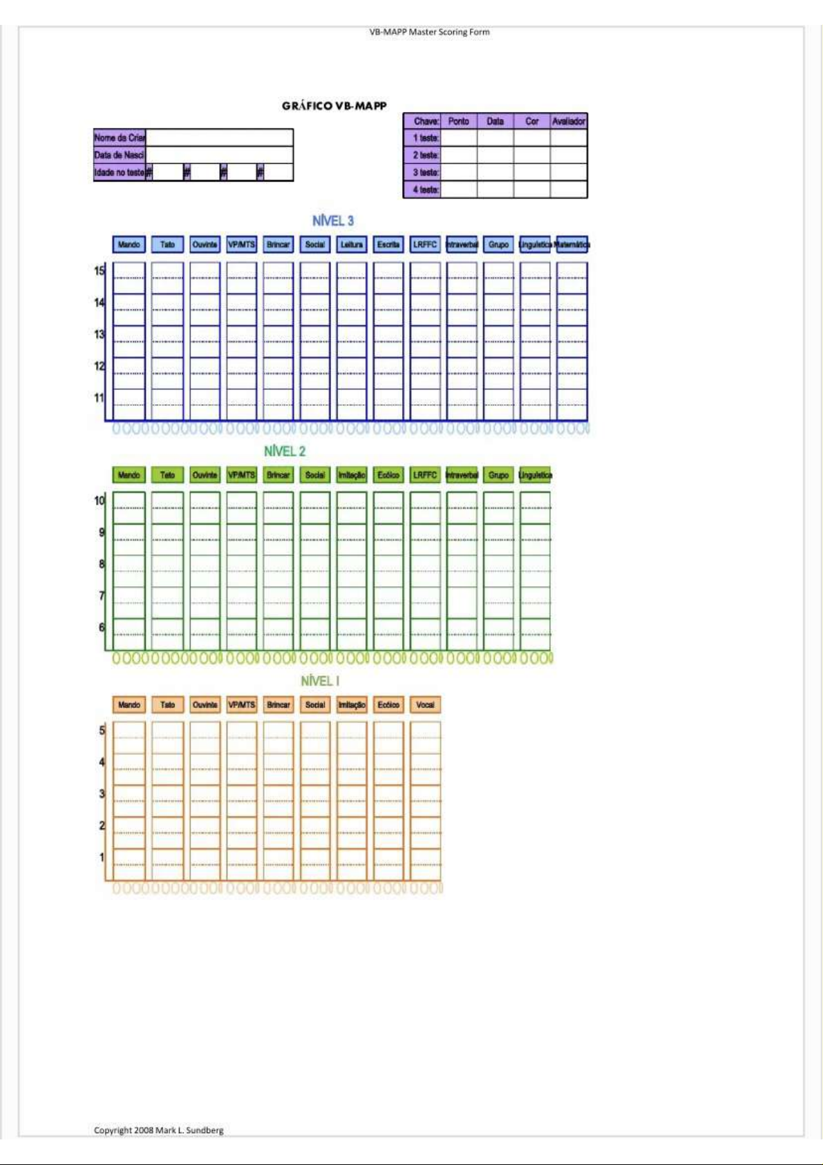 VB-MAPP Master Scoring Form GRÁFICO VB-MAPP Chave: Ponto Data Cor Avaliador Nome de 1 Data de Nasci 2 Idade no 3 testo: 4 NÍVEL 3 Mando Tato Ouvinte VP/MTS Brincar Social Leitura Escrita LRFFC Grupo 15 14 13 12 11 0000 0000 001 0000 0 001 0 0 001 0 0 000 000 0 NÍVEL 2 Ouvinte VP/MTS Brincar Social LRFFC Grupo 10 9 8 7 6 0000 0 0 0 0 000 0 0 0 0 0 0 NÍVEL Mando Tato Ouvinte VP/MTS Brincar Social Imitação Vocal 5 4 3 2 1 00000 00 00 Copyright 2008 Mark L. Sundberg