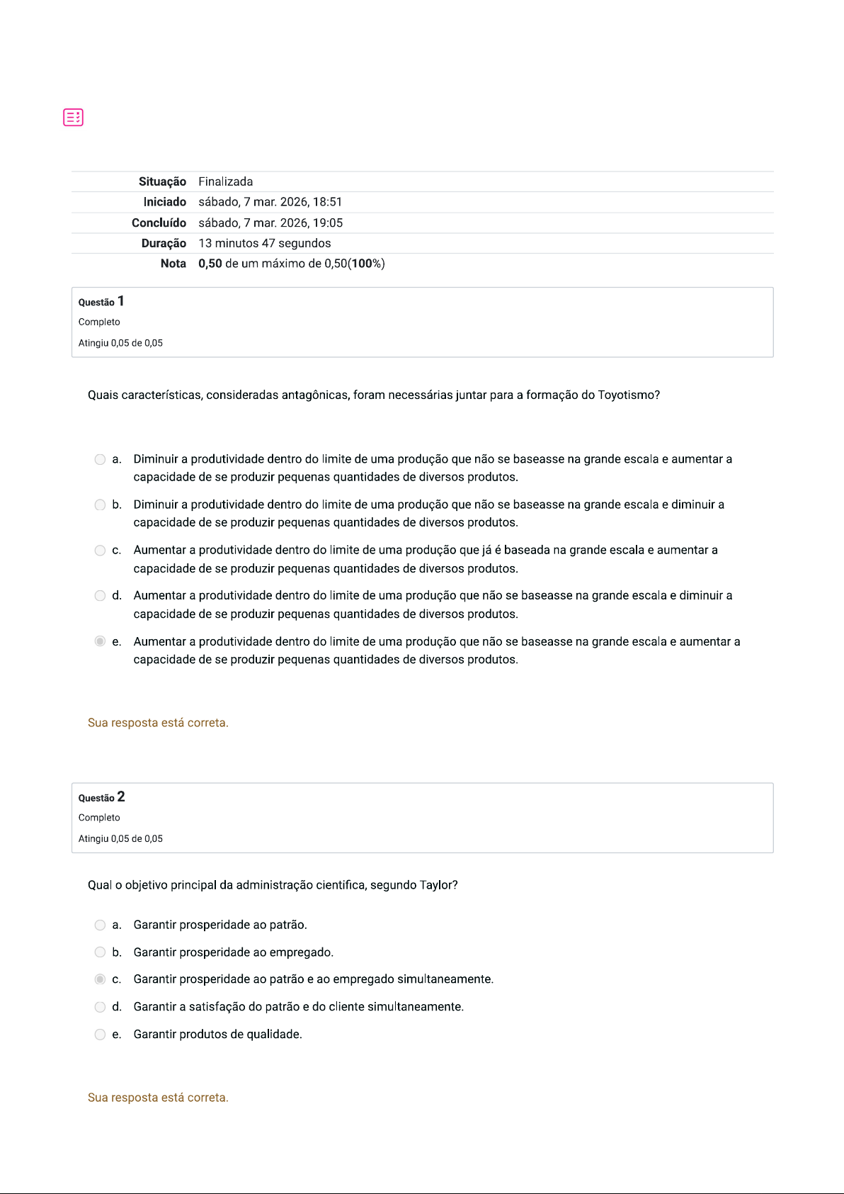 Situação Finalizada Iniciado sábado, 7 mar. 2026, 18:51 Concluído sábado, 7 mar. 2026, 19:05 Duração 13 minutos 47 segundos Nota 0,50 de um máximo de 0,50(100%) Questão 1 Completo Atingiu 0,05 de 0,05 Quais características, consideradas antagônicas, foram necessárias juntar para a formação do Toyotismo? a. Diminuir a produtividade dentro do limite de uma produção que não se baseasse na grande escala e aumentar a capacidade de se produzir pequenas quantidades de diversos produtos. b. Diminuir a produtividade dentro do limite de uma produção que não se baseasse na grande escala e diminuir a capacidade de se produzir pequenas quantidades de diversos produtos. C. Aumentar a produtividade dentro do limite de uma produção que já é baseada na grande escala e aumentar a capacidade de se produzir pequenas quantidades de diversos produtos. d. Aumentar a produtividade dentro do limite de uma produção que não se baseasse na grande escala e diminuir a capacidade de se produzir pequenas quantidades de diversos produtos. e. Aumentar a produtividade dentro do limite de uma produção que não se baseasse na grande escala e aumentar a capacidade de se produzir pequenas quantidades de diversos produtos. Sua resposta está correta. Questão 2 Completo Atingiu 0,05 de 0,05 Qual o objetivo principal da administração cientifica, segundo Taylor? a. Garantir prosperidade ao patrão. b. Garantir prosperidade ao empregado. Garantir prosperidade ao patrão e ao empregado simultaneamente. d. Garantir a satisfação do patrão e do cliente simultaneamente. e. Garantir produtos de qualidade. Sua resposta está correta.Questão 3 Completo Atingiu 0,05 de 0,05 Assinale a alternativa que apresente corretamente os 4 princípios fundamentais para a administração cientifica. a. 1- Princípio do planejamento; 2- Princípio da preparação dos clientes; 3- Princípio do Controle; 4- Princípio da execução. b. 1- Princípio do conhecimento; 2- Princípio da preparação dos trabalhadores; 3- Princípio do Controle; 4- Princípio da execução. C. 1- Princípio do planejamento; 2- Princípio da preparação dos trabalhadores; 3- Princípio do Controle; 4- Princípio da criação. d. 1- Princípio do planejamento; 2- Princípio da preparação dos trabalhadores; 3- Princípio do Controle; 4- Princípio da execução. e. 1- Princípio do planejamento; 2- Princípio da preparação dos trabalhadores; 3- Princípio da amostragem; 4- Princípio da execução. Sua resposta está correta. Questão 4 Completo Atingiu 0,05 de 0,05 A respeito dos princípios fundamentais da administração cientifica, assinale aquele que possuir a definição correta. a. Todos os princípios apresentam definições corretas. b. Princípio do planejamento: princípio diz que a improvisação e o empirismo são métodos eficientes, testados e planejados com antecedência. Princípio da execução: Aqui, é importante analisar as características e habilidades do operador, é necessário fornecer treinamentos e prepará-lo para produzir mais e melhor d. Princípio do controle: Esse princípio consiste na supervisão da gerência perante seus colaboradores. e. Princípio da preparação dos trabalhadores: Consiste em dividir funções e responsabilidade de forma justa e equivalente perante os funcionários para que não haja confusão ou injustiças. Sua resposta está correta.Questão 5 Completo Atingiu 0,05 de 0,05 Dentre as afirmações abaixo, assinale aquela que representa um objetivo correto para a medição do tempo padrão. a. Não pode ser utilizado na avaliação quando se faz um estudo de otimização. b. É utilizado na avaliação, através da redução ou não do tempo padrão, através da troca de funcionários quando se faz um estudo de eficiência. Serve para estudos futuros que busquem estabelecer a pessoa certa para executar a função. d. Serve para estudos futuros que busquem estabelecer o número de gente envolvido no processo. e. Serve para estudos futuros que busquem estabelecer o custo industrial associado a um determinado produto. Sua resposta está correta. Questão 6 Completo Atingiu 0,05 de 0,05 Dentre os cuidados que se devem tomar quando é aplicado um método de medição de trabalho, assinale a opção correta. a. Não é necessário avisar o operar que será feito um estudo do tempo em seu setor. b. É fundamental conhecer a operação que será medida, conhecer o local, os equipamentos que estão envolvidos, as condições de operação e detalhes gerais. Nenhuma das alternativas estão corretas. d. A medição é tão simples que não se faz necessário conhecer previamente a operação a ser medida e nem o local e os equipamentos. e. Não se deve dividir a tarefa em partes, ao fazer isso, estará dificultando e aumento o trabalho a ser realizado. Sua resposta está correta.Questão 7 Completo Atingiu 0,05 de 0,05 A respeito da definição de "tempo normal", assinale a correta: a. É tempo em que um operador leva para executar sua função em velocidade reduzida. Velocidade normal é aquela em que o operador consegue manter durante todo o período de trabalho sem causar fadiga. b. É aquele que é marcado quando é realizado uma operação. Normalmente é obtido por meio da cronometragem direta do operador em seu posto de trabalho. É o tempo em que um operador leva para executar sua função em velocidade normal. Velocidade normal é aquela em que o operador consegue manter durante todo o período de trabalho sem causar fadiga. d. É o tempo em que um operador leva para executar sua função em velocidade acelerada. Velocidade normal é aquela em que o operador consegue manter durante todo o período de trabalho sem causar fadiga. e. É aquele requerido por uma operação, quando as interrupções e condições especiais da operação forem levadas em conta. Sua resposta está correta. Questão 8 Completo Atingiu 0,05 de 0,05 A respeito da autonomação, assinale a alternativa correta: a.