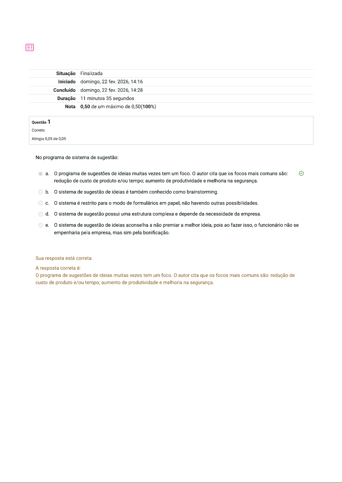 Situação Finalizada Iniciado domingo, 22 fev. 2026, 14:16 Concluído domingo, 22 fev. 2026, 14:28 Duração 11 minutos 35 segundos Nota 0,50 de um máximo de 0,50(100%) Questão 1 Correto Atingiu 0,05 de 0,05 No programa de sistema de sugestão: a. 0 programa de sugestões de ideias muitas vezes tem um foco. 0 autor cita que os focos mais comuns são: redução de custo de produto e/ou tempo; aumento de produtividade e melhoria na segurança. b. sistema de sugestão de ideias é também conhecido como brainstorming. sistema é restrito para o modo de formulários em papel, não havendo outras possibilidades. d. 0 sistema de sugestão possui uma estrutura complexa e depende da necessidade da empresa. e. sistema de sugestão de ideias aconselha a não premiar a melhor ideia, pois ao fazer isso, o funcionário não se empenharia pela empresa, mas sim pela bonificação. Sua resposta está correta. A resposta correta é: programa de sugestões de ideias muitas vezes tem um foco. 0 autor cita que os focos mais comuns são: redução de custo de produto e/ou tempo; aumento de produtividade e melhoria na segurança.Questão 2 Correto Atingiu 0,05 de 0,05 A respeito da melhoria de processo, analise as afirmações abaixo e marque a correta. a. Para que possamos definir melhoria do processo, primeiro é necessário entender e analisar o processo a ser melhorado para que se possa saber o que é preciso ser otimizado. b. A partir da identificação do processo ineficiente, é necessário encontrar a única possível causa raiz do problema, não havendo a possibilidade da existência de mais de uma. A melhoria de processo tem o objetivo de definir funcionários ineficientes para que possam ser demitidos. d. Existem algumas técnicas a serem aplicadas para conhecer o processo a ser melhorado, entre essas técnicas podemos citar: análise das métricas de desempenho, programa 5s, análise das interações com os clientes e brainstorming. e. Conhecer apenas o setor a ser melhorado já é suficiente para a melhoria do processo, não sendo necessário conhecer a empresa como um todo. Sua resposta está correta. A resposta correta é: Para que possamos definir melhoria do processo, primeiro é necessário entender e analisar o processo a ser melhorado para que se possa saber que é preciso ser otimizado. Questão 3 Correto Atingiu 0,05 de 0,05 A respeito dos conceitos de ferramenta de qualidade estudados, assinale a única alternativa correta. a. Não existe ferramenta ruim, mas sim falta de compreensão e falta de conhecimento por parte de quem aplica. b. Após a escolha da ferramenta da qualidade a ser aplicado, é esperado que apenas o gestor se envolva no processo de implantação, uma vez que ele é a cabeça do projeto, portanto, os funcionários do setor não precisam e não devem se envolver. Como a teoria de cada ferramenta da qualidade é universal, o resultado alcançado será igual para todas as empresas que as aplicas. d. A qualidade, por estar se popularizando entre as empresas, se tornou um modismo e não é possível afirmar que qualidade é um diferencial para a empresa. e. Durante um projeto, para se obter maior assertividade, é fundamental que o gestor fique alternando entre as ferramentas da qualidade. Sua resposta está correta. A resposta correta é: Não existe ferramenta ruim, mas sim falta de compreensão e falta de conhecimento por parte de quem aplica.Questão 4 Correto Atingiu 0,05 de 0,05 Para alguns autores, indicadores são fundamentais para um bom planejamento e controle de processo. Tendo isso em mente, a respeito da cronoanálise, é possível afirmar que: a. A cronoanálise é um alicerce que auxilia no controle de ferramentas e estoque de produto. b. A cronoanálise é considerado um indicador de qualidade apenas quando a organização utiliza outras técnicas em conjunto. A cronoanálise é um alicerce que auxilia no controle das muitas etapas que um processo produtivo possa vir a ter uma vez que fornece o parâmetro inicial (tempo padrão para a análise). d. A cronoanálise é uma ferramenta de qualidade que auxilia na matéria-prima dentro de uma empresa, uma vez que está envolvido diretamente com a organização e gestão de estoque. e. A cronoanálise, por não estar envolvido diretamente na produção, não pode ser considerado um indicador de qualidade. Sua resposta está correta. A resposta correta é: A cronoanálise é um alicerce que auxilia no controle das muitas etapas que um processo produtivo possa vir a ter uma vez que fornece parâmetro inicial (tempo padrão para a análise). Questão 5 Correto Atingiu 0,05 de 0,05 A respeito das figuras utilizadas em fluxograma, assinale a que apresente a definição correta: a. A seta representa a operação de "inspeção". b. quadrado com a ponta arredondada representa a "operação". triangulo representa a operação de "armazenamento". d. quadrado representa a função de "transporte". e. 0 círculo representa a operação de "espera". Sua resposta está correta. A resposta correta é: triangulo representa a operação de "armazenamento".Questão 6 Correto Atingiu 0,05 de 0,05 A respeito da técnica de cronometragem, assinale a alternativa correta: a. Durante a execução da técnica, não recomendado avisar os operadores. É importante realizar a técnica escondida para que não haja mudança de comportamento por parte os funcionários. b. A cronometragem completa dos tempos é composta por quatro etapas: 1- medição do ciclo operatório; 2- medição dos elementos do ciclo operatório; 3- medição das atividades frequências e 4- medição das atividades não frequências. A cronometragem divide-se em apenas duas etapas: 1- cronometragem dos tempos e 2- análise dos resultados. d. A inclusão do cálculo do tempo médio é um passo opcional para quem está realizando, podendo ou não adicionar o tempo médio. e. É a técnica mais comum no meio dos estudos do tempo. É o método de menor nível de dificu