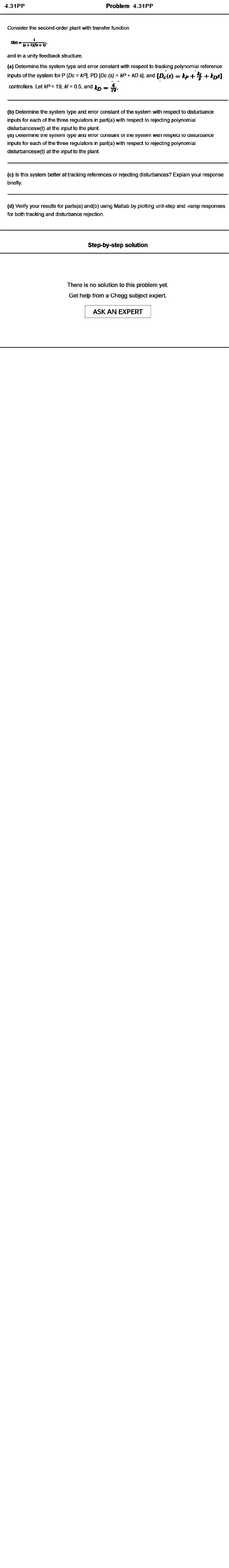 Problem 4.31 PP Consider the second-order plant with transfer function (f+IX5f+I)’ and in a unity feedback structure. (a) Determine the system type and error constant with respect to tracking polynomiai reference inputs of the system for P [Dc = kP\, PD [Dc (s) = kP + kD s], and [Z>c(s) = + ^ + controllers. LetkP = ^Q ,k l= 0.5, and (b) Determine the system type and error constant of the system with respect to disturbance inputs for each of the three regulators in part(a) with respect to rejecting polynomial disturbanceswffj at the input to the plant. ueiermine me system type ana error constani or me system witn respect to aisturoance inputs for each of the three regulators in part(a) with respect to rejecting polynomial disturbanceswffj at the input to the plant. (c) Is this system better at tracking references or rejecting disturbances? Explain your response briefly. (d) Verify your results for parts(a) and(b) using Matlab by plotting unit-step and -ramp responses for both tracking and disturbance rejection. Step-by-step solution There is no solution to this problem yet. Get help from a Chegg subject expert. ASK AN EXPERT