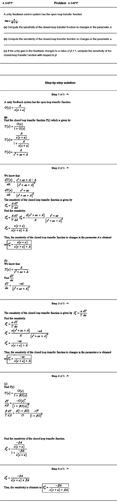 Problem 4.04PP A unity feedback control system has the open-loop transfer function (a) Compute the sensitivity of the closed-loop transfer function to changes in the parameter A. (b) Compute the sensitivity of the closed-loop transfer function to changes in the parameter a. (c) If the unity gain in the feedback changes to a value of ^ 1, compute the sensitivity of the closed-loop transfer function with respect to f3. Step-by-step solution step 1 of 5 A uni^ feedback system has the open-bop transfer functbn (a) Find the cbsed loop transfer hmction r(s) v^dch is given by r ( s ) = ^ ' 1 + G (s) s (s + a) 1 + a(s + a) r ( a ) = - 5 — --------- ̂ ̂ + as + A Step 2 of 5 We know that
