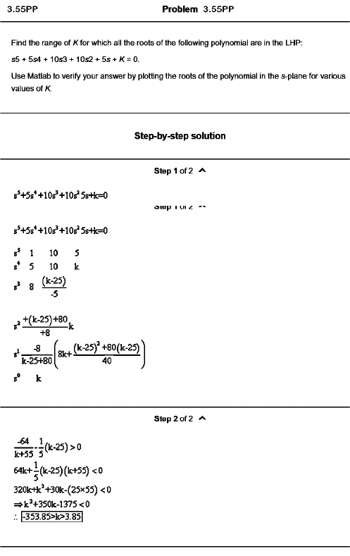 Problem 3.55PP Find the range of K for which all the roots of the following polynomial are in the LHP: s5 + 5s4 + 10s3 + 10s2 + 5s + / 0 k+55 5^ ^ 64k+j(k-25)(lc4-55) k^+350k-1375 k>3.85l