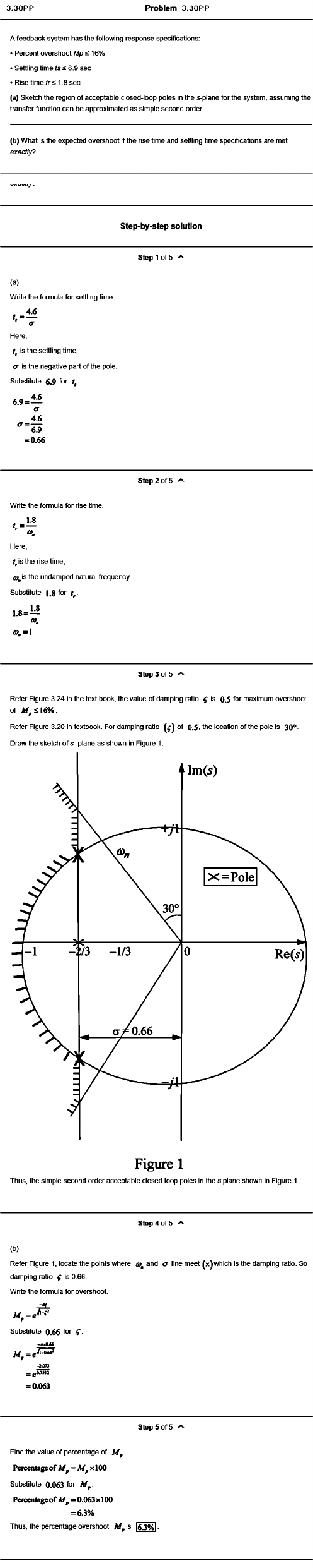 Problem 3.30PP A feedback system has the following response specifications; • Percent overshoot Wp M : * 1 step 3 of 5 Refer Figure 3.24 in the text book, the value of damping ratio ^ is 0.5 for maximum overshoot of Refer Figure 3.20 in textbook. For damping ratio ( f ) ° f 0 .5 , the location of the pole is 30®. Draw the sketch of s- plane as shown In Figure 1. Figure 1 Thus, the simple second order acceptable closed loop poles in the s plane shown in Figure 1. sten 4 of 5 (b) Refer Figure 1, locate the points where and line meet ^x)whlch Is the damping ratio. So damping ratio ^ is 0.66. Write the formula for overshoot. M = e ' Substitute 0.66 for f • -irriU* = 0.063 Step 5 of 5 Find the value of percentage of Percentageof x 100 Substitute 0.063 for A/, Percentageof =0.063x100 = 6.3% Thus, the percentage overshoot is |6.3%l •