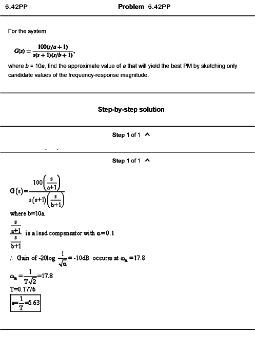Problem 6.42PP For the system 100(j/a+ l) G(i) = - '5 ( j+ l ) ( j / f r + l ) * where b = 10a, find the approximate value of a that will yield the best PM by sketching only candidate values of the frequency-response magnitude. Step-by-step solution step 1 of 1 G(s)=- ^ e re b=10a. Step 1 of 1 is alead compensatorwith a=0.1 Gain o f - 2 0 l o g - l O d B occurss at cd̂ =17.8 Va cV = - 5 j==17.8 7>l2 T=0.1776 =-^=5.63 T_____