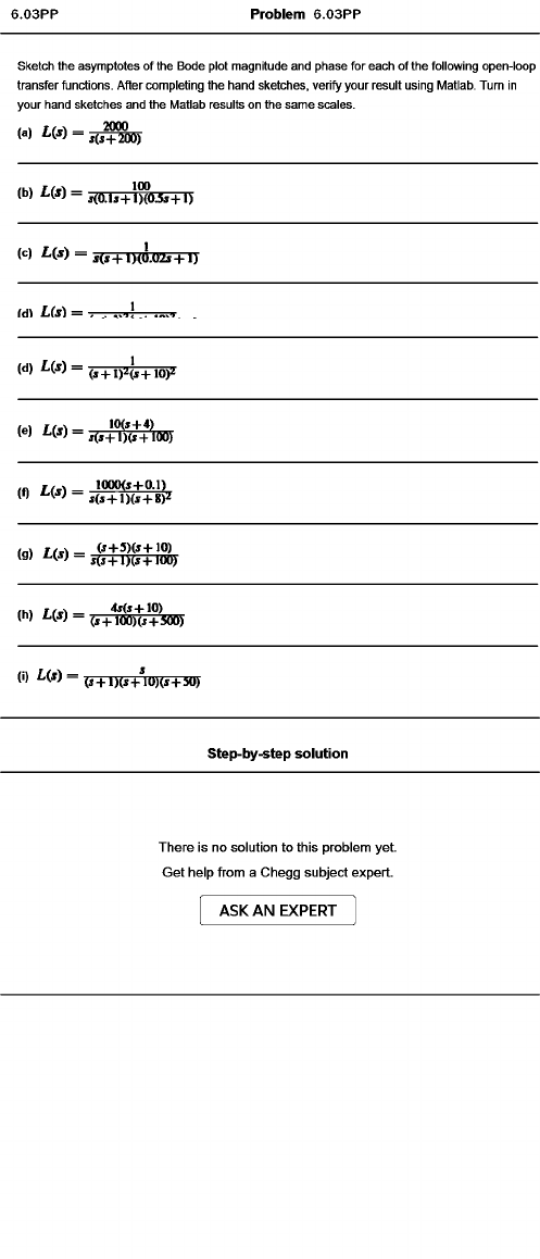 Problem 6.03PP Sketch the asymptotes of the Bode plot magnitude and phase for each of the following open-loop transfer functions. After completing the hand sketches, verily your result using Matlab. Turn in your hand sketches and the Matlab results on the same scales. (a) L(s) = 2000 j(s+200) (b) L(s) = 100 l(O .I> + l)(O Js+ l) (c) L ( i ) = 1 5(s+T7^07E r+Ty tdl L(s) = I ' " ■ (d) L(s) = 1 ( T P T p t T P W (e) L(I) = m + 4 ) i(J + l) (J + l( I0 ) (f) L(s) = I000(