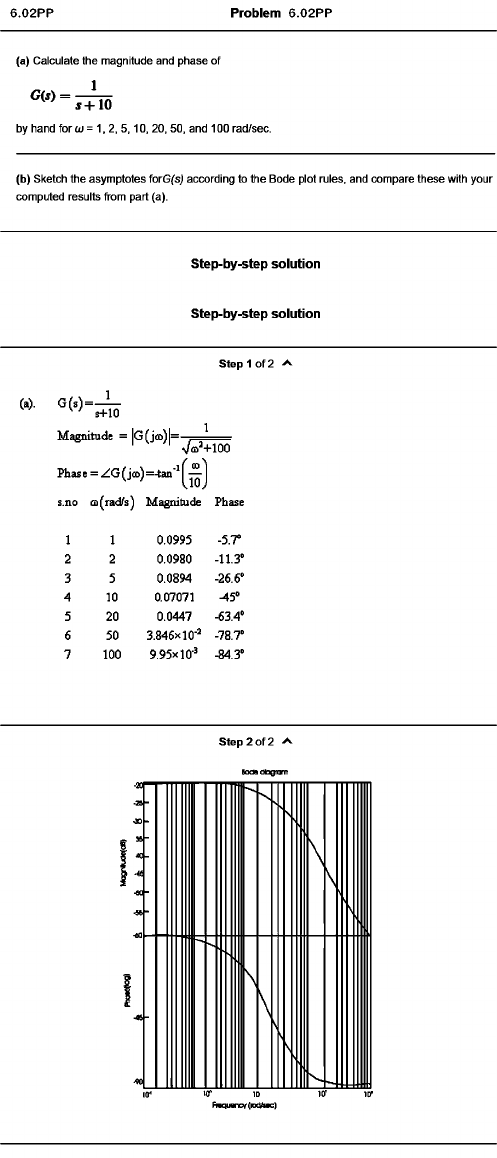 Problem 6.02PP (a) Calculate the magnitude and phase of 1 Gis) = - s + l O by hand foroj = 1, 2, 5.10. 20, 50. and 100 rad/sec. (b) Sketch the asymptotes forGfsj according to the Bode plot rules, and compare these with your computed results from part (a). S tep -b y -s te p so lu tion S tep -b y -s te p so lu tion step 1 of 2 (a). G (s )= — ̂ ̂ s+10 M i^ itu d e = |G(jo[))|= Vffi^+ioO Phas e = Z.G (joo) =-tan'^ j s.no ai(rad/s) Magnitude Phase 1 1 0.0995 -5.7* 2 2 0.0980 -11.3" 3 5 0.0894 -26.6" A 10 0.07071 -45" 5 20 0.0447 -63.4" 6 50 3.846x10-^ -78.7" 7 100 9.95X10-’ -84.3" Step 2 of 2