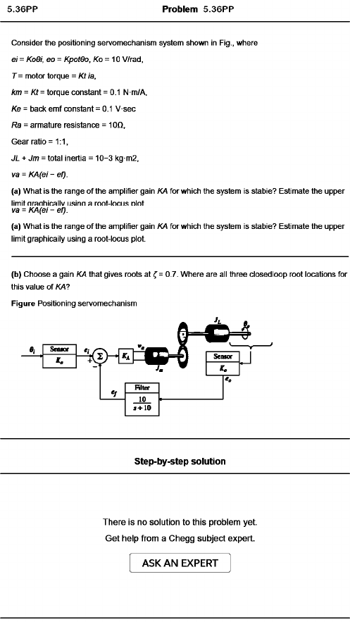 Problem 5.36PP Consider the positioning servomechanism system shown in Fig., where ei = Kodi, eo = Kpotdo, /Co = 10 V/rad, T = motor torque = Kt ia, km = /Cf= torque constant = 0.1 N m/A, Ke = back emf constant = 0.1 Vsec Ra = armature resistance = 10Q, Gear ratio = 1:1, JL + Jm = total inertia = 10-3 kg m2, va = KA(ei - ef). (a) What is the range of the amplifier gain KA for which the system is stabie? Estimate the upper limit nranhicallv u