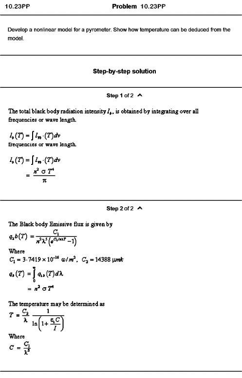 Problem 10.23PP Develop a nonlinear model for a pyrometer. Show how temperature can be deduced from the model. Step-by-step solution step 1 of 2 The total black body radiation intensity , is obtained by integrating over all frequencies or wave length. frequencies or wave length.