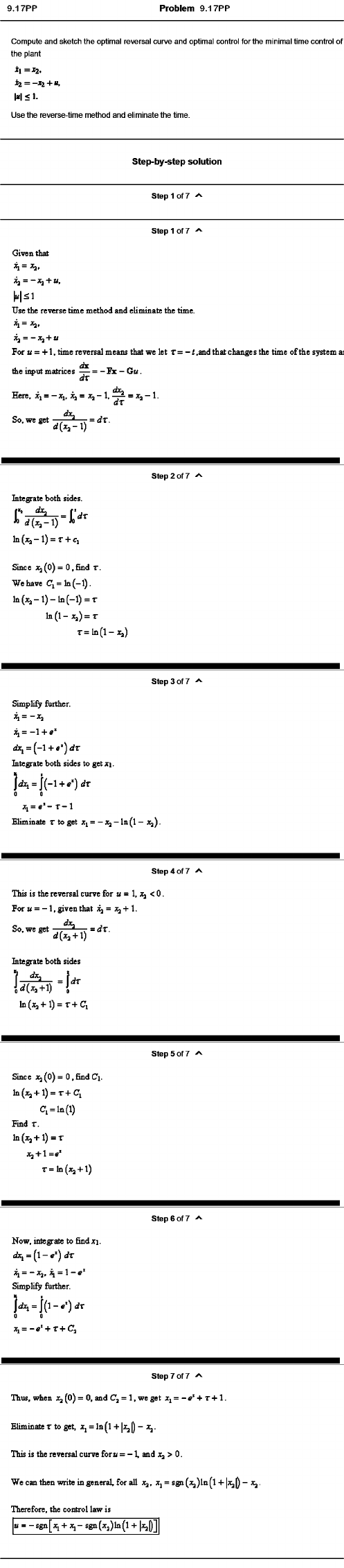 Problem 9.17PP Compute and sketch the optimal reversal curve and optimal control for the minimal time control of the plant l«l 0. We can then write in general, for all Xj = sgn (;t^)ln^l + |x^p - x ̂■ Therefore, the control law is u = -sg n [j;i + I , - sgn(jrj)ln(l + |j^D]