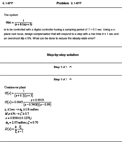 Problem 8.14PP The system G(*) = 1 ■ ( i+ 0 .1 )(*+ 3 ) is to be controlled with a digital controller having a sampling period of 7= 0.1 sec. Using a z- plane root locus, design compensation that will respond to a step with a rise time tr