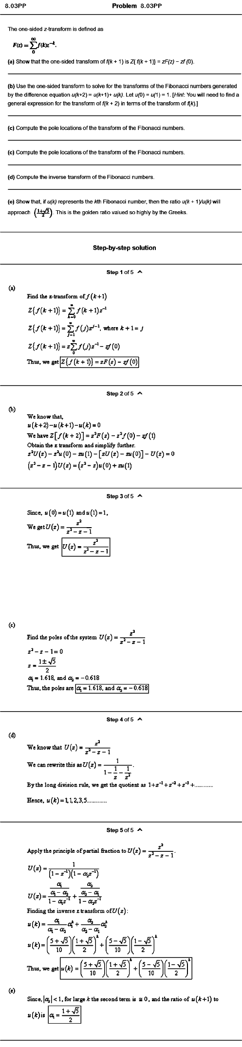 (c) Compute the pole locations of the transform of the Fibonacci numbers.