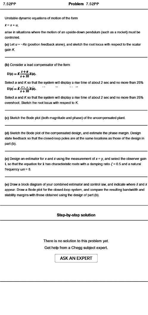 Problem 7.52PP Unstable dynamic equations of motion of the form x = x + u. arise in situations where the motion of an upside-down pendulum (such as a rocket) must be controlled. (a) Let u = -Kx (position feedback alone), and sketch the root locus with respect to the scalar gain K. (b) Consider a lead compensator of the form Select a and K so that the system will display a rise time of about 2 sec and no more than 25% Select a and K so that the system will display a rise time of about 2 sec and no more than 25% overshoot. Sketch the root locus with respect to K. (c) Sketch the Bode plot (both magnitude and phase) of the uncompensated plant. (d) Sketch the Bode plot of the compensated design, and estimate the phase margin. Design state feedback so that the closed-loop poles are at the same locations as those of the design in part (b). (e) Design an estimator for x and x using the measurement of x = y, and select the observer gain L so that the equation for x has characteristic roots with a damping ratio ^ = 0.5 and a natural frequency o)n = 8. (e) Draw a block diagram of your combined estimator and control law, and indicate where x and x appear. Draw a Bode plot for the closed-loop system, and compare the resulting bandwidth and stability margins with those obtained using the design of part (b). Step-by-step solution There is no solution to this problem yet. Get help from a Chegg subject expert. ASK AN EXPERT