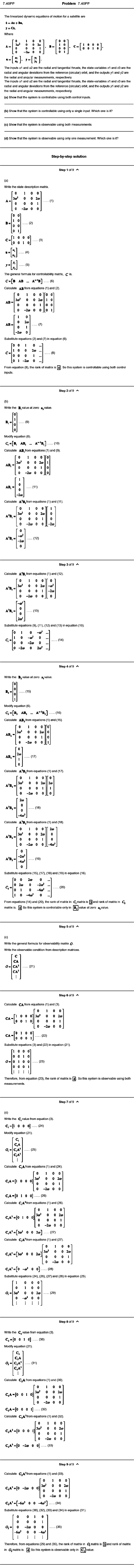 Problem 7.40PP The linearized dynamic equations of motion for a satellite are i = Ax + Ba, y = c*. Where ■ 0 1 0 0 ' ■ 0 0 ■ A = W 0 0 2a> 0 0 0 1 . B = 1 0 0 0 0 -2o» 0 0 0 1 « _ r I 0 0 0 1 [ o 0 1 Q J* -[S]- The inputs u ̂ and u2 are the radial and tangential thrusts, the state-variables x1 and x3 are the radial and angular deviations from the reference (circular) orbit, and the outputs y1 and y2 are the radial and angular measurements, respectively. The inputs u ̂ and u2 are the radial and tangential thrusts, the state-variables x^ and x3 are the radial and angular deviations from the reference (circular) orbit, and the outputs y1 and y2 are the radial and angular measurements, respectively. (a) Show that the system is controllable using both control inputs. (b) Show that the system is controllable using only a single input. Which one is it? (c) Show that the system is observable using both measurements. (d) Show that the system is observable using only one measurement. Which one is it? Step-by-step solution step 1 of 9 (a) Write the state description matrix. A s B s 0 0 0 3 ^ fro m equations (1) and (2). AB« A B s 0 3(»* 0 0 1 0 0 1 0 0 0 0 0 0 1 0 0 (7) -2 ® 0 Substitute equations (2) and (7) in equation (6). ■(8) 0 0 1 0 1 0 0 lea 0 0 0 1 0 1 -lea 0 From equation (8), the rank of matrix Is [ ^ . So this system Is controllable using both control inputs. Step 2 of 9 (b) Write the BiValueatzero upvalue. O' ...... (9)B, Modify equation (6). C ; = [ b , AB, ... A - ’ B , ] (10) Calculate A B jfrom equations (1) and (9). A B ,* A B ,* 0 1 0 0 0 0 2d> 0 0 0 1 0 - 2 ^ 0 0 1 0 0 -2a) ■ (11) Calculate A^B,from equations (1) and (11). A *B ,s A *B ,s 0 1 0 0 ~ r ~ 3B,= 0 0 ...... (13) 2a>‘ Substitute equations (9), (11), (12) and (13) in equation (10). .(14) 0 1 0 1 0 - o ’ 0 0 0 -2a> 0 0 - 2 « 0 2®’ Step 4 of 9 Writethe B^ value at zero u,value. 0 ...... (15)B ,s Modify equation (6). C i= [ B , A B j ... A - % ] (16) Calculate A B , from equations (1) and (15). A B ,* A B ,- 1 0 0 0 -2 B ,= A > B ,= Substitute equations (15), (17), (18) and (19) in equation (16). 0 1 0 0 2fl) 3®’ 0 0 2fl) 0 0 0 0 1 0 0 -2fl) 0 0 -4fl)* 0 -2fl)* ^ f l ) * (19) 0 0 0 2d) 0 0 2fl) 0 - la / ... 0 0 - t o * ... 1 0 -4fl)^ 0 ... (20) From equations (14) and (20), the rank of matrix in C, matrix is [^and rank of matrix in Q matrix Is. So this system is controllable only in |B,|value at zero u,value. Step 5 of 9 (c) Write the general formula for observability matrix O- Write the observable condition from description matrices. C CA (21) Step 6 of 9 Calculate CA^rom equations (1) and (3). CA CA 0 0 0 fl 0 0 ' [ o 0 1 fo 1 0 0] ' [ o 0 0 i j ■ 0 1 0 o ' 3d)* 0 0 2d) 0 0 0 1 0 -2d) 0 0 (22) Substitute equations (3) and (22) in equation (21). 1 0 0 O' O s 0 0 1 0 0 1 0 0 0 0 0 1 (23) Therefore, from equation (23), the rank of matrix is [ ^ . So this system is observable using both measurements. Step 7 of 9 (d) Writethe C, value from equation (3). C ,= [l 0 0 0 ] ...... (24) Modify equation (21). ̂ C, o ,= C,A C,A' C,A* (25) Calculate C.Affom equations (1) and (24). ■ 0 1 0 0 ' 3®’ 0 0 2d) 0 0 0 1 0 -2d) 0 0 C ,A -[1 0 0 0] C ,A -[0 1 0 0 ] ...... (26) Calculate C,A*from equations (1) and (26). C,A’ =[0 I 0 0] C ,A '= [3 o ’ 0 0 2 = ■ 0 0 0 0 I 0 0 3d)* 0 0 2d) ...... (29) 0 -d)* 0 0 Step 8 of 9 Write the C, value from equation (3). C, = [0 0 I 0 ] ...... (30) Modify equation (21). c, C,A 0 ,= C,A’ ...... (31) C.A’ C ,A -[0 0 I 0] Calculate C ,A from equations (1) and (30). 0 1 0 0 ' 3o’ 0 0 2o 0 0 0 1 0 -2 o 0 0 C,A = [0 0 0 1 ]...... (32) Calculate C ,A ’ from equations (1) and (32). 0 1 0 0 ‘ C,A’ =[0 0 0 1] 3o’ 0 0 2o 0 0 0 1 0 -2 o 0 0 C,A’ =[0 -2 o 0 0 ] ...... (33) Step 9 of 9 Calculate C,A*from equations (1) and (33). C,A’ =[0 -2 o 0 0] C,A’ = [-6 o * 0 0 -4 o ’ ] ...... (34) Substitute equations (30), (32), (33) and (34) in equation (31). ■ 0 1 0 0' 3d)̂ 0 0 2d) 0 0 0 1 0 -2d) 0 0 ■ 0 0 1 0 0 0 0 1 0 -2d) 0 0 -6®* 0 0 -t®’ .(35)o , = Therefore, from equations (29) and (35), the rank of matrix in matrix is [^and rank of matrix in 0,matt1xis. So this system is observable only in j^ jva lu e .