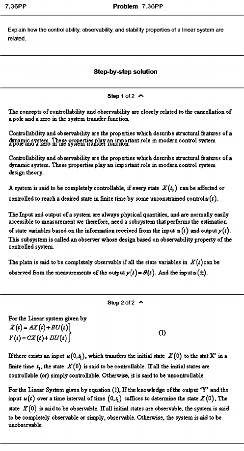 Problem 7.36PP Explain how the controllability, observability, and stability properties of a linear system are related. Step-by-step solution step 1 of 2 The concepts o f controllability and observability are closely related to the cancellation of a pole and a zero in the S3rstem transfer function. Controllability and observability are the properties which describe structural features of a dniamic system. These properties p l ^ an in:portant role in modern control system apoic ano a zero m uie system tiansier [unction. Controllability and observability are the properties which describe structural features of a d3mamic system. These properties play an important role in modern control system design theory. A system is said to be completely controllable, if every state can be affected or controlled to reach a desired state in finite time by some unconstrained control u (t) . The I i^ u t and output o f a system are always physical quantities, and are normally easily accessible to measurement we therefore, need a subsystem that performs the estimation of state variables based on the information received fi'om the input u(
