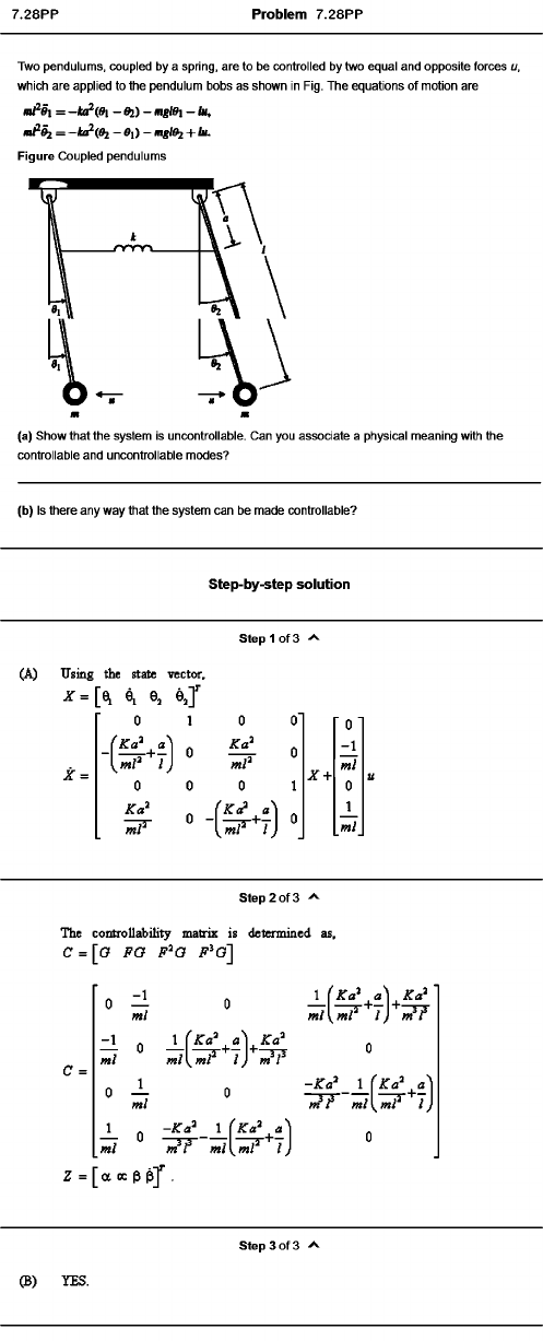 Two pendulums, coupled by a spring, are to be controlled by two equal and opposite forces u.