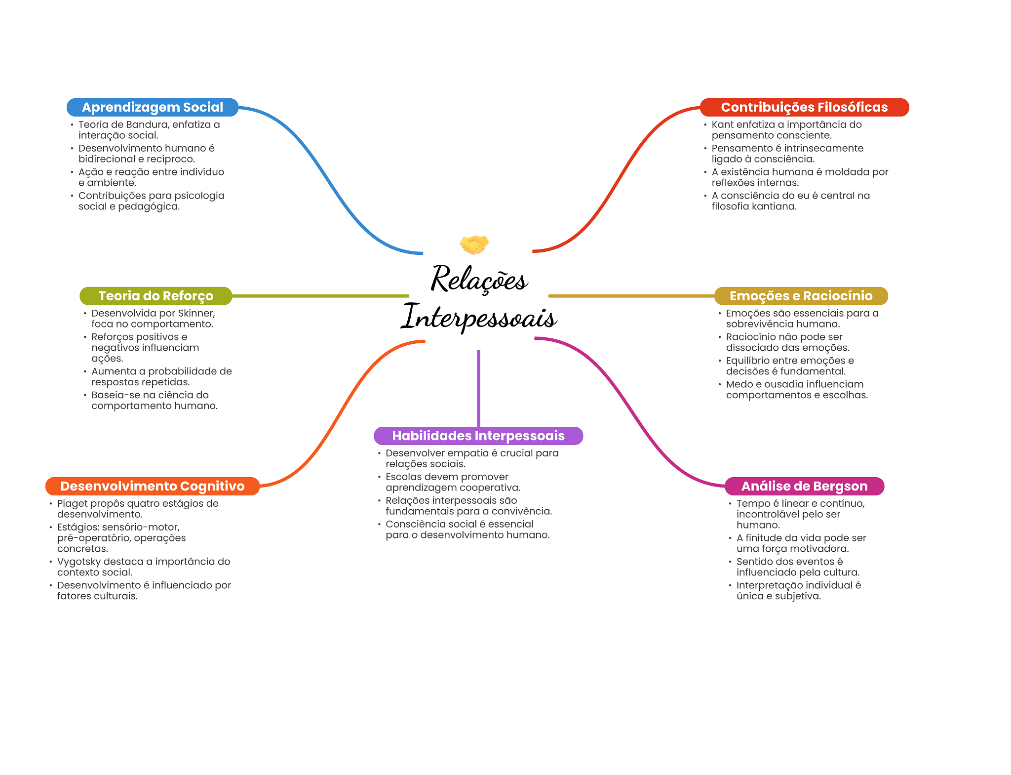 Aprendizagem Social Contribuições Filosóficas Teoria de Bandura, enfatiza a Kant enfatiza a importância do interação social. pensamento consciente. Desenvolvimento humano é Pensamento é intrinsecamente bidirecional e recíproco. ligado à consciência. Ação e reação entre indivíduo A existência humana é moldada por e ambiente. reflexões internas. Contribuições para psicologia A consciência do eu é central na social e pedagógica. filosofia kantiana. Relações Teoria do Reforço Emoções e Raciocínio Desenvolvida por Skinner, Interpessoais Emoções são essenciais para a foca no comportamento. sobrevivência humana. Reforços positivos e Raciocínio não pode ser negativos influenciam dissociado das emoções. ações. Equilíbrio entre emoções e Aumenta a probabilidade de decisões é fundamental. respostas repetidas. Medo e ousadia influenciam Baseia-se na ciência do comportamentos e escolhas. comportamento humano. Habilidades Interpessoais Desenvolver empatia é crucial para relações sociais. Escolas devem promover Desenvolvimento Cognitivo aprendizagem cooperativa. Análise de Bergson Piaget propôs quatro estágios de Relações interpessoais são Tempo é linear e contínuo, desenvolvimento. fundamentais para a convivência. incontrolável pelo ser Estágios: sensório-motor, Consciência social é essencial humano. pré-operatório, operações para desenvolvimento humano. A finitude da vida pode ser concretas. uma força motivadora. Vygotsky destaca a importância do Sentido dos eventos é contexto social. influenciado pela cultura. Desenvolvimento é influenciado por Interpretação individual é fatores culturais. única e subjetiva.