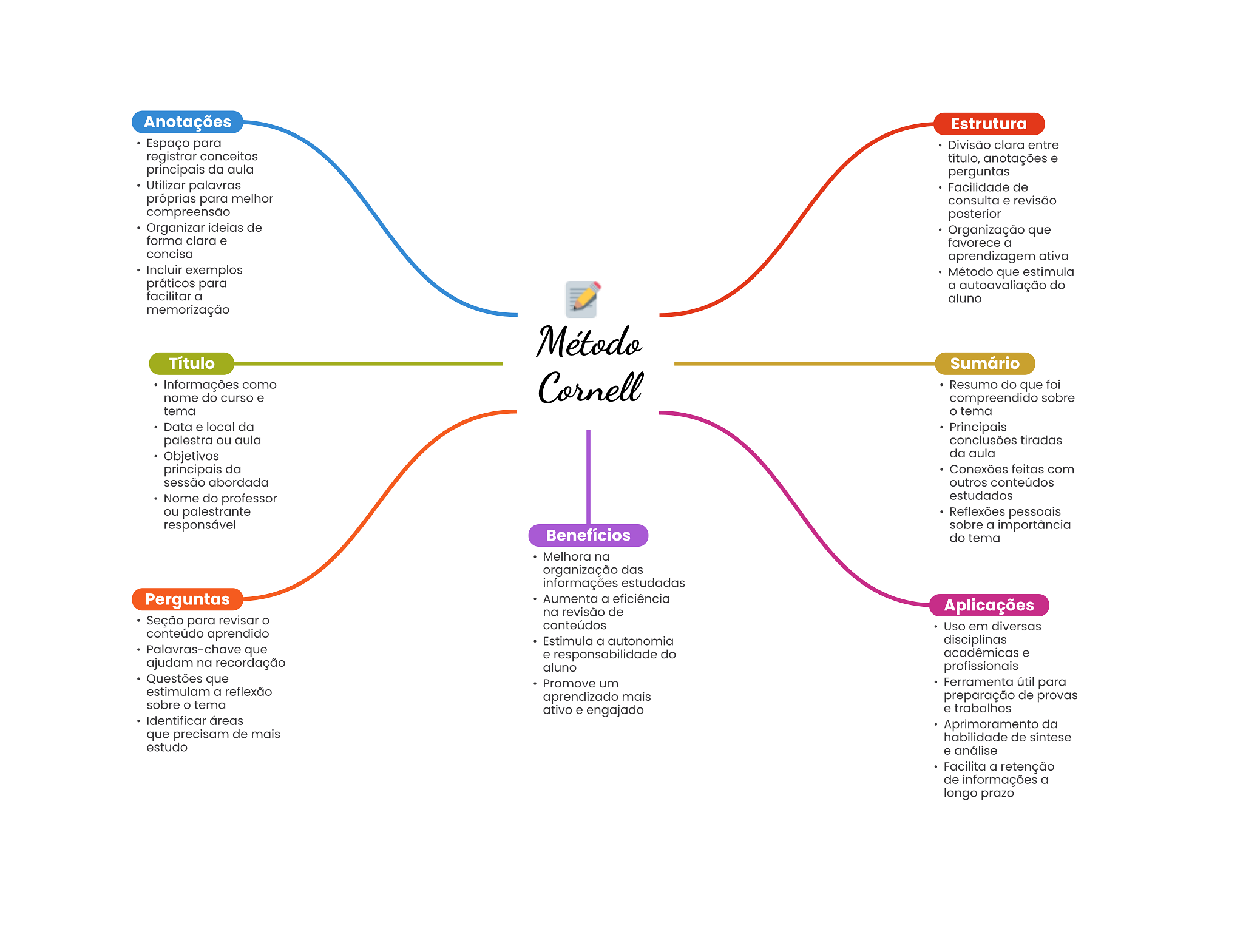 Anotações Estrutura Espaço para Divisão clara entre registrar conceitos título, anotações e principais da aula perguntas Utilizar palavras Facilidade de próprias para melhor consulta e revisão compreensão posterior Organizar ideias de Organização que forma clara e favorece a concisa aprendizagem ativa Incluir exemplos Método que estimula práticos para a autoavaliação do facilitar a aluno memorização Método Título Sumário Informações como nome do curso e Cornell Resumo do que foi compreendido sobre tema O tema Data e local da Principais palestra ou aula conclusões tiradas Objetivos da aula principais da Conexões feitas com sessão abordada outros conteúdos Nome do professor estudados ou palestrante Reflexões pessoais responsável sobre a importância Benefícios do tema Melhora na organização das informações estudadas Perguntas Aumenta a eficiência na revisão de Aplicações Seção para revisar conteúdos Uso em diversas conteúdo aprendido Estimula a autonomia disciplinas Palavras-chave que e responsabilidade do acadêmicas e ajudam na recordação aluno profissionais Questões que Promove um Ferramenta útil para estimulam a reflexão aprendizado mais preparação de provas sobre tema ativo e engajado e trabalhos Identificar áreas Aprimoramento da que precisam de mais habilidade de síntese estudo e análise Facilita a retenção de informações a longo prazo