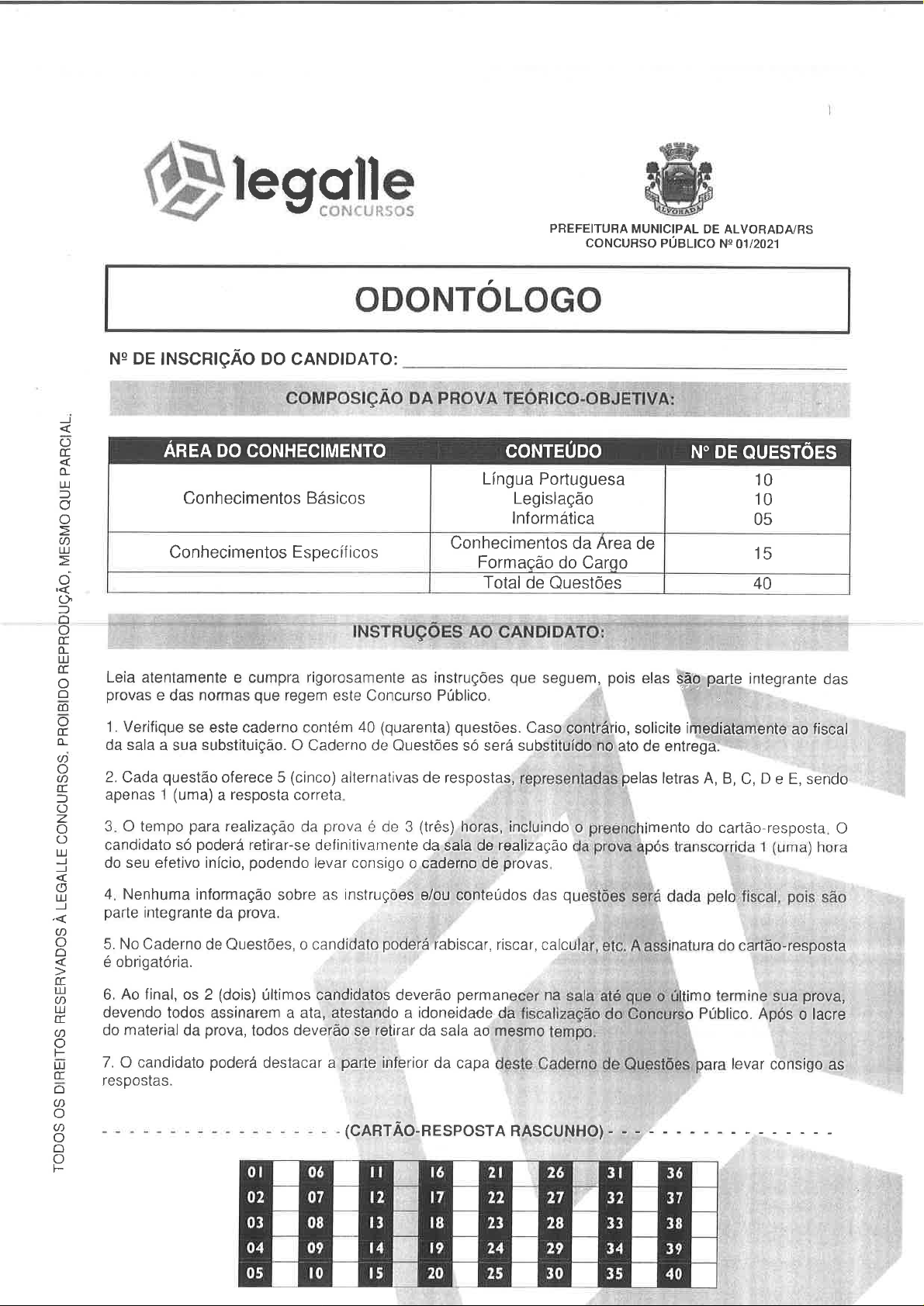 legalle CONCURSOS PREFEITURA MUNICIPAL DE ALVORADA/RS CONCURSO PÚBLICO 01/2021 ODONTÓLOGO № DE INSCRIÇÃO DO CANDIDATO: COMPOSIÇÃO DA PROVA ÁREA DO CONHECIMENTO CONTEÚDO N° DE QUESTÕES Língua Portuguesa 10 Conhecimentos Básicos Legislação 10 Informática 05 Conhecimentos da Área de Conhecimentos Específicos 15 Formação do Cargo TODOS OS DIREITOS RESERVADOS À LEGALLE CONCURSOS. PROIBIDO REPRODUÇÃO, MESMO QUE Total de Questões 40 INSTRUÇÕES CANDIDATO: Leia atentamente e cumpra rigorosamente as instruções que seguem, pois elas são parte integrante das provas e das normas que regem este Concurso Público. 1. Verifique se este caderno contém 40 (quarenta) questões. Caso contrário, solicite imediatamente ao fiscal da sala a sua substituição. O Caderno de Questões só será substituído no ato de entrega. 2. Cada questão oferece 5 (cinco) alternativas de respostas, representadas pelas letras A, B, C, D e E, sendo apenas 1 (uma) a resposta correta. 3. O tempo para realização da prova é de 3 (três) horas, incluindo preenchimento do O candidato só poderá retirar-se definitivamente da sala de realização da prova após transcorrida 1 (uma) hora do seu efetivo início, podendo levar consigo caderno de 4. Nenhuma informação sobre as instruções e/ou conteúdos das questões será dada pelo fiscal, pois são parte integrante da prova. 5. No Caderno de Questões, 0 candidato poderá rabiscar, riscar, calcular, etc. A assinatura do cartão-resposta é obrigatória. 6. Ao final, os 2 (dois) últimos candidatos deverão permanecer na sala até que o último termine sua prova, devendo todos assinarem a ata, atestando a idoneidade da fiscalização do Concurso Público. Após lacre do material da prova, todos deverão se retirar da sala ao mesmo tempo. 7. O candidato poderá destacar a parte inferior da capa deste Caderno de Questões para levar consigo as respostas. (CARTÃO-RESPOSTA RASCUNHO) 01 06 16 21 26 31 36 02 07 12 17 22 27 32 37 03 08 13 18 23 28 33 38 04 09 14 19 24 29 34 39 05 10 15 20 25 30 35 40CONHECIMENTOS BÁSICOS Questão 04. Se o trecho não podemos lembrar tudo fosse reescrito no pretérito imperfeito do indicativo LÍNGUA PORTUGUESA como ficaria? Para responder às questões de 01 a 10, leia texto abaixo. (A) Não pudéramos lembrar de tudo. (B) Não podíamos lembrar de tudo. Os usos do esquecimento (C) Não pudemos lembrar de tudo. 1 Se há coisa que as pessoas temem é a perda (D) Não poderemos lembrar de tudo. 2 da memória. Esquecer nomes, rostos, números de (E) Não poderíamos lembrar de tudo. 3 telefone é uma ameaça que vai crescendo 4 exponencialmente com a idade até se transformar em Questão 05. Considere seguintes termos: I. Memória; II. 5 pânico. O que gerou uma verdadeira indústria da Esquecimento; III. Lembrar; IV. Mnemônica; V. Proteção. 6 memória. O Renascimento especializou-se em 7 técnicas mnemônicas. Uma delas era "teatro da Pertencem ao mesmo campo semântico: 8 esta concebida como uma espécie de 9 anfiteatro: em cada fileira eram acomodadas ideias ou (A) Apenas e IV. 10 recordações devidamente agrupadas. Depois, (B) Apenas I, II e III. 11 surgiram as substâncias químicas. (C) Apenas IV e V. 12 Mas será que esquecer é mesmo tão ruim? (D) Apenas 1, II, III e IV. 13 Será que não existe um uso no esquecimento? (E) I, II, III, IV e V. 14 A verdade é que não podemos lembrar tudo, Questão 06. Acerca do prefixo anfi-, presente na palavra 15 e o esquecimento seria uma proteção contra a anfiteatro é CORRETO afirmar que: 16 sobrecarga. Também é verdade que não precisamos 17 lembrar tudo: existem agendas, existem cadernetas, (A) Está presente também na palavra anfíbio. 18 existem gravadores, fotos, vídeos. A aflição que uma (B) É sinônimo do prefixo anti- 19 pessoa sente por esquecer é, não raro, um prejuízo 20 maior do que o próprio esquecimento. É muito melhor (C) Significa "contra". (D) Significa "início". 21 dizer algo como "desculpe, esqueci seu nome", do (E) É sinônimo do sufixo -ção. 22 que ficar suando frio e escavando em vão a memória. Autor: Moacyr Scliar (adaptado). Questão 07. Considerando exposto no primeiro parágrafo do texto, analise as assertivas a seguir e julgue V, para as Questão 01. O texto acima apresenta um questionamento verdadeiras, e F, para as falsas. acerca da(o): (A) Crescente perda de memória entre as pessoas. ( ) O pânico do esquecimento contribuiu para o desen- (B) Medo exagerado de perder a memória. volvimento da indústria da memória. (C) Renascimento. ( ) A indústria da memória é uma ameaça que cresce expo- (D) Indústria química. nencialmente. (E) Uso de cadernetas, gravadores, fotos e vídeos. ( ) Esquecer nomes e números contribuiu diretamente Questão 02. Quanto à função das aspas que ocorrem no para surgimento das indústrias em geral. primeiro caso, nas linhas 7 e 8, e, no segundo caso, na linha ( ) As pessoas começaram a perder a memória no Re- nascimento. 21, assinale a alternativa CORRETA. (A) No primeiro caso, expressam a denominação de uma Qual alternativa preenche, CORRETAMENTE, de cima técnica mnemônica; no segundo caso, expressam para baixo, OS parênteses acima? uma fala (B) No primeiro caso, expressam o título de um livro; no (A) V-F-F-V segundo caso, expressam uma citação real. (B) F-F-V-V (C) No primeiro caso, expressam uma dúvida; no (C) segundo caso, expressam ironia. (D) F F F (D) No primeiro caso, expressam o nome de um teatro (E) V-F-V-V famoso; no segundo caso, registro de uma conversa. Questão 08. Considere o período a seguir: A aflição que (E) No primeiro caso, expressam ironia; no segundo uma pessoa sente por esquecer é, não raro, um caso, demarcam uma citação literal. prejuízo maior do que o próprio esquecimento Questão 03. A frase Será que não existe um uso no esquecimento? poderia ser reescrita, sem perda Das alternativas abaixo, a ÚNICA que poderia substituir de seu significado