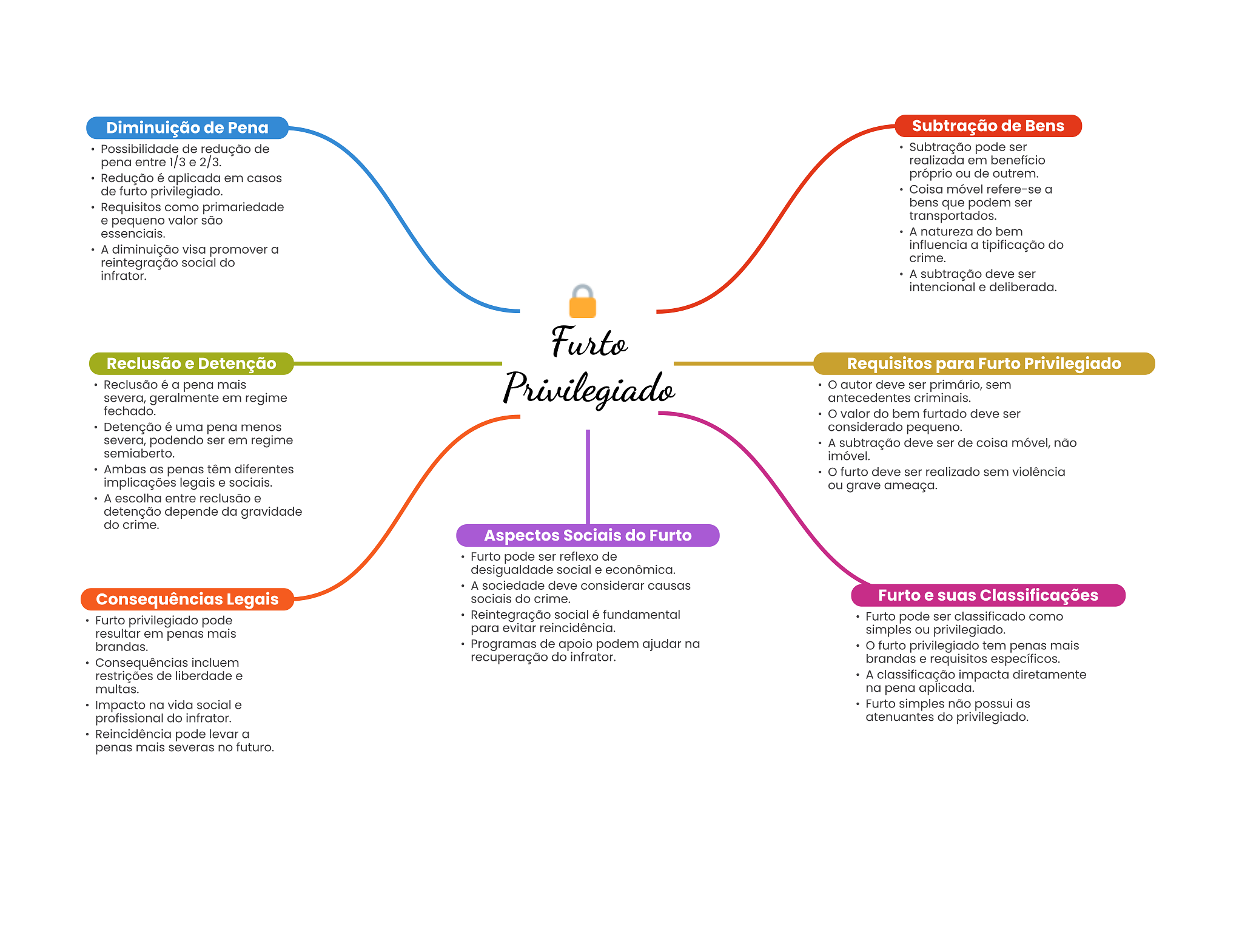 Diminuição de Pena Subtração de Bens Possibilidade de redução de Subtração pode ser pena entre 1/3 e 2/3. realizada em benefício Redução é aplicada em casos próprio ou de outrem. de furto privilegiado. Coisa móvel refere-se a Requisitos como primariedade bens que podem ser e pequeno valor são transportados. essenciais. A natureza do bem A diminuição visa promover a influencia a tipificação do reintegração social do crime. infrator. A subtração deve ser intencional e deliberada. Furto Reclusão e Detenção Requisitos para Furto Privilegiado Reclusão é a pena mais severa, geralmente em regime Privilegiado autor deve ser primário, sem antecedentes criminais. fechado. valor do bem furtado deve ser Detenção é uma pena menos considerado pequeno. severa, podendo ser em regime A subtração deve ser de coisa móvel, não semiaberto. imóvel. Ambas as penas têm diferentes furto deve ser realizado sem violência implicações legais e sociais. ou grave ameaça. A escolha entre reclusão e detenção depende da gravidade do crime. Aspectos Sociais do Furto Furto pode ser reflexo de desigualdade social e econômica. A sociedade deve considerar causas Consequências Legais sociais do crime. Furto e suas Classificações Furto privilegiado pode Reintegração social é fundamental Furto pode ser classificado como resultar em penas mais para evitar reincidência. simples ou privilegiado. brandas. Programas de apoio podem ajudar na furto privilegiado tem penas mais Consequências incluem recuperação do infrator. brandas e requisitos específicos. restrições de liberdade e A classificação impacta diretamente multas. na pena aplicada. Impacto na vida social e Furto simples não possui as profissional do infrator. atenuantes do privilegiado. Reincidência pode levar a penas mais severas no futuro.