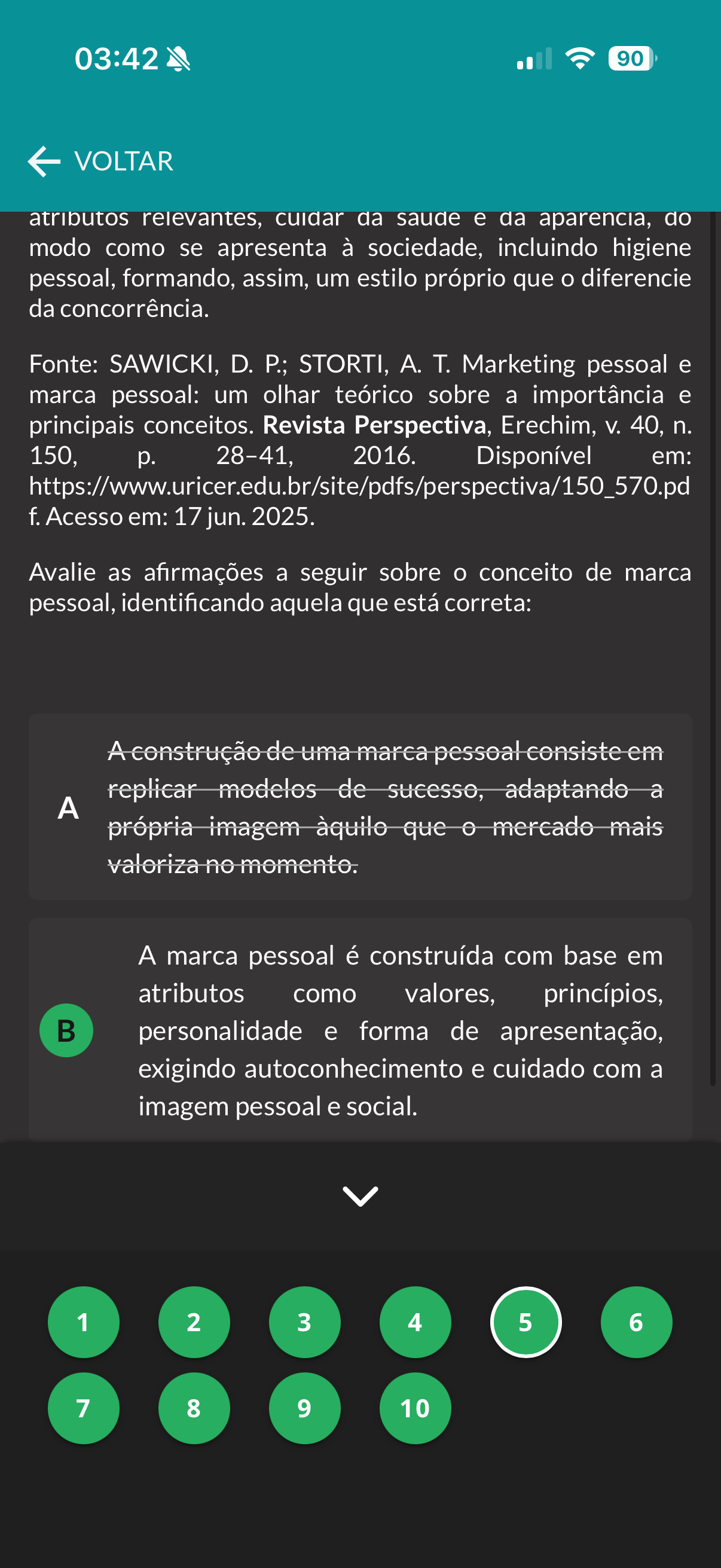 03:42 90 VOLTAR atributos relevantes, cuidar da saude e da aparencia, do modo como se apresenta à sociedade, incluindo higiene pessoal, formando, assim, um estilo próprio que diferencie da concorrência. Fonte: SAWICKI, D. P.; STORTI, A. T. Marketing pessoal e marca pessoal: um olhar teórico sobre a importância e principais conceitos. Revista Perspectiva, Erechim, V. 40, n. 150, p. 28-41, 2016. Disponível em: https://www.uricer.edu.br/site/pdfs/perspectiva/150_570pd f. Acesso em: 17 jun. 2025. Avalie as afirmações a seguir sobre conceito de marca pessoal, identificando aquela que está correta: A construção de uma marca pessoal consiste em replicar modelos de sucesso, adaptando a A própria imagem àquilo que mercado mais valoriza no momento. A marca pessoal é construída com base em atributos como valores, princípios, B personalidade e forma de apresentação, exigindo autoconhecimento e cuidado com a imagem pessoal e social. 1 2 3 4 5 6 7 8 9 10