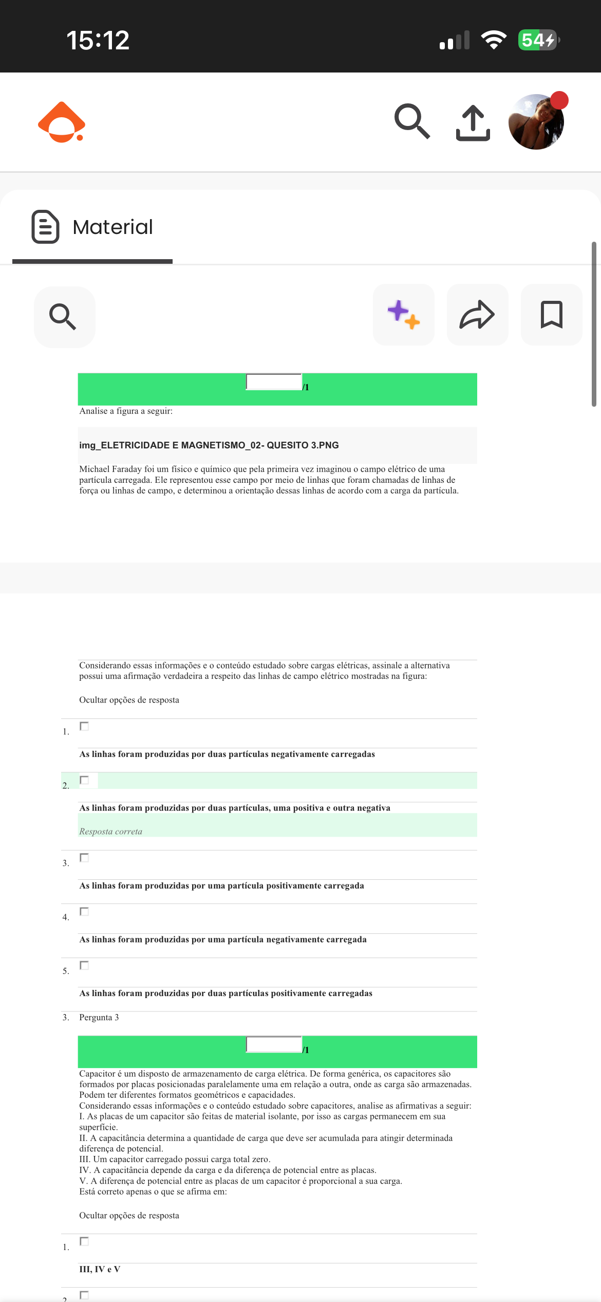 15:12 544 Material Analise a figura a seguir: img_ELETRICIDADE MAGNETISMO_02- QUESITO 3.PNG Michael Faraday foi um físico e químico que pela primeira vez imaginou campo elétrico de uma partícula carregada. Ele representou esse campo por meio de linhas que foram chamadas de linhas de força ou linhas de campo, e determinou a orientação dessas linhas de acordo com a carga da partícula. Considerando essas informações e conteúdo estudado sobre cargas elétricas, assinale a alternativa possui uma afirmação verdadeira a respeito das linhas de campo elétrico mostradas na figura: Ocultar opções de resposta 1. As linhas foram produzidas por duas partículas negativamente carregadas 2. As linhas foram produzidas por duas partículas, uma positiva e outra negativa Resposta correta 3. As linhas foram produzidas por uma partícula positivamente carregada 4. As linhas foram produzidas por uma partícula negativamente carregada 5. As linhas foram produzidas por duas partículas positivamente carregadas 3. Pergunta 3 1 Capacitor é um disposto de de carga elétrica. De forma genérica, os capacitores são formados por placas posicionadas paralelamente uma em relação a outra, onde as carga são armazenadas. Podem ter diferentes formatos geométricos e capacidades. Considerando essas informações e o conteúdo estudado sobre capacitores, analise as afirmativas a seguir: I. As placas de um capacitor são feitas de material isolante, por isso as cargas permanecem em sua superficie. II. A capacitância determina a quantidade de carga que deve ser acumulada para atingir determinada diferença de potencial. III. Um capacitor carregado possui carga total zero. IV. A capacitância depende da carga e da diferença de potencial entre as placas. V.A diferença de potencial entre as placas de um capacitor é proporcional a sua carga. Está correto apenas que se afirma em: Ocultar opções de resposta 1. III, IV V