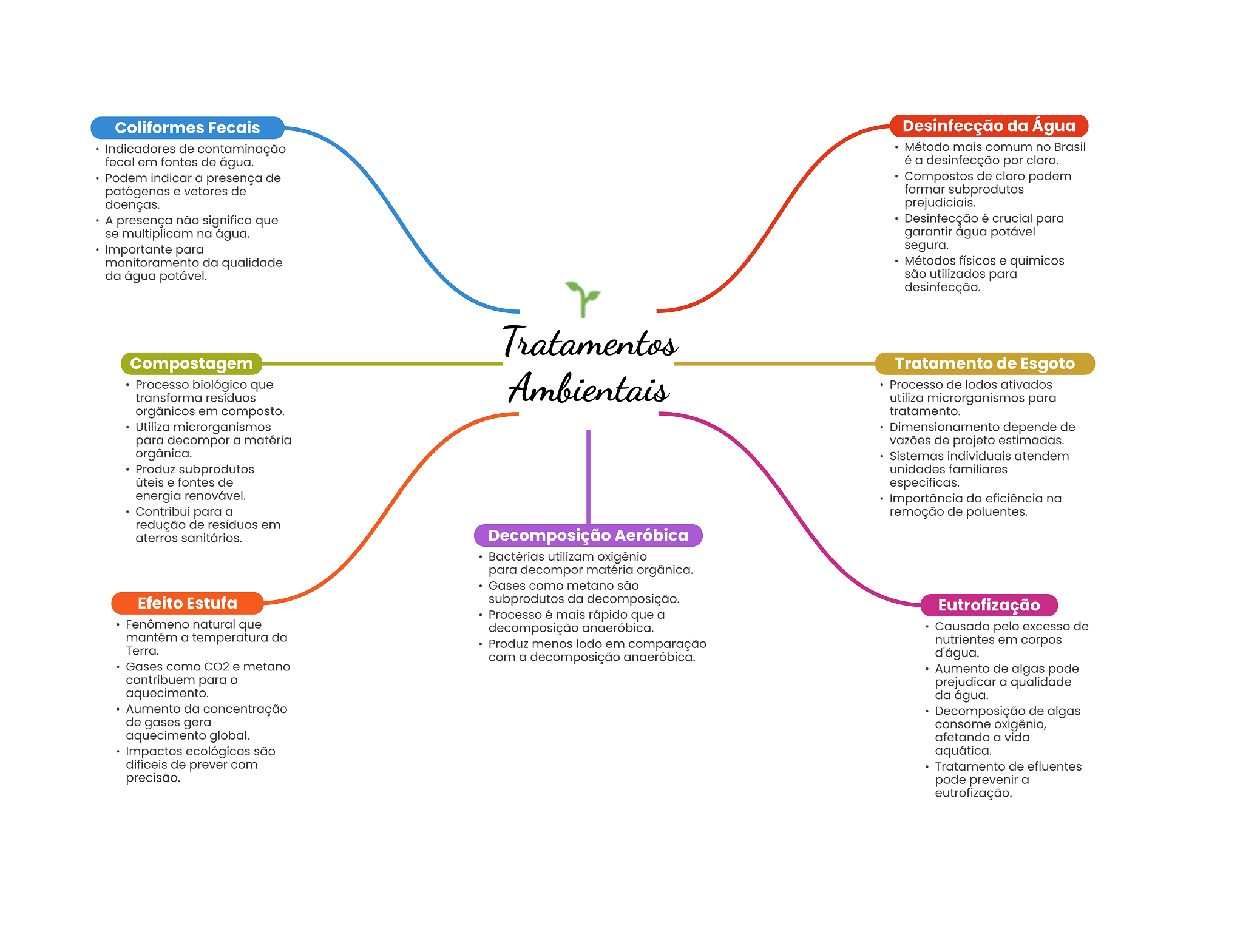 Coliformes Fecais Desinfecção da Água Indicadores de contaminação Método mais comum no Brasil fecal em fontes de água. é a desinfecção por cloro. Podem indicar a presença de Compostos de cloro podem patógenos e vetores de formar subprodutos doenças. prejudiciais. A presença não significa que Desinfecção é crucial para se multiplicam na água. garantir água potável Importante para segura. monitoramento da qualidade Métodos físicos e químicos da água potável. são utilizados para desinfecção. Tratamentos Compostagem Tratamento de Esgoto Processo biológico que Ambientais Processo de lodos ativados transforma resíduos utiliza microrganismos para orgânicos em composto. tratamento. Utiliza microrganismos Dimensionamento depende de para decompor a matéria vazões de projeto estimadas. orgânica. Sistemas individuais atendem Produz subprodutos unidades familiares úteis e fontes de específicas. energia renovável. Importância da eficiência na Contribui para a remoção de poluentes. redução de resíduos em aterros sanitários. Decomposição Aeróbica Bactérias utilizam oxigênio para decompor matéria orgânica. Gases como metano são Efeito Estufa subprodutos da decomposição. Eutrofização Processo é mais rápido que a Fenômeno natural que decomposição anaeróbica. Causada pelo excesso de mantém a temperatura da Terra. Produz menos lodo em comparação nutrientes em corpos com a decomposição anaeróbica. d'água. Gases como CO2 e metano Aumento de algas pode contribuem para prejudicar a qualidade aquecimento. da água. Aumento da concentração Decomposição de algas de gases gera consome oxigênio, aquecimento global. afetando a vida Impactos ecológicos são aquática. difíceis de prever com Tratamento de efluentes precisão. pode prevenir a eutrofização.