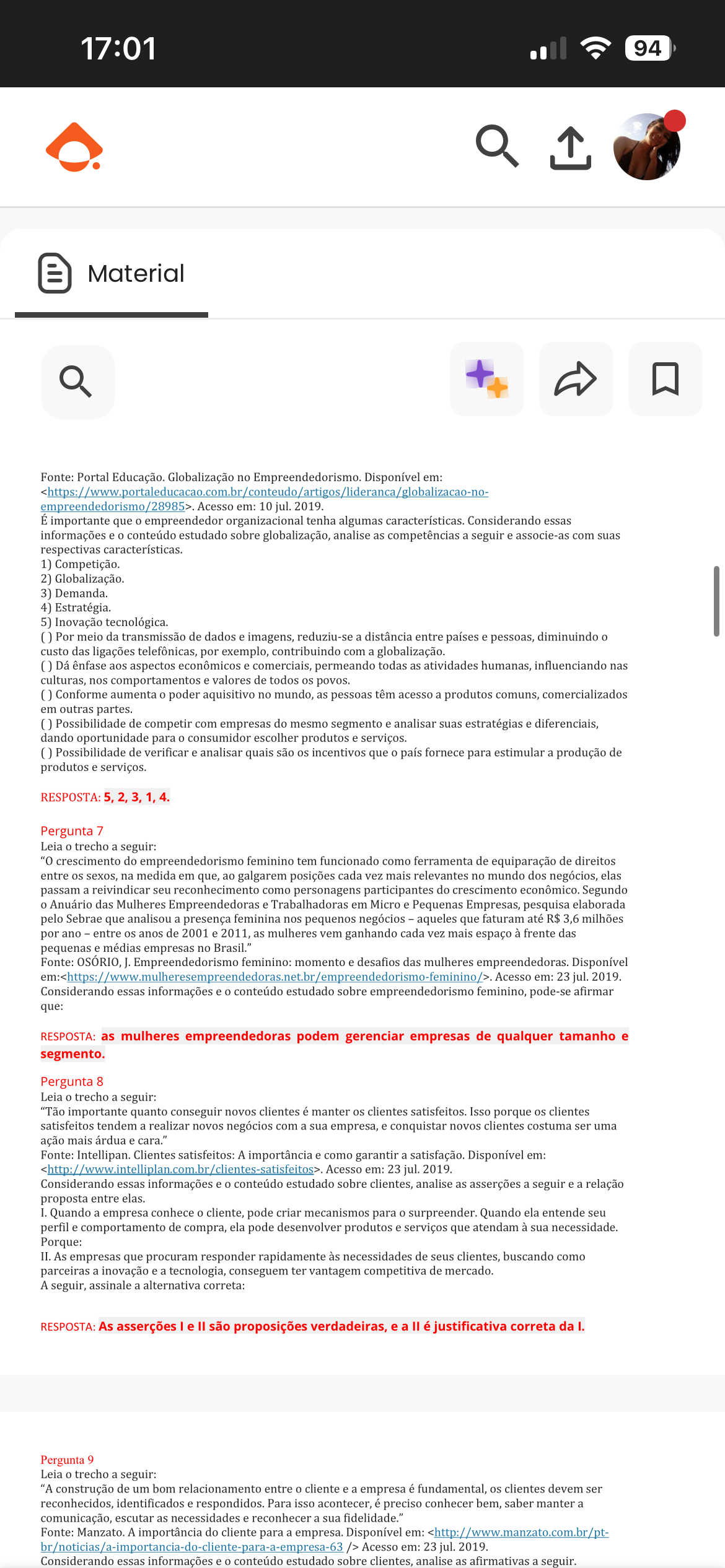 17:01 94 Material Fonte: Portal Educação. Globalização no Empreendedorismo. Disponível em: .Acesso em: 23 jul. 2019. Considerando essas informações e conteúdo estudado sobre empreendedorismo feminino, pode-se afirmar que: RESPOSTA: as mulheres empreendedoras podem gerenciar empresas de qualquer tamanho e segmento. Pergunta 8 Leia 0 trecho a seguir: "Tão importante quanto conseguir novos clientes é manter os clientes satisfeitos. Isso porque os clientes satisfeitos tendem a realizar novos negócios com a sua empresa, e conquistar novos clientes costuma ser uma ação mais árdua e cara." Fonte: Intellipan. Clientes satisfeitos: A importância e como garantir a satisfação. Disponível em: . Acesso em: 23 jul. 2019. Considerando essas informações e conteúdo estudado sobre clientes, analise as asserções a seguir e a relação proposta entre elas. I. Quando a empresa conhece cliente, pode criar mecanismos para surpreender. Quando ela entende seu perfil e comportamento de compra, ela pode desenvolver produtos e serviços que atendam à sua necessidade. Porque: II. As empresas que procuram responder rapidamente às necessidades de seus clientes, buscando como parceiras a inovação e a tecnologia, conseguem ter vantagem competitiva de mercado. A seguir, assinale a alternativa correta: RESPOSTA: As asserções I e II são proposições verdadeiras, e a II é justificativa correta da I. Pergunta 9 Leia trecho a seguir: "A construção de um bom relacionamento entre cliente e a empresa é fundamental, os clientes devem ser reconhecidos, identificados e respondidos. Para isso acontecer, é preciso conhecer bem, saber manter a comunicação, escutar as necessidades e reconhecer a sua fidelidade." Fonte: Manzato. A importância do cliente para a empresa. Disponível em: /> Acesso em: 23 jul. 2019. Considerando essas informações e conteúdo estudado sobre clientes, analise as afirmativas a seguir.