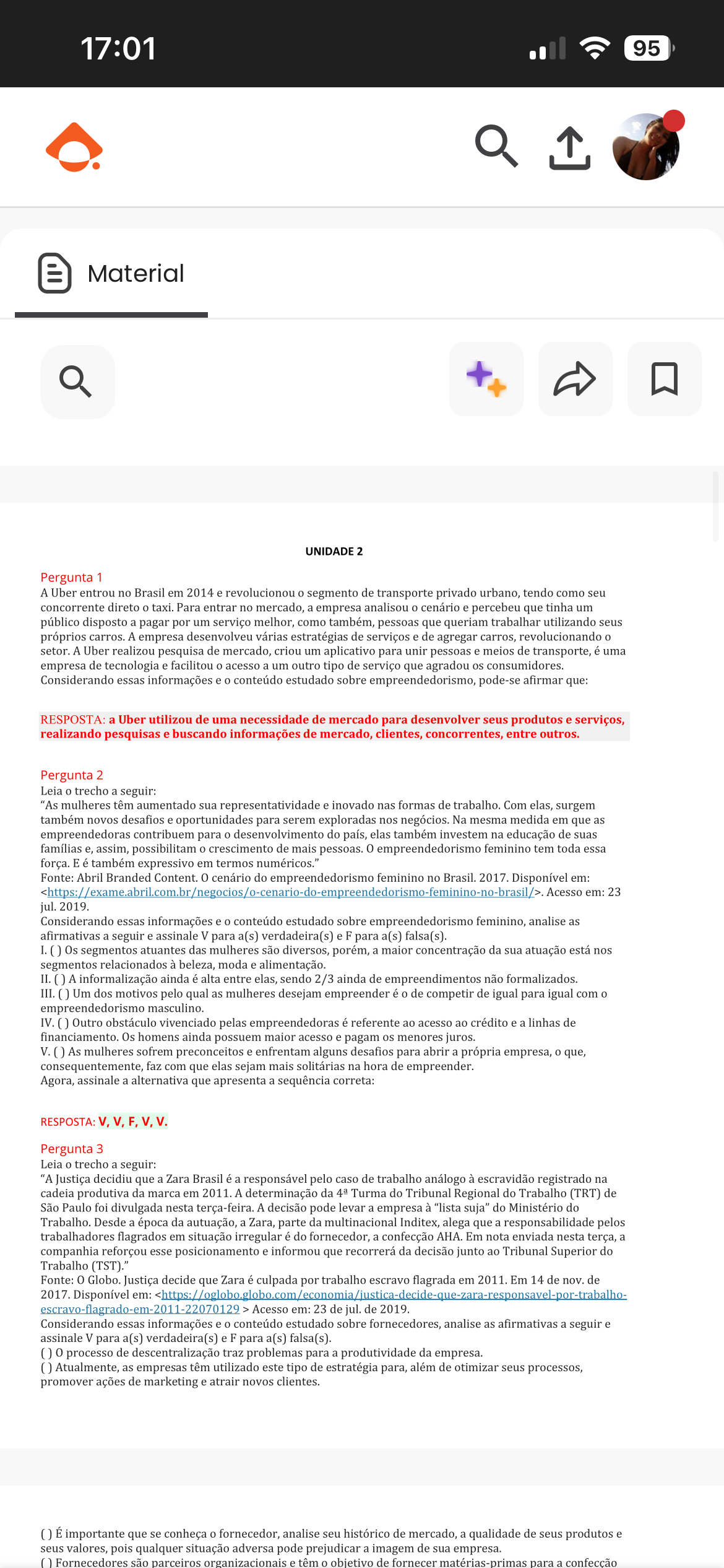 17:01 95 Material UNIDADE 2 Pergunta 1 A Uber entrou no Brasil em 2014 e revolucionou segmento de transporte privado urbano, tendo como seu concorrente direto taxi. Para entrar no mercado, a empresa analisou cenário e percebeu que tinha um público disposto a pagar por um serviço melhor, como também, pessoas que queriam trabalhar utilizando seus próprios carros. A empresa desenvolveu várias estratégias de serviços e de agregar carros, revolucionando setor. A Uber realizou pesquisa de mercado, criou um aplicativo para unir pessoas e meios de transporte, é uma empresa de tecnologia e facilitou acesso a um outro tipo de serviço que agradou os consumidores. Considerando essas informações e conteúdo estudado sobre empreendedorismo, pode-se afirmar que: RESPOSTA: a Uber utilizou de uma necessidade de mercado para desenvolver seus produtos e serviços, realizando pesquisas e buscando informações de mercado, clientes, concorrentes, entre outros. Pergunta 2 Leia trecho a seguir: "As mulheres têm aumentado sua representatividade e inovado nas formas de trabalho. Com elas, surgem também novos desafios e oportunidades para serem exploradas nos negócios. Na mesma medida em que as empreendedoras contribuem para 0 desenvolvimento do país, elas também investem na educação de suas famílias e, assim, possibilitam crescimento de mais pessoas. 0 empreendedorismo feminino tem toda essa força. E é também expressivo em termos numéricos." Fonte: Abril Branded Content. 0 cenário do empreendedorismo feminino no Brasil. 2017. Disponível em: .Aceso em: 23 jul. 2019. Considerando essas informações e conteúdo estudado sobre empreendedorismo feminino, analise as afirmativas a seguir e assinale V para a(s) verdadeira(s) e F para a(s) falsa(s). I. Os segmentos atuantes das mulheres são diversos, porém, a maior concentração da sua atuação está nos segmentos relacionados à beleza, moda e alimentação. II. A informalização ainda é alta entre elas, sendo 2/3 ainda de empreendimentos não formalizados. III. Um dos motivos pelo qual as mulheres desejam empreender é 0 de competir de igual para igual com empreendedorismo masculino. IV. Outro obstáculo vivenciado pelas empreendedoras é referente ao acesso ao crédito e a linhas de financiamento. Os homens ainda possuem maior acesso e pagam os menores juros. V. As mulheres sofrem preconceitos e enfrentam alguns desafios para abrir a própria empresa, que, consequentemente, faz com que elas sejam mais solitárias na hora de empreender. Agora, assinale a alternativa que apresenta a sequência correta: RESPOSTA: V,V,F,V,V. Pergunta 3 Leia trecho a seguir: "A Justiça decidiu que a Zara Brasil é a responsável pelo caso de trabalho análogo à escravidão registrado na cadeia produtiva da marca em 2011. A determinação da Turma do Tribunal Regional do Trabalho (TRT) de São Paulo foi divulgada nesta terça-feira. A decisão pode levar a empresa à "lista suja" do Ministério do Trabalho. Desde a época da autuação, a Zara, parte da multinacional Inditex, alega que a responsabilidade pelos trabalhadores flagrados em situação irregular é do fornecedor, a confecção AHA. Em nota enviada nesta terça, a companhia reforçou esse posicionamento e informou que recorrerá da decisão junto ao Tribunal Superior do Trabalho (TST)." Fonte: Globo. Justiça decide que Zara é culpada por trabalho escravo flagrada em 2011. Em 14 de nov. de 2017. Disponível em: Acesso em: 23 de jul. de 2019. Considerando essas informações e conteúdo estudado sobre fornecedores, analise as afirmativas a seguir e assinale V para a(s) verdadeira(s) e F para a(s) falsa(s). processo de descentralização traz problemas para a produtividade da empresa. Atualmente, as empresas têm utilizado este tipo de estratégia para, além de otimizar seus processos, promover ações de marketing e atrair novos clientes. () É importante que se conheça fornecedor, analise seu histórico de mercado, a qualidade de seus produtos e seus valores, pois qualquer situação adversa pode prejudicar a imagem de sua empresa. Fornecedores são parceiros organizacionais e têm objetivo de fornecer matérias-primas para a confecção