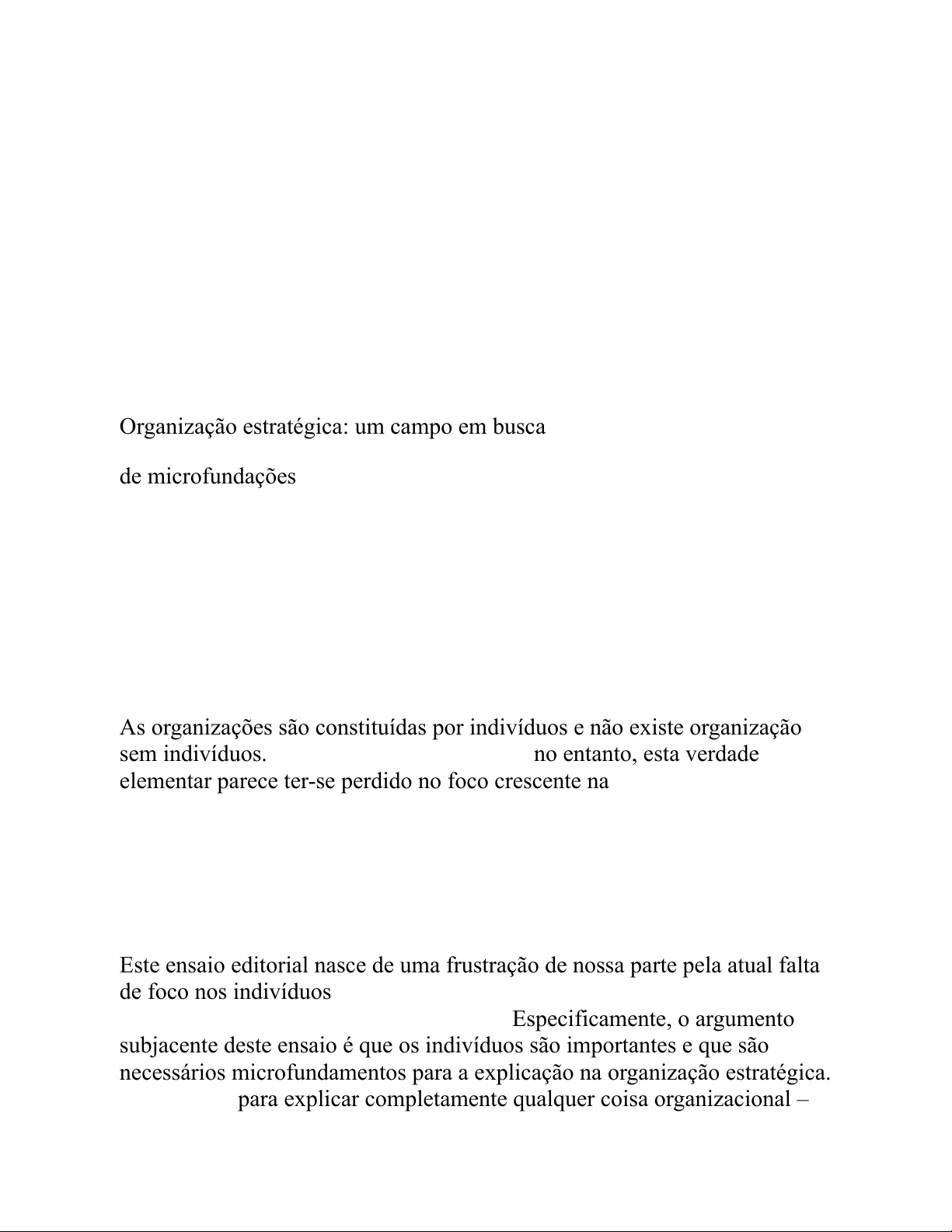 ORGANIZAÇÃO ESTRATÉGICA Vol 3(4): 441–455 DOI: 10.1177/1476127005055796 Copyright ©2005 Sage Publications (Londres,Thousand Oaks, CA e Nova Delhi) http://soq.sagepub.com ENTÃO ! A P B OX E D I TO R I A L E S S AY Organização estratégica: um campo em busca de microfundações pegadinha felina Universidade Brigham Young, EUA Nicolai J. Foss Escola de Negócios de Copenhague, Dinamarca As organizações são constituídas por indivíduos e não existe organização sem indivíduos. Não há nada tão elementar; no entanto, esta verdade elementar parece ter-se perdido no foco crescente na estrutura, nas rotinas, nas capacidades, na cultura, nas instituições e em várias outras conceptualizações colectivas em grande parte da investigação recente sobre organizações estratégicas. Não é exagero dizer que a “organização” geralmente entrou no campo da estratégia na forma de vários conceitos agregados. Este ensaio editorial nasce de uma frustração de nossa parte pela atual falta de foco nos indivíduos em grande parte da organização estratégica e pelo status dado como certo de “organização”. Especificamente, o argumento subjacente deste ensaio é que os indivíduos são importantes e que são necessários microfundamentos para a explicação na organização estratégica. Na verdade, para explicar completamente qualquer coisa organizacional – simone teixeira Destacar simone teixeira Destacar simone teixeira Destacar simone teixeira Destacar simone teixeira Destacar simone teixeira Destacar seja identidade, aprendizagem, conhecimento ou capacidades – é preciso fundamentalmente começar e compreender os indivíduos que compõem o todo, especificamente a sua natureza subjacente, escolhas, habilidades, propensões, heterogeneidade, propósitos, expectativas e motivações. . Embora o uso do termo 'organizacional' possa servir como um atalho útil para fins de discussão e para análise empírica de forma reduzida, explicar verdadeiramente (além das correlações) a organização (por exemplo, existência, declínio, capacidade ou desempenho), ou qualquer coletivo nesse sentido, requer começando com o indivíduo como ator central. Nosso foco particular neste ensaio está na literatura baseada em capacidades organizacionais em gestão estratégica. Este foco serve como um exemplo específico de um problema mais geral de falta de atenção aos indivíduos na organização estratégica. (Implicações mais amplas poderiam ser explicadas com mais espaço.) Como um breve apoio ao fato de que nossa discussão tem ramificações mais amplas, notamos que Selznick também levantou de forma bastante pungente a necessidade de microfundações por parte dos estudiosos institucionais (1996: 274 ). Whetten (2004) também destaca o fato de que os estudiosos raramente são explícitos sobre o que entendem por “organizacional”. 4 4 1 4 4 2 STRA T E G I C O R G A N I Z AT I O N 3 ( 4 ) Nossa esperança é que este ensaio sirva como uma espécie de toque de clarim para que estudiosos de organização estratégica (e mais amplamente organizacional) levem os indivíduos e as microfundações mais a sério (além dos apelos por uma teoria multinível ou 'meso' pesquisar). Apresentamos argumentos e apelamos a uma forma ainda mais forte de individualismo metodológico. É necessário que pintemos com um pincel bastante amplo e admitimos que, em parte, os nossos argumentos são conjecturais e propositadamente provocativos, o que, felizmente, este fórum permite. simone teixeira Destacar simone teixeira Destacar simone teixeira Destacar Começamos com uma breve introdução à literatura baseada nas capacidades organizacionais no que se refere à questão da relação indivíduo- organização, concentrando-nos nas deficiências que resultam de se considerar a “organização” como um dado adquirido. Certamente seria injusto fazermos críticas pesadas à literatura sobre capacidades organizacionais sem apontar direções viáveis e promissoras para pesquisas futuras; assim, também oferecemos uma estrutura conceitual aproximada para pensar sobre a relação indivíduo-organização no que se refere à noção de capacidades organizacionais e aos microfundamentos subjacentes. Coletivismo de capacidades Os estudiosos da estratégia estão cada vez mais convergindo para as capacidades organizacionais como um construto-chave (Eisenhardt e Martin, 2000; Winter, 2003). Com base na lógica baseada em recursos e na noção de rotinas organizacionais, a abordagem das capacidades organizacionais tornou-se uma das formas predominantes de pensar sobre a heterogeneidade e o desempenho na gestão estratégica. Um argumento central do trabalho baseado em capacidades é que as rotinas ou capacidades são as unidades fundamentais de análise e que a organização deve ser conceptualizada como o repositório central de rotinas e capacidades (Nelson e Winter, 1982). No entanto, apesar de mais de duas décadas de trabalho em grande parte teórico (e alguns empíricos), bem como dos esforços recentes para esclarecer os significados das rotinas e capacidades organizacionais (Winter, 2003), questões fundamentais sobre as suas origens, microfundamentos e os fundamentos teóricos e o status empírico ainda persiste. Argumentamos que muitos dos problemas associados ao trabalho baseado em capacidades são resultado do foco em construções de nível coletivo (por exemplo, rotinas, capacidades) em detrimento de considerações de nível individual. Especificamente, uma revisão das principais contribuições das capacidades organizacionais sugere que a abordagem se baseia no coletivismo metodológico (ver a definição de capacidades de Zollo e Winter, 2002: 340), e talvez até numa forma forte do mesmo. Embora indivíduos e gestores sejam mencionados no desenvolvimento teórico, o pressuposto é simone teixeira Destacar simone teixeira Destacar simone teixeira Destacar simone teixeira Destacar que a 