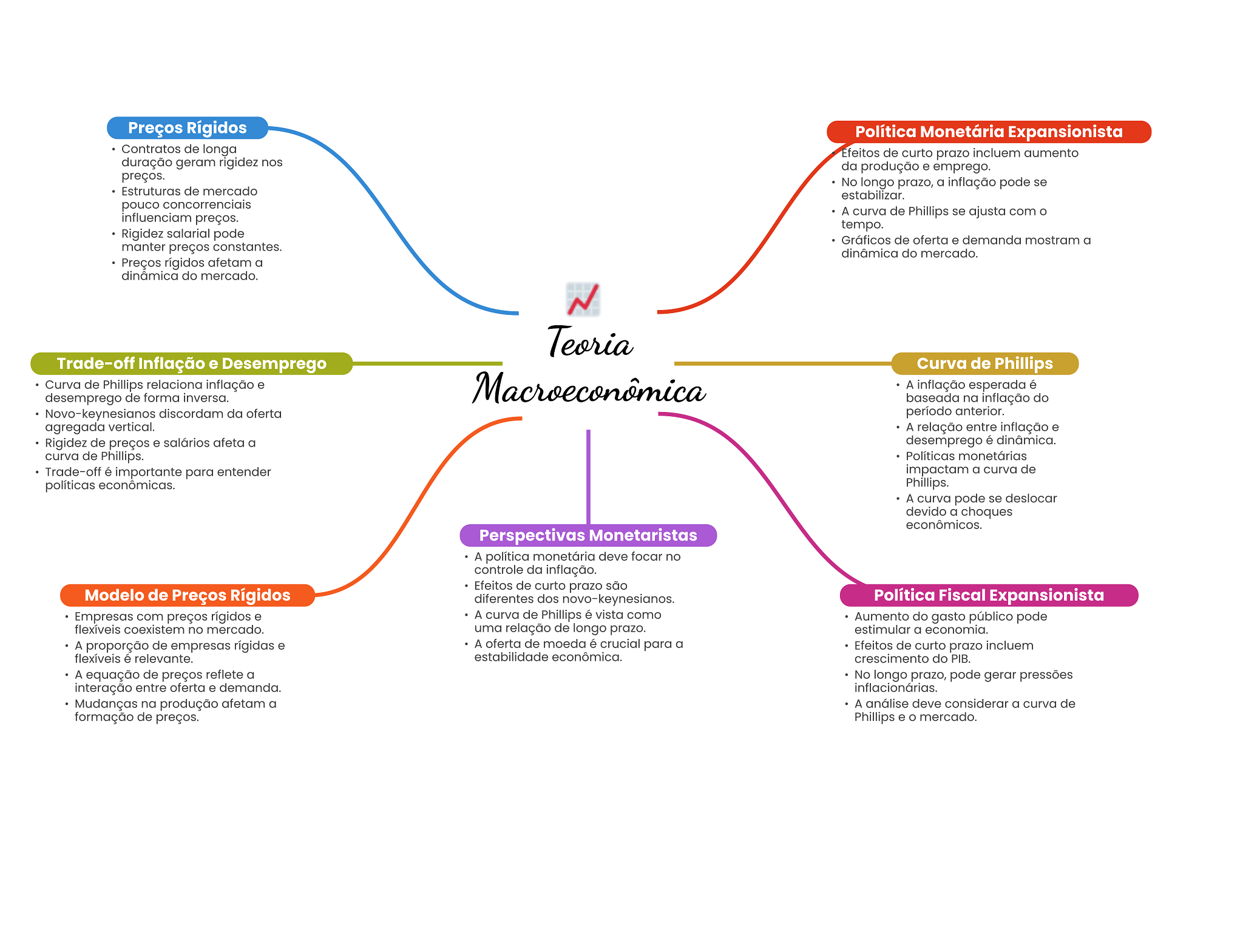 Preços Rígidos Política Monetária Expansionista Contratos de longa Efeitos de curto prazo incluem aumento duração geram rigidez nos da produção e emprego. preços. No longo prazo, a inflação pode se Estruturas de mercado estabilizar. pouco concorrenciais influenciam preços. A curva de Phillips se ajusta com tempo. Rigidez salarial pode Gráficos de oferta e demanda mostram a manter preços constantes. dinâmica do mercado. Preços rígidos afetam a dinâmica do mercado. N Teoria Trade-off Inflação e Desemprego Curva de Phillips Curva de Phillips relaciona inflação e desemprego de forma inversa. Macroeconômica A inflação esperada é baseada na inflação do Novo-keynesianos discordam da oferta período anterior. agregada vertical. A relação entre inflação e Rigidez de preços e salários afeta a desemprego é dinâmica. curva de Phillips. Políticas monetárias Trade-off é importante para entender impactam a curva de políticas econômicas. Phillips. A curva pode se deslocar devido a choques econômicos. Perspectivas Monetaristas A política monetária deve focar no controle da inflação. Efeitos de curto prazo são Modelo de Preços Rígidos diferentes dos novo-keynesianos. Política Fiscal Expansionista Empresas com preços rígidos e A curva de Phillips é vista como Aumento do gasto público pode flexíveis coexistem no mercado. uma relação de longo prazo. estimular a economia. A proporção de empresas rígidas e A oferta de moeda é crucial para a Efeitos de curto prazo incluem é relevante. estabilidade econômica. crescimento do PIB. A equação de preços reflete a No longo prazo, pode gerar pressões interação entre oferta e demanda. inflacionárias. Mudanças na produção afetam a A análise deve considerar a curva de formação de preços. Phillips e mercado.