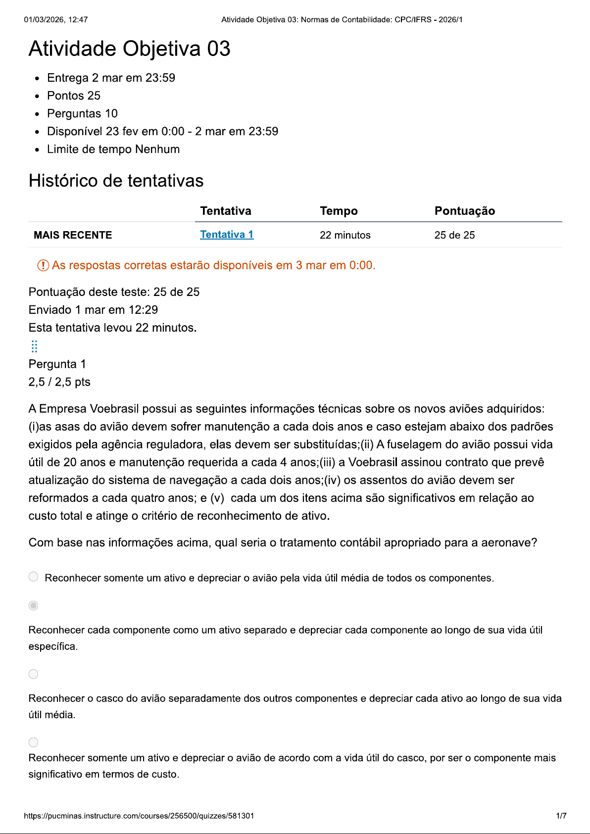 01/03/2026, 12:47 Atividade Objetiva 03: Normas de Contabilidade: CPC/IFRS 2026/1 Atividade Objetiva 03 Entrega 2 mar em 23:59 Pontos 25 Perguntas 10 Disponível 23 fev em 0:00 2 mar em 23:59 Limite de tempo Nenhum Histórico de tentativas Tentativa Tempo Pontuação MAIS RECENTE Tentativa 1 22 minutos 25 de 25 ! As respostas corretas estarão disponíveis em 3 mar em 0:00. Pontuação deste teste: 25 de 25 Enviado 1 mar em 12:29 Esta tentativa levou 22 minutos. Pergunta 1 2,5 / 2,5 pts A Empresa Voebrasil possui as seguintes informações técnicas sobre os novos aviões adquiridos: (i)as asas do avião devem sofrer manutenção a cada dois anos e caso estejam abaixo dos padrões exigidos pela agência reguladora, elas devem ser substituídas;(ii) A fuselagem do avião possui vida útil de 20 anos e manutenção requerida a cada 4 anos;(iii) a Voebrasil assinou contrato que prevê atualização do sistema de navegação a cada dois anos;(iv) os assentos do avião devem ser reformados a cada quatro anos; e (v) cada um dos itens acima são significativos em relação ao custo total e atinge critério de reconhecimento de ativo. Com base nas informações acima, qual seria o tratamento contábil apropriado para a aeronave? Reconhecer somente um ativo e depreciar o avião pela vida útil média de todos os componentes. Reconhecer cada componente como um ativo separado e depreciar cada componente ao longo de sua vida útil específica. Reconhecer o casco do avião separadamente dos outros componentes e depreciar cada ativo ao longo de sua vida útil média. Reconhecer somente um ativo e depreciar o avião de acordo com a vida útil do casco, por ser componente mais significativo em termos de custo. 1/701/03/2026, 12:47 Atividade Objetiva 03: Normas de Contabilidade: CPC/IFRS 2026/1 Justificativa: De acordo com os itens 43 e 44 do CPC 27, cada componente de um item do ativo imobilizado com custo significativo em relação ao custo total do item deve ser depreciado separadamente. Inclusive o item 44 do referido CPC, cita o exemplo de uma aeronave. Pergunta 2 2,5 / 2,5 pts Uma entidade tem uma carteira de ações que é contabilizada como ativos financeiros para venda, sendo ajuste a valor justo computado no resultado do exercício. ajuste a valor justo da carteira de ações é determinado com base no valor de cotação da ação na bolsa de valores de São Paulo na data do balanço patrimonial. Essa mensuração teria a seguinte classificação na hierarquia do valor justo: Nível 3 Nível 1 Não teria classificação Nível 2 Informação do Nível 1, considerando que este é o nível mais alto na hierarquia, classificação essa dada para as mensurações que utilizaram, como informação relevante, preços cotados não ajustados em mercados ativos para ativos (ou passivos) idênticos a que a entidade possa ter acesso na data de mensuração. Pergunta 3 2,5 / 2,5 pts Considerando que unidade geradora de caixa é o menor grupo identificável de ativos que gera as entradas de caixa, que são grande parte independentes das entradas de caixa de outros ativos ou grupo de ativos, analise as asserções a seguir: i) declínio na performance do ativo ou expectativa de declínio, desempenho menor que esperado é um indicador externo para análise de indicativo de impairment ou imparidade (estimativa de perda por desvalorização). ii) cálculo e análise de impairment deve abranger todos os bens que compõem a unidade geradora de caixa como um todo para efeito da determinação do valor recuperável da unidade geradora de caixa. iii) A perda por Desvalorização do Ágio Pago por Expectativa de Resultado Futuro não deve ser revertida em período subsequente. iv) Ativos corporativos são aqueles, exceto ágio por expectativa de rentabilidade futura (goodwill), que contribuem, mesmo que indiretamente, para os fluxos de caixa futuros, tanto da unidade geradora de caixa sob revisão, quanto da de outras unidades geradoras de caixa Alternativas de resposta Estão CORRETAS as assertivas 2/701/03/2026, 12:47 Atividade Objetiva 03: Normas de Contabilidade: CPC/IFRS 2026/1 i, iii e iv ii, iii e iv i, ii e iv i, ii e iii A opção i) não está correta, pois a situação retrata um indicador interno e não externo para análise da necessidade de imparidade. As demais opções estão corretas. Portanto as assertivas ii, e iv estão corretas. Pergunta 4 2,5 / 2,5 pts custo de um item do imobilizado deve incluir, EXCETO Os juros embutidos, caso sua compra tenha sido efetuada em parcelas. Todo e qualquer custo diretamente atribuível para colocar o ativo no local e condição necessários para colocá-lo em funcionamento. Seu preço de compra a valor presente, inclusos impostos de importação e impostos não recuperáveis sobre as compras, após deduzir os descontos comerciais. A estimativa do custo para retirar o item de sua localização e restauração do local em que está localizado. De acordo com item 16 do CPC 27, o custo de um item do ativo imobilizado compreende: seu preço de aquisição, acrescido de impostos de importação e impostos não recuperáveis sobre a compra, depois de deduzidos os descontos comerciais e abatimentos; Preço de aquisição é referente ao preço à vista, ou seja, a valor justo. Os juros devem ser tratados separadamente (Grifo meu) Quaisquer custos diretamente atribuíveis para colocar o ativo no local e condição necessárias para que ele seja capaz de funcionar da forma pretendida pela administração; A estimativa inicial dos custos de desmontagem e remoção do item e de restauração do local (sítio) no qual este está localizado. Tais custos representam a obrigação em que a entidade incorre quando o item é adquirido ou como consequência de usá-lo durante determinado período para finalidades diferentes da produção de estoque durante esse período. Portanto, os juros embutidos, caso sua compra tenha sido efetuada em parcelas é a exceção. Pergunta 5 2,5 / 2,